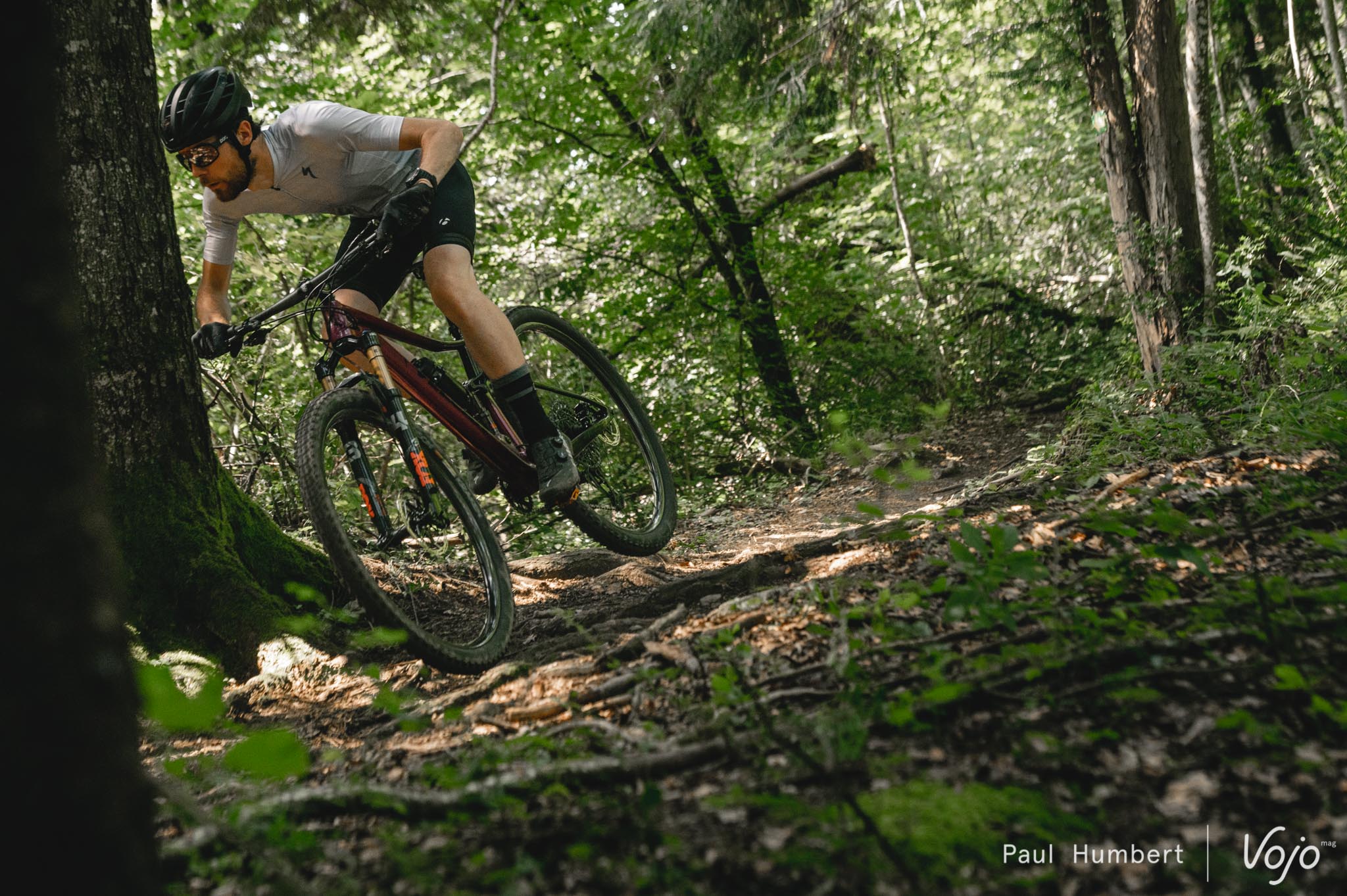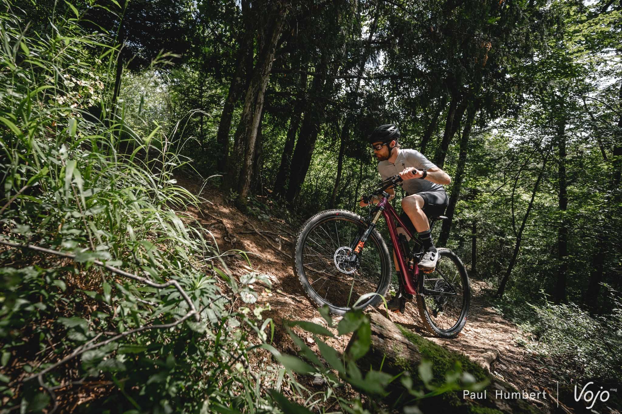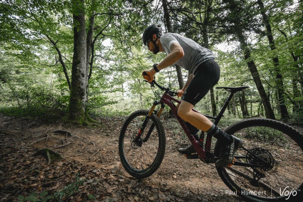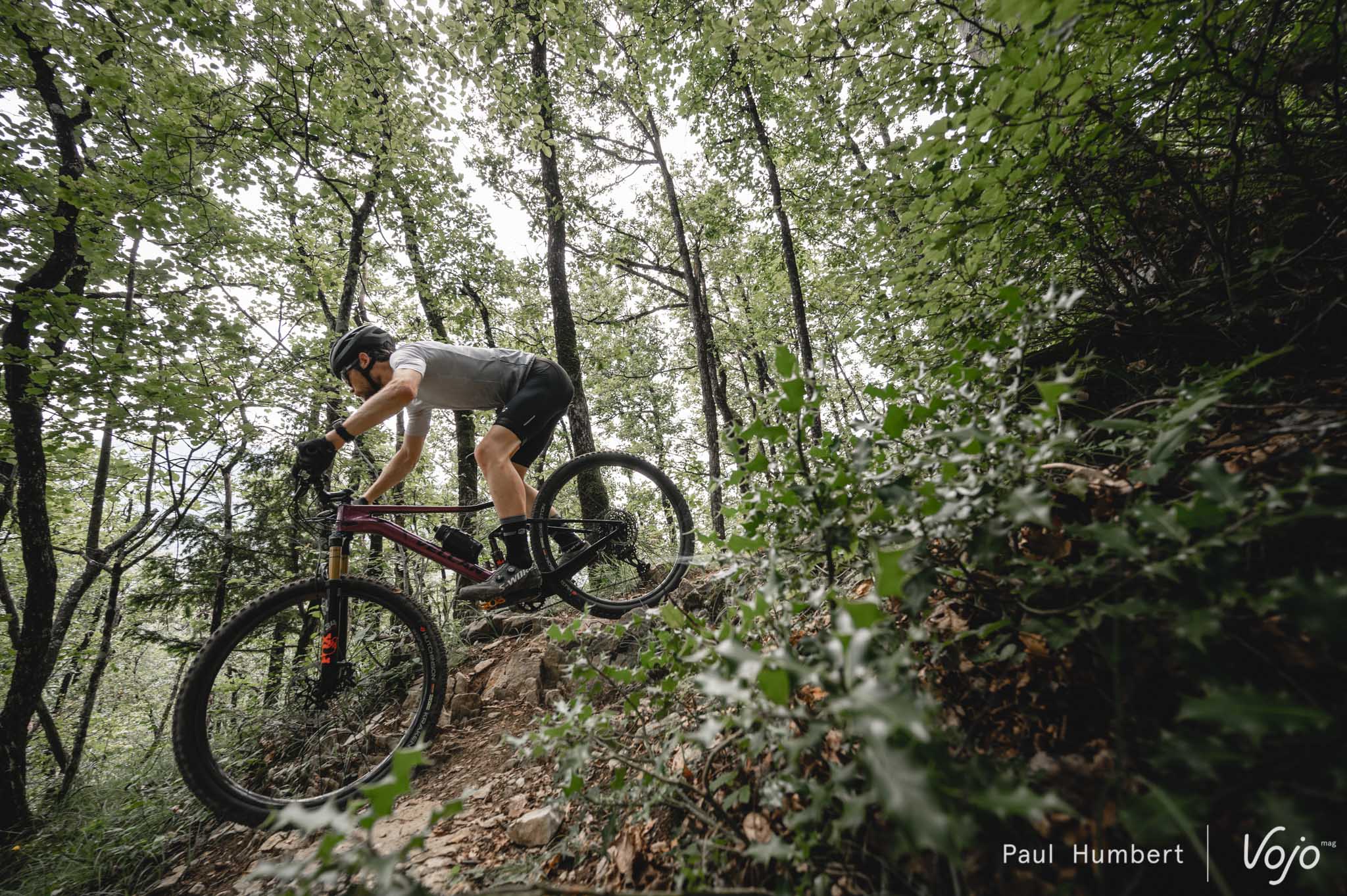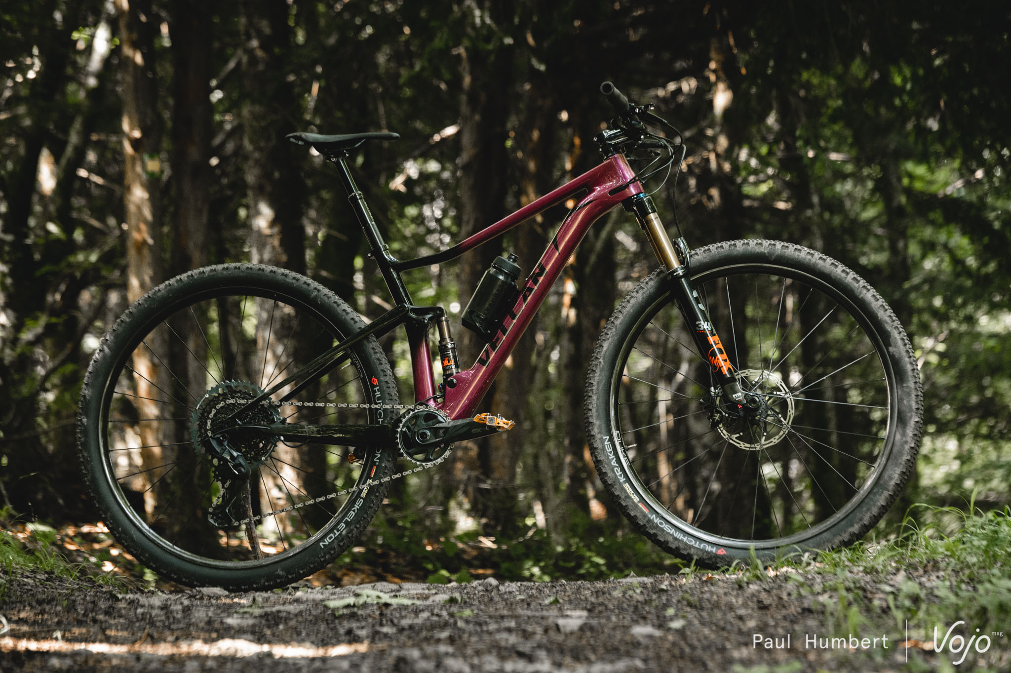 Avec ces changements, le vélo est transfiguré : on y gagne un peu en montée avec le pneu arrière plus polyvalent mais surtout, le comportement en descente n’a rien à voir, on se sent beaucoup mieux et cette fois on peut vraiment s’amuser. Son caractère est digne d’un bon 120 mm, il réagit vite, tient sa trajectoire en courbe, se place n’importe où et n’a plus peur de décoller par-dessus les obstacles. Attention, l’empattement court et la suspension plus orientée support que confort « tapis volant » encouragent un pilotage dynamique, il faut le tenir quand on prend de la vitesse et que ça tape.