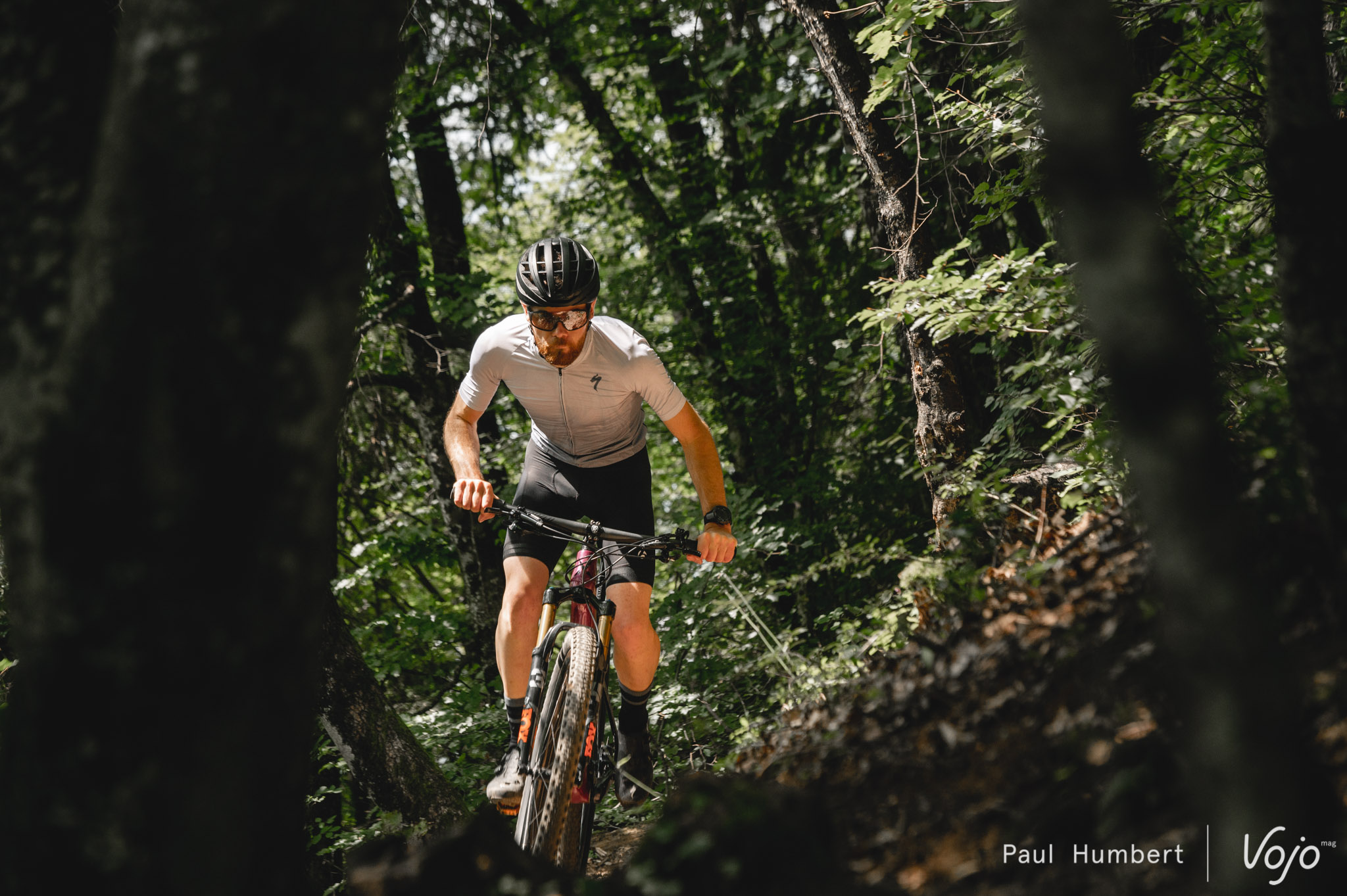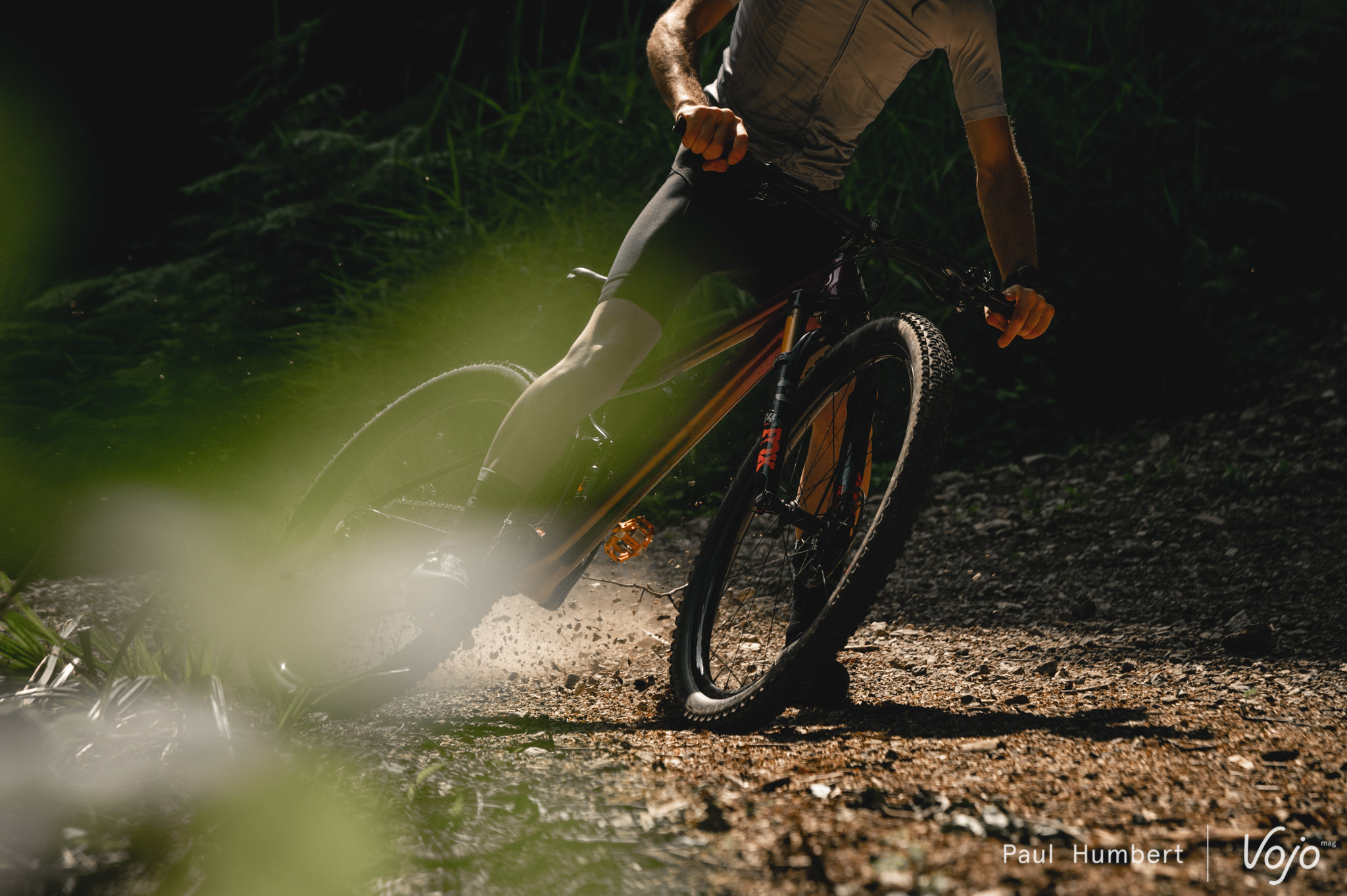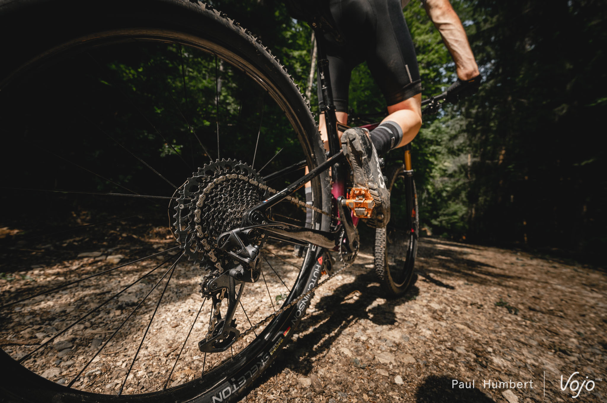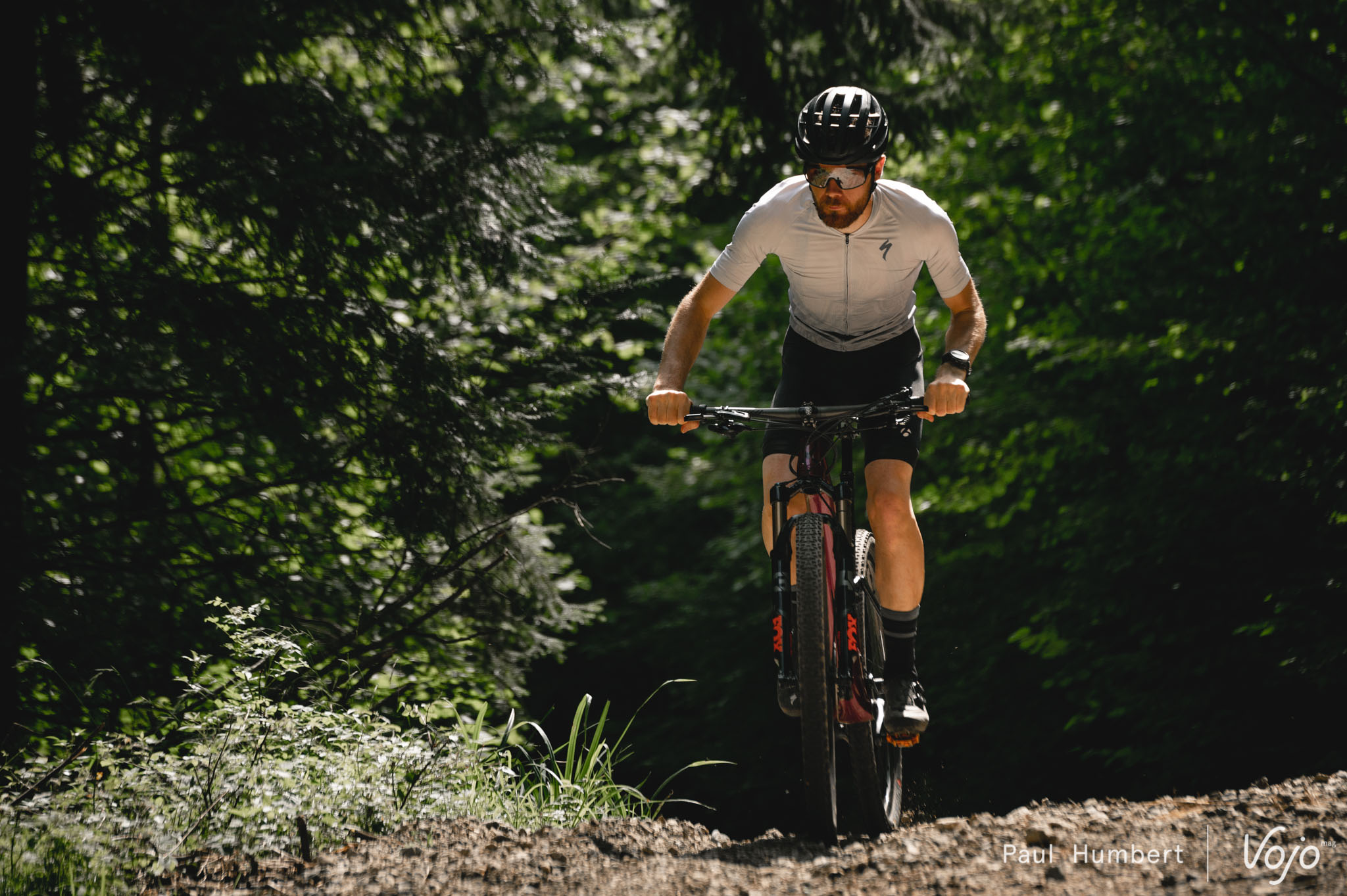 Sans surprise, on en vient à jouer un peu avec les limites des freins. Les Sram Level sont suffisants pour du XCO mais quand ça va au-delà et qu’on prend des descentes plus longues ou plus raides, on sent assez vite qu’on sort de leur zone de confort. Heureusement, le disque de 180 mm à l’avant permet encore de garder un minimum de contrôle et d’endurance.