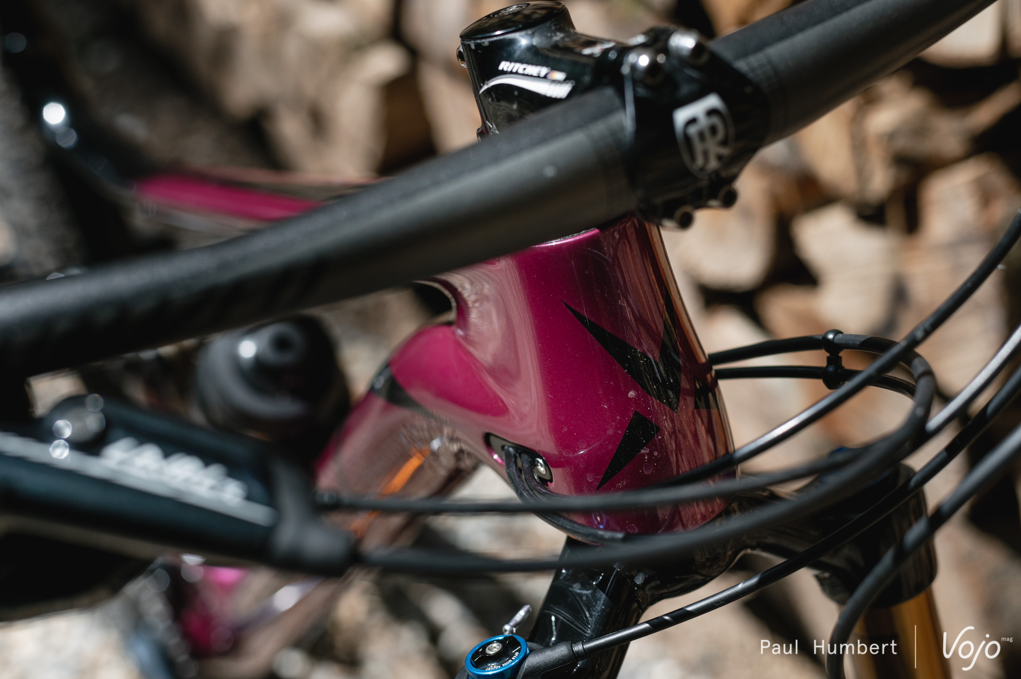 Notre cadre dispose d’une peinture personnalisée, joli assemblage de fuchsia aux reflets métallisés et de noir. Les services de personnalisation proposés par la marque sont très complets et concernent aussi bien la peinture que l’équipement du vélo, c’est l’avantage de tout faire chez soi.
