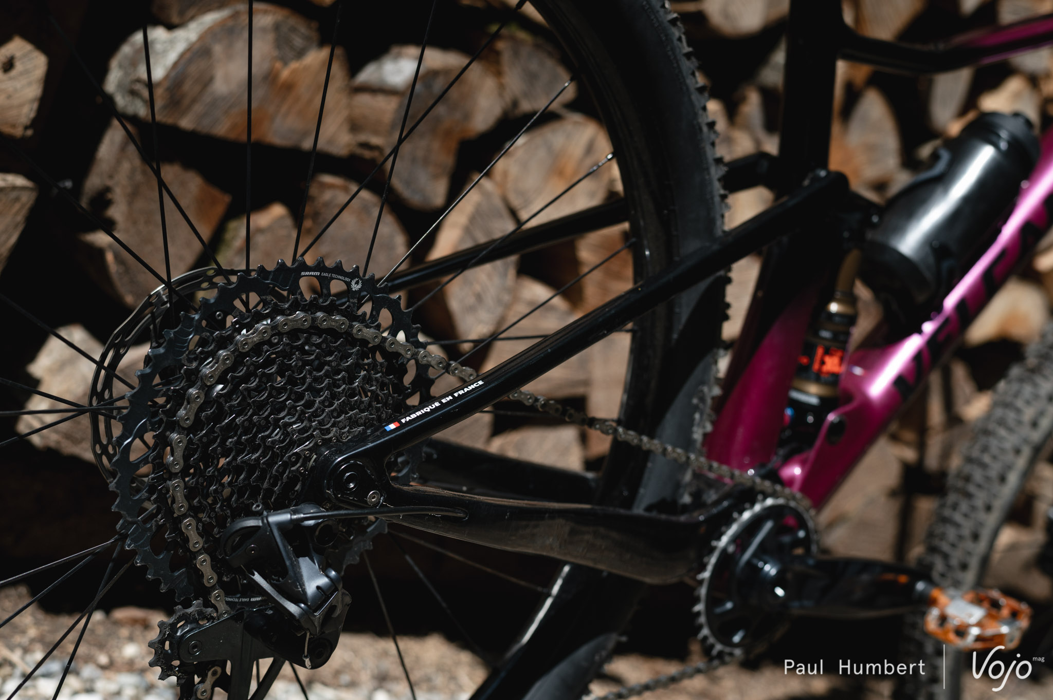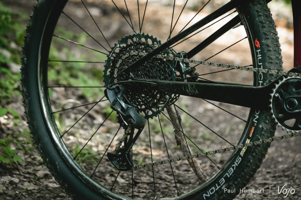 La transmission est un peu moins haut de gamme que les suspensions mais néanmoins parfaitement fonctionnelle, puisqu’on bénéficie d’un groupe complet Sram GX Eagle (mécanique) avec plateau en 32 dents et cassette 10-52. On l’a déjà dit et on le répète ici, le GX Eagle a fait un énorme bond en avant qualitatif lors de sa refonte l’an passé et aujourd’hui, son fonctionnement est très proche d’un X01 Eagle, il est presque impossible de faire la différence en test aveugle.