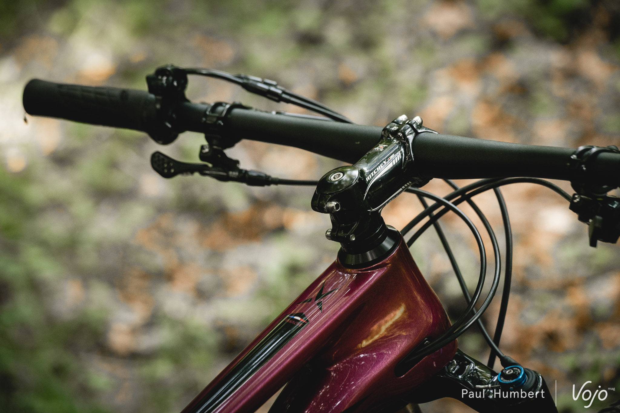 Au niveau des périphériques, on dispose de l’excellente tige de selle BikeYoke Divine SL, 80 mm de débattement pour à peine 400 g en 31,6 mm de diamètre. La selle est une Prologo Scratch et le poste de pilotage est fourni par FSA Afterburner, avec une potence en 90 mm de long et un cintre parfaitement plat, sans upsweep (inclinaison vers le haut).