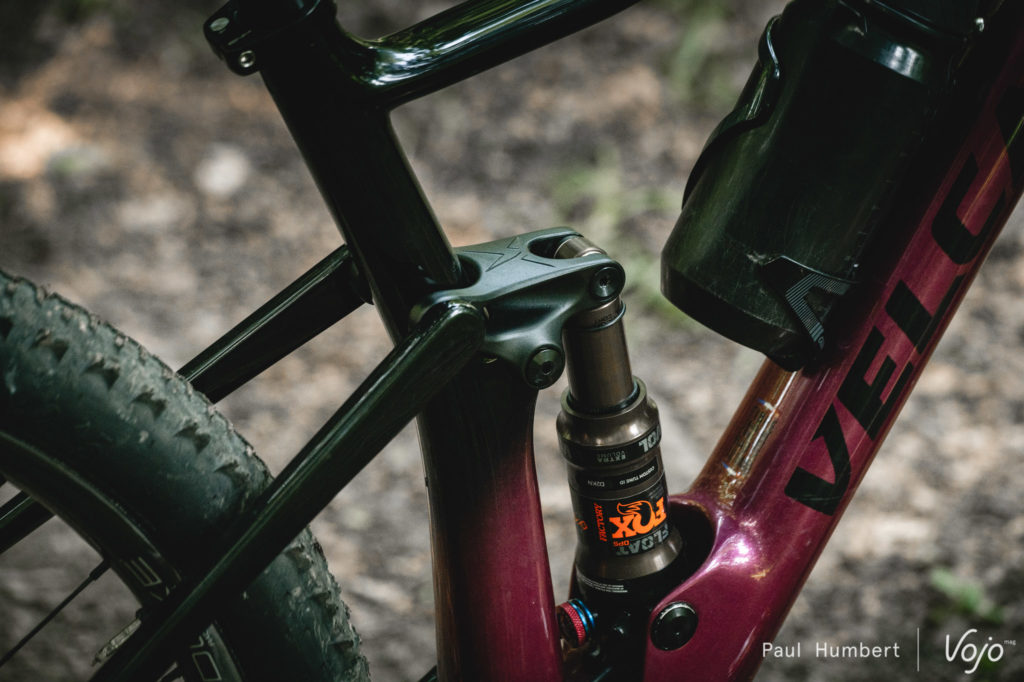 Selon les modèles, Velcan propose des ensembles SR Suntour, RockShox ou Fox, et sur notre vélo de test, ce sont les produits de la marque au renard qui ont été sélectionnés. On retrouve ainsi un Float DPS Factory à l’arrière et une 34 SC Factory (cartouche Fit4, pas de Grip2 en version StepCast) à l’avant, en 120 mm de débattement.