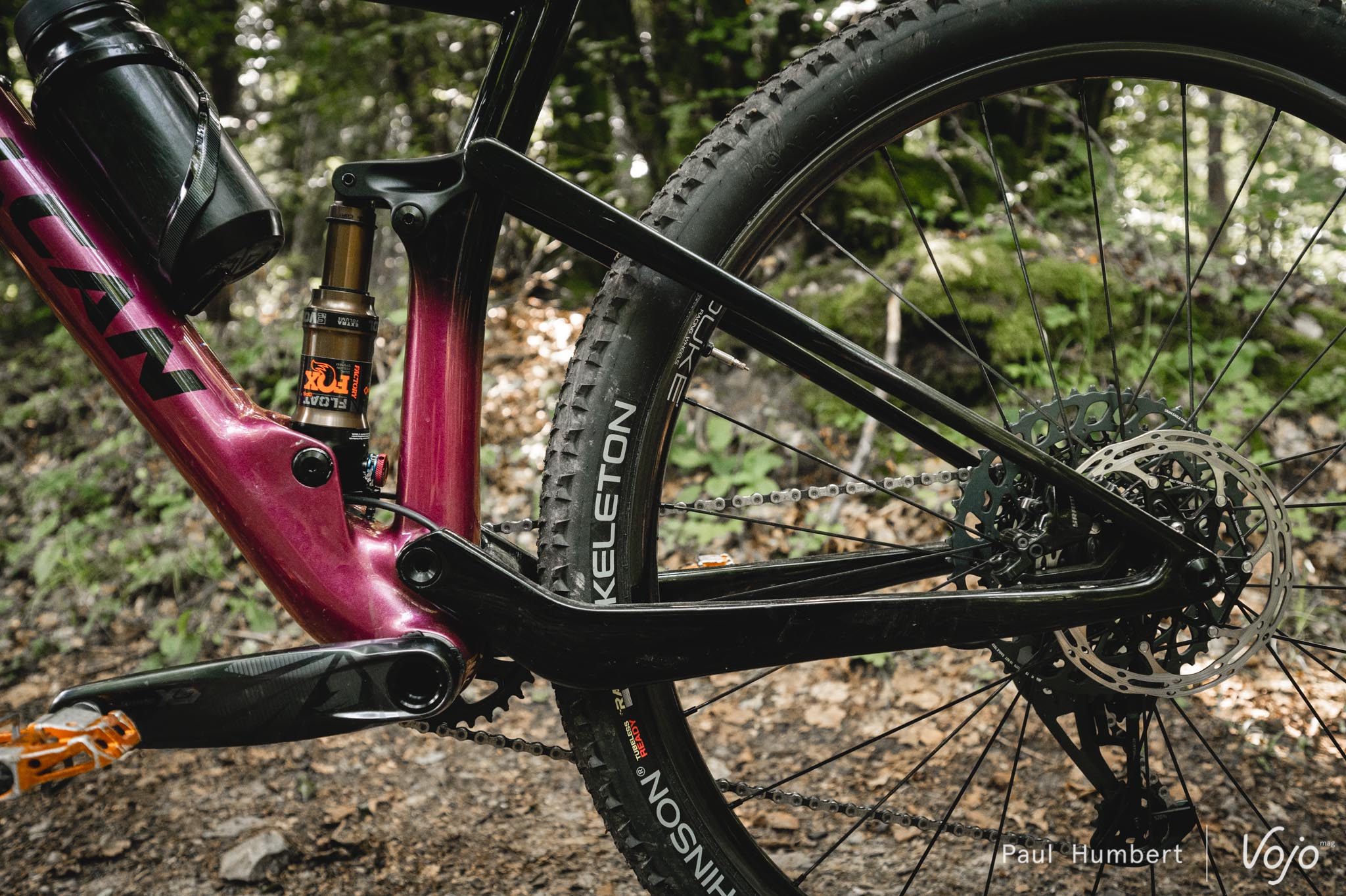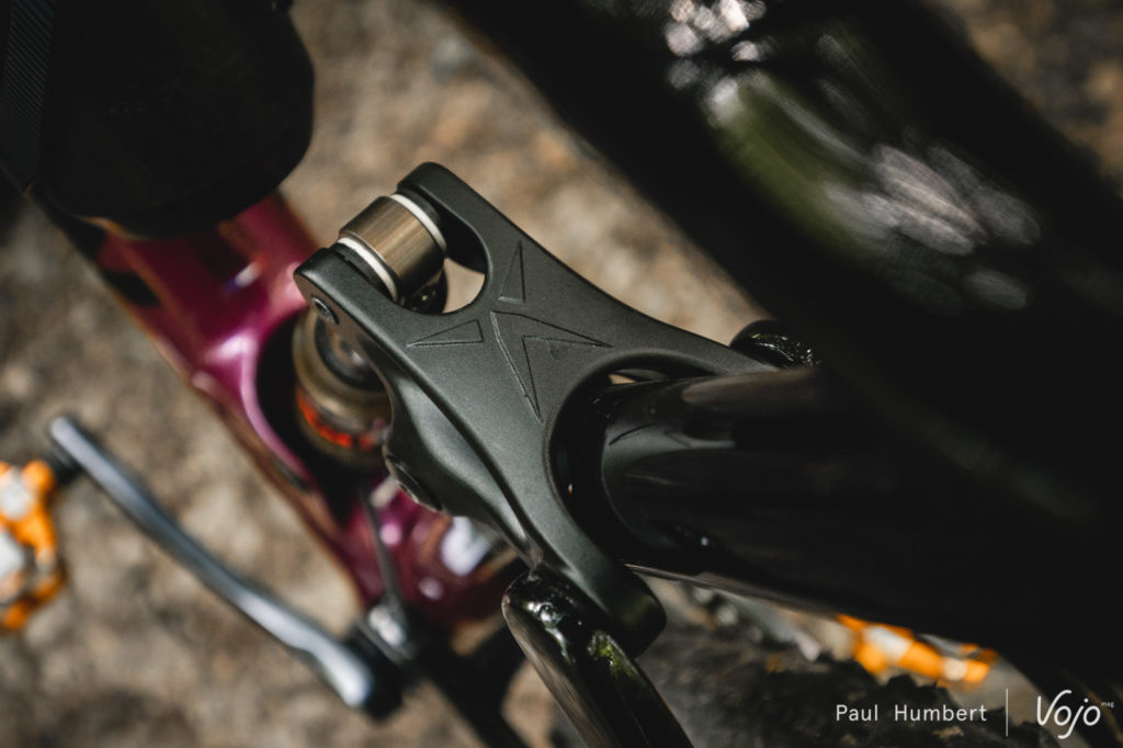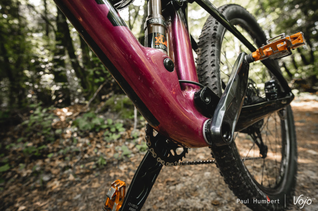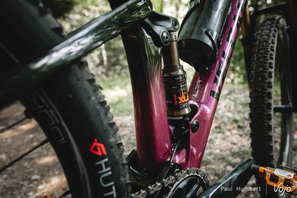 L’amortisseur est positionné le long du tube de selle, tête en bas, ce qui donne au vélo de faux airs de Scott Spark ancienne génération. Un choix qui s’explique entre autres par la quête du poids, puisque l’amortisseur vient prendre appui sur une zone déjà renforcée car elle accueille le boîtier de pédalier et toutes les sollicitations qui vont avec.