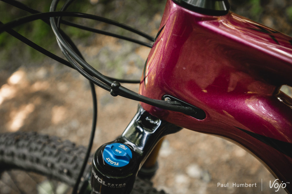 Entièrement en carbone, à l’exception du petit basculeur en aluminium et joliment travaillé, le cadre est annoncé à 1 990 g en taille M. Sans surprise, les gaines et Durits passent en interne dans les tubes, via de classiques entrées au niveau de la douille de direction. Pas de jeu de direction spécial avec ouïes comme chez certaines grandes marques, Velcan a choisi de rester sur un système simple, connu et éprouvé. En revanche, on dispose d’une petite trappe sous l’amortisseur pour faciliter leur remplacement.
