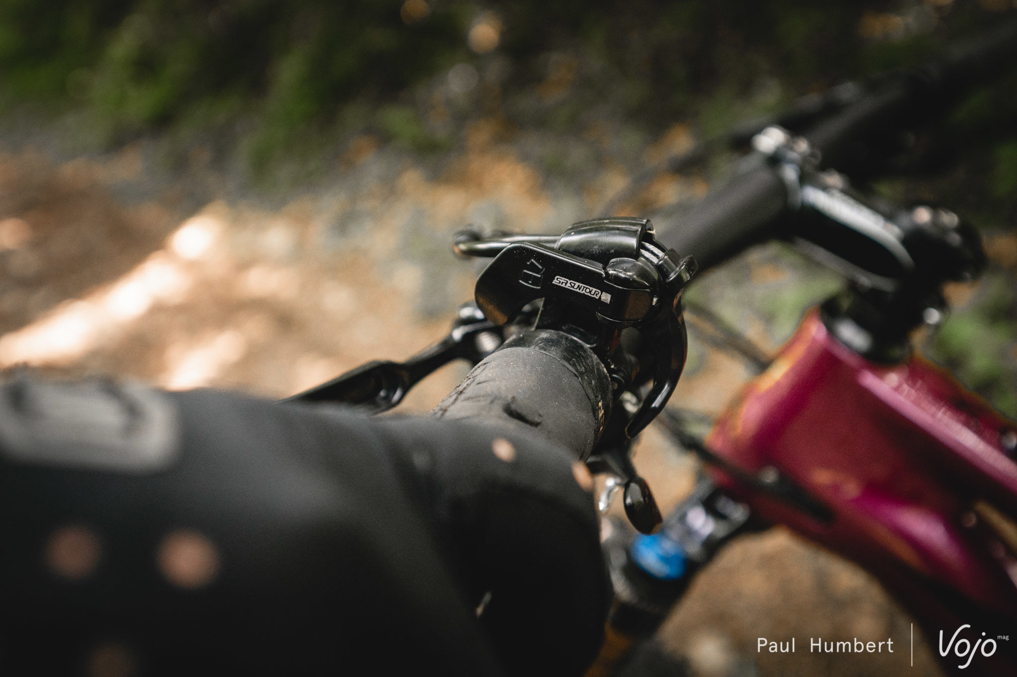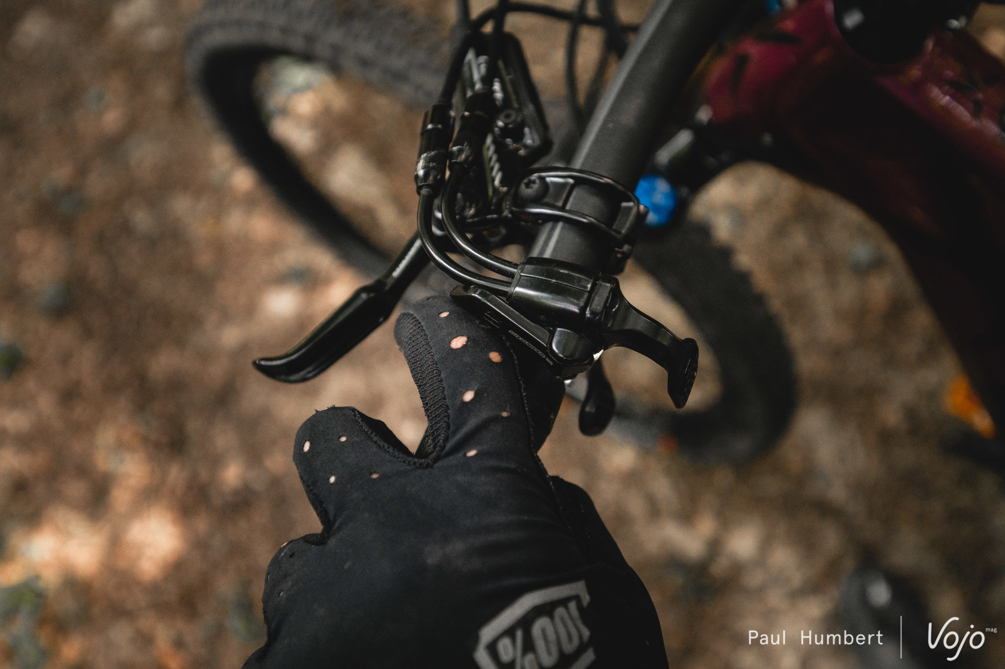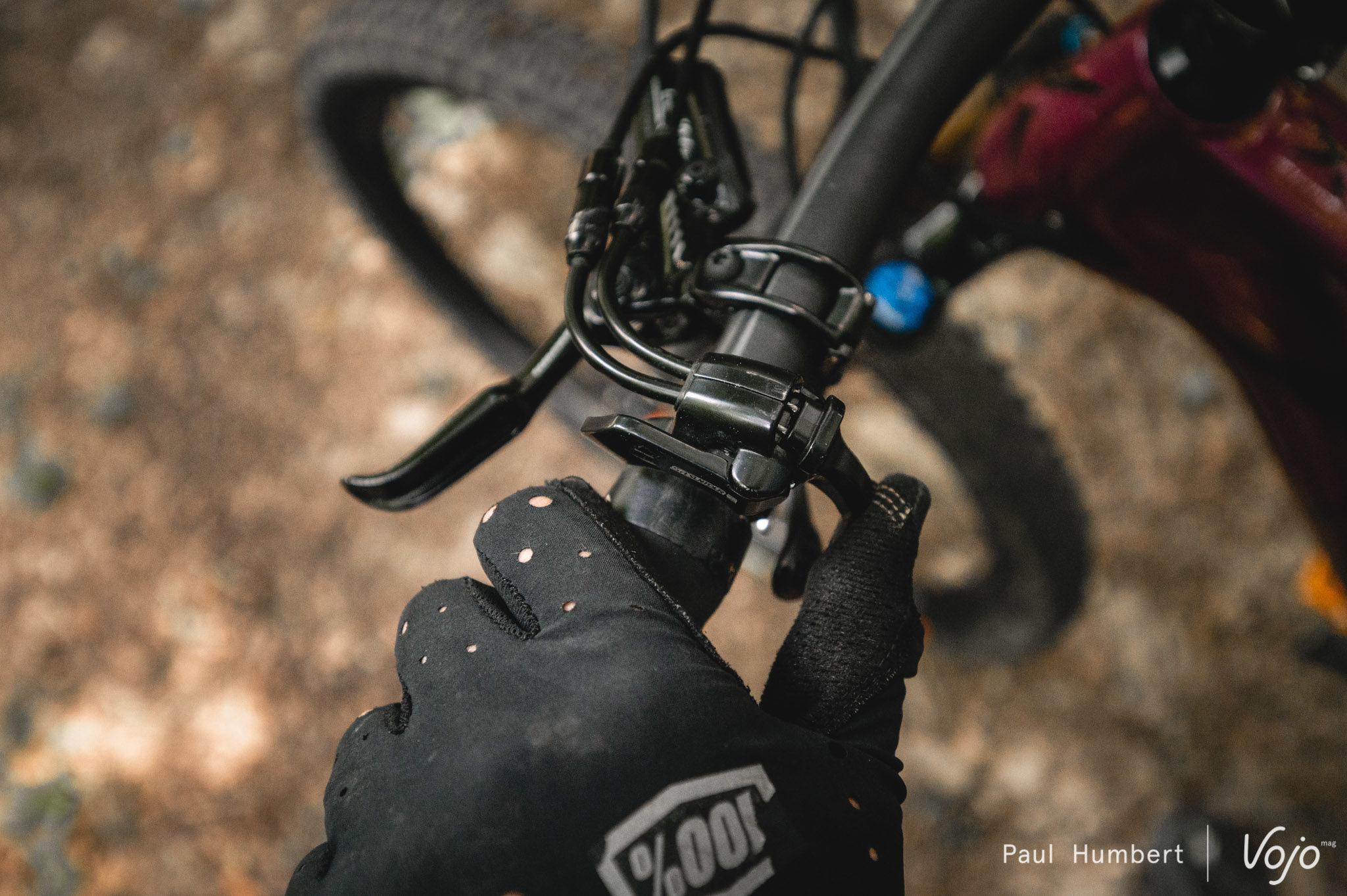 On a déjà parlé des suspensions, ce qui se fait de mieux chez Fox pour cette pratique. Elles sont ici en blocage « inversé », c’est-à-dire qu’elles sont verrouillées lorsque le câble est détendu et ouvertes lorsqu’il est tendu. La manette SR Suntour qui permet de les contrôler est impressionnante de fluidité et de confort mais son principe est un peu particulier.