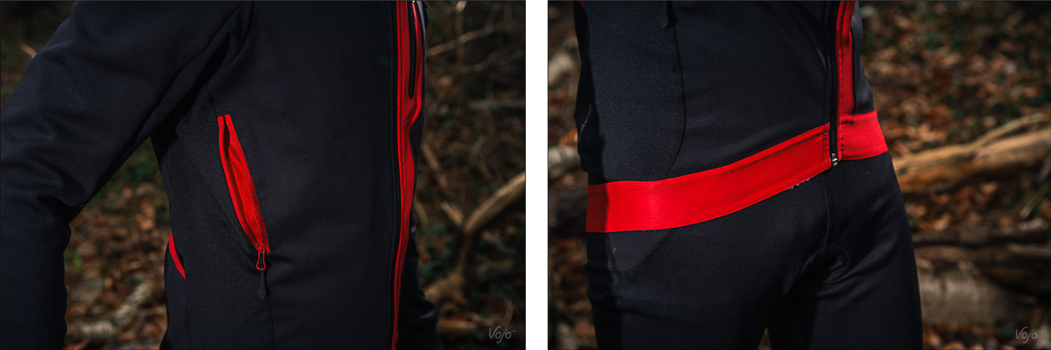 Le blouson compte 4 poches à l’arrière: les 3 classiques et une déperlante avec fermeture éclair pour les objets à ne pas perdre (clés, téléphone portable). On remarque aussi une poche au niveau du coeur, très bien intégrée visuellement et qui est idéale pour placer ce dont on peut avoir besoin lors d’une sortie, comme une barre énergétique ou quelques gels. De part et d’autre, sur les côtés, on trouve également deux zips, mais qui ne donnent pas accès à des poches puisque ce sont des aérations. L’idée est bonne, mais selon nous, elles sont un peu trop petites et surtout mal placées pour être pleinement efficaces. Nous aurions préféré les voir positionnées plus sous les bras. Heureusement, la veste en elle-même, bien que chaude, évacue bien la transpiration. De sorte qu’on n’a jamais l’impression d’être en nage ou d’étouffer dès qu’on fait un effort important. La partie argentée dans le dos, permettant une circulation plus importante de l’air et l’évacuation de la transpiration, est très agréable et joue bien son rôle, même quand on porte un sac à dos (pour peu que celui-ci soit aussi bien aéré).