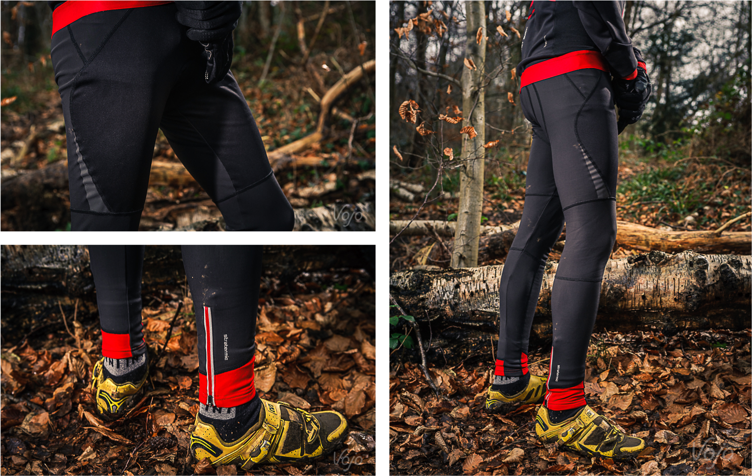 Du côté du cuissard, on trouve également un produit bien pensé, bien que plus classique. Le look est également discret, avec juste une petite touche de rouge sur le bas, qui s’accorde parfaitement avec le blouson. La peau de chamois intégrée peut compter sur des inserts en gel pour se montrer très confortable sans donner l’impression de rouler avec un lange pour bébé. Elle tient aussi très bien en place, ce qui n’est pas toujours le cas sur les cuissards longs. Les matériaux choisis, surtout pour le dessus des cuisses, protègent très bien des projections d’eau et de boue, ainsi qu’en cas de fine pluie.