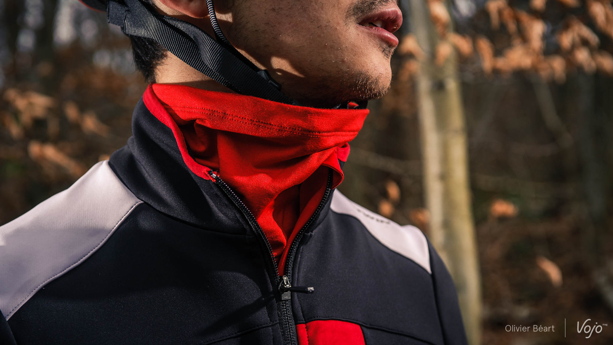 Derniers détails qui achèvent de nous convaincre: BTwin a eu l’excellente idée de prévoir un tour de cou intégré au blouson ! Il est détachable (la fixation se fait par trois petits boutons), mais nous l’avons toujours laissé tant il est doux, chaud et agréable. Au niveau des poignets, de petites extensions rouges viennent aussi compléter les manches pour assurer une transition parfaite avec les gants. Voilà qui montre qu’il y a une vraie recherche et des pratiquants passionnés derrière le développement de ce produit, qui a bien plus que son prix pour convaincre !