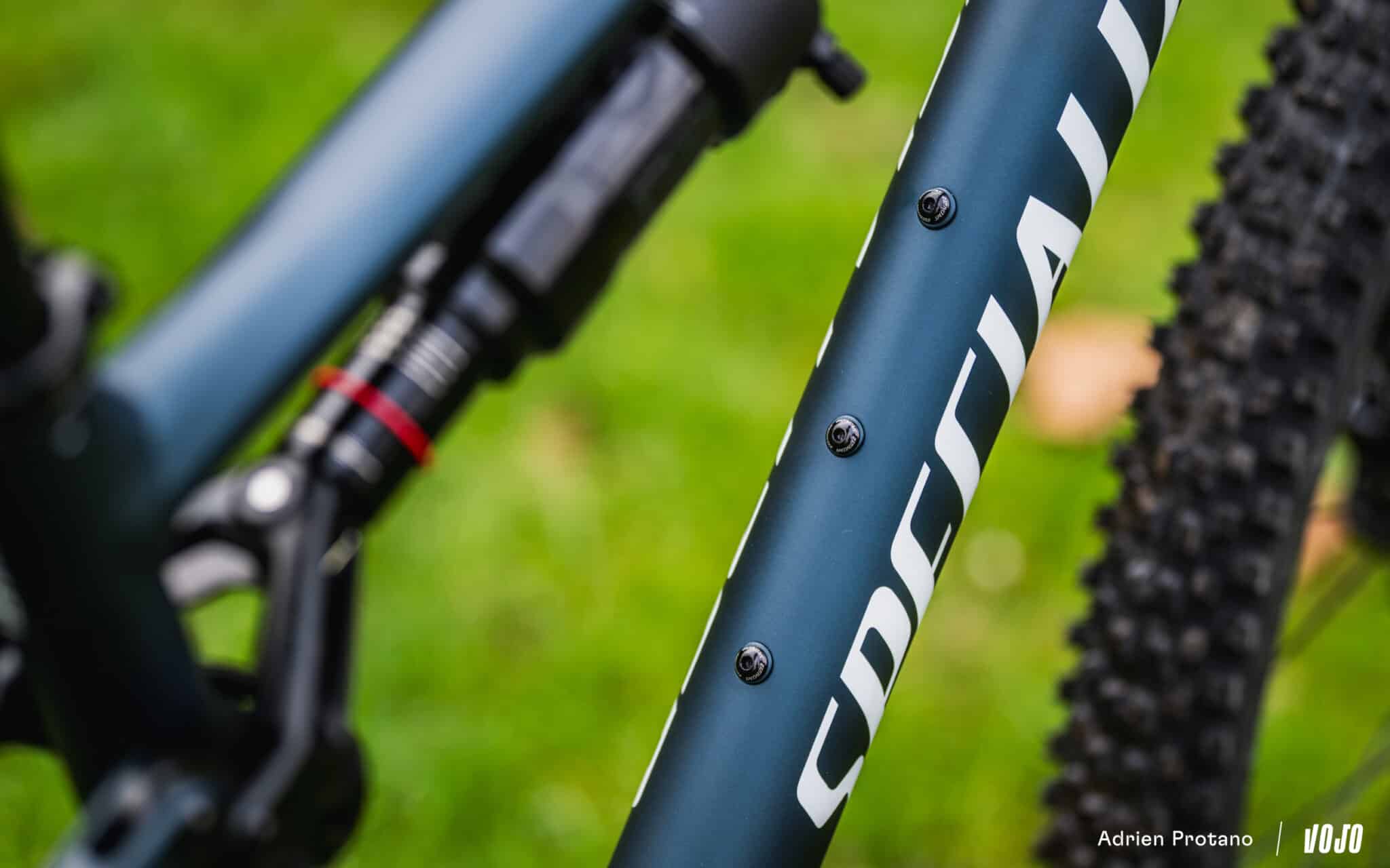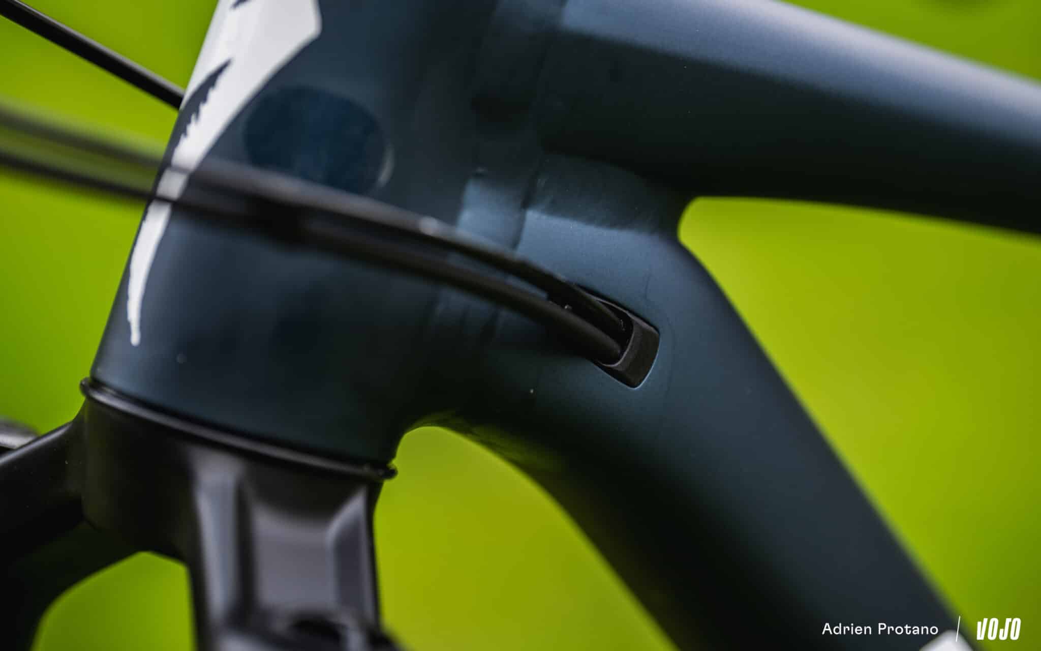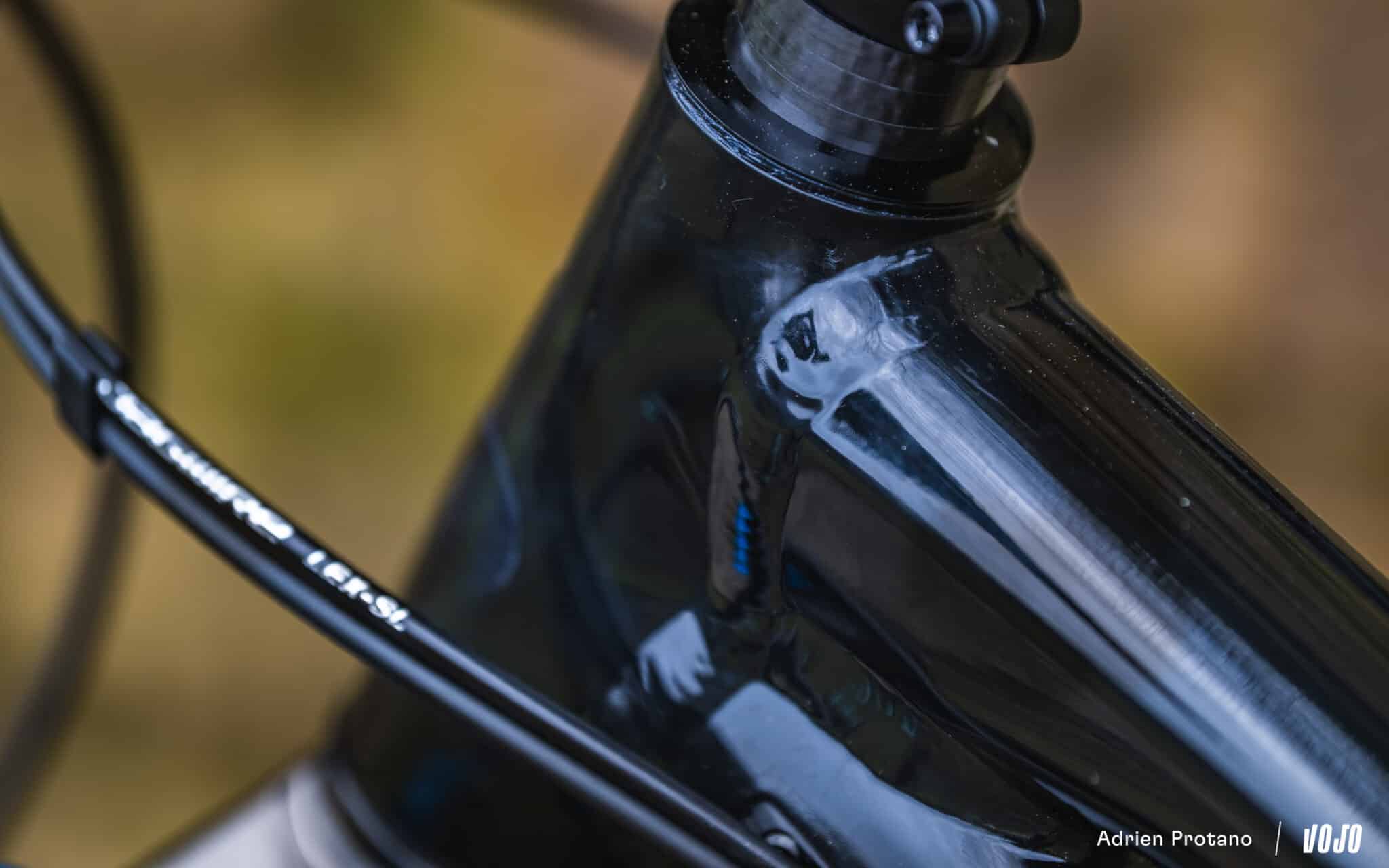 À côté de ça, le cadre du Chisel reste plutôt simple et pragmatique dans sa conception. Pas de fantaisie technique qui viendrait compliquer la vie des utilisateurs, mais pas non plus tous les petits raffinements qu’on trouve sur des modèles plus haut de gamme. On retrouve ainsi des passages de gaines internes, guidés, avec des entrées situées en haut du tube diagonal plutôt qu’au niveau du jeu de direction. Côté pratique, le cadre propose deux supports de porte-bidon, des protections soignées sur les bases et au niveau de la liaison entre triangle avant et arrière, et un boîtier de pédalier fileté— un choix rassurant et facile à entretenir. En revanche, pas de boîte à gants intégrée ni d’inserts supplémentaires pour fixer des accessoires : ici, on va à l’essentiel.