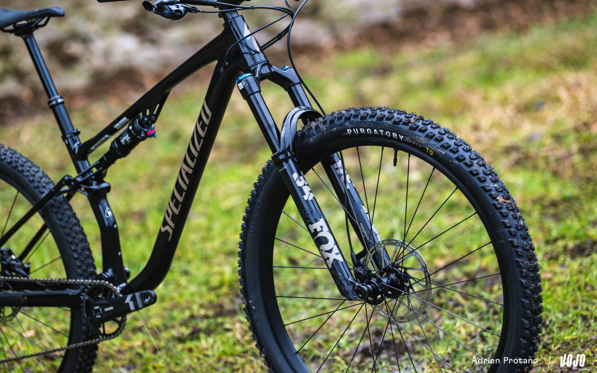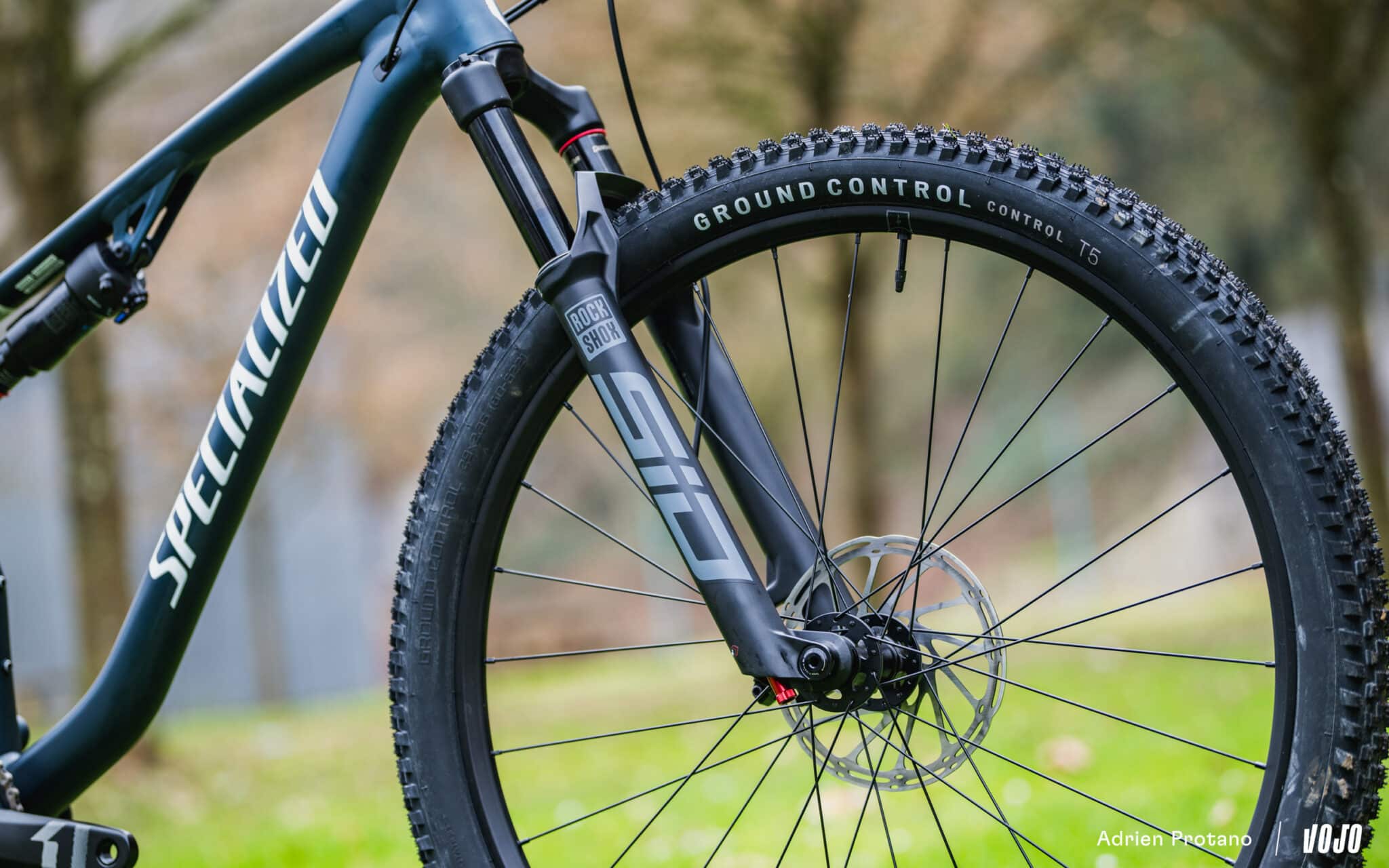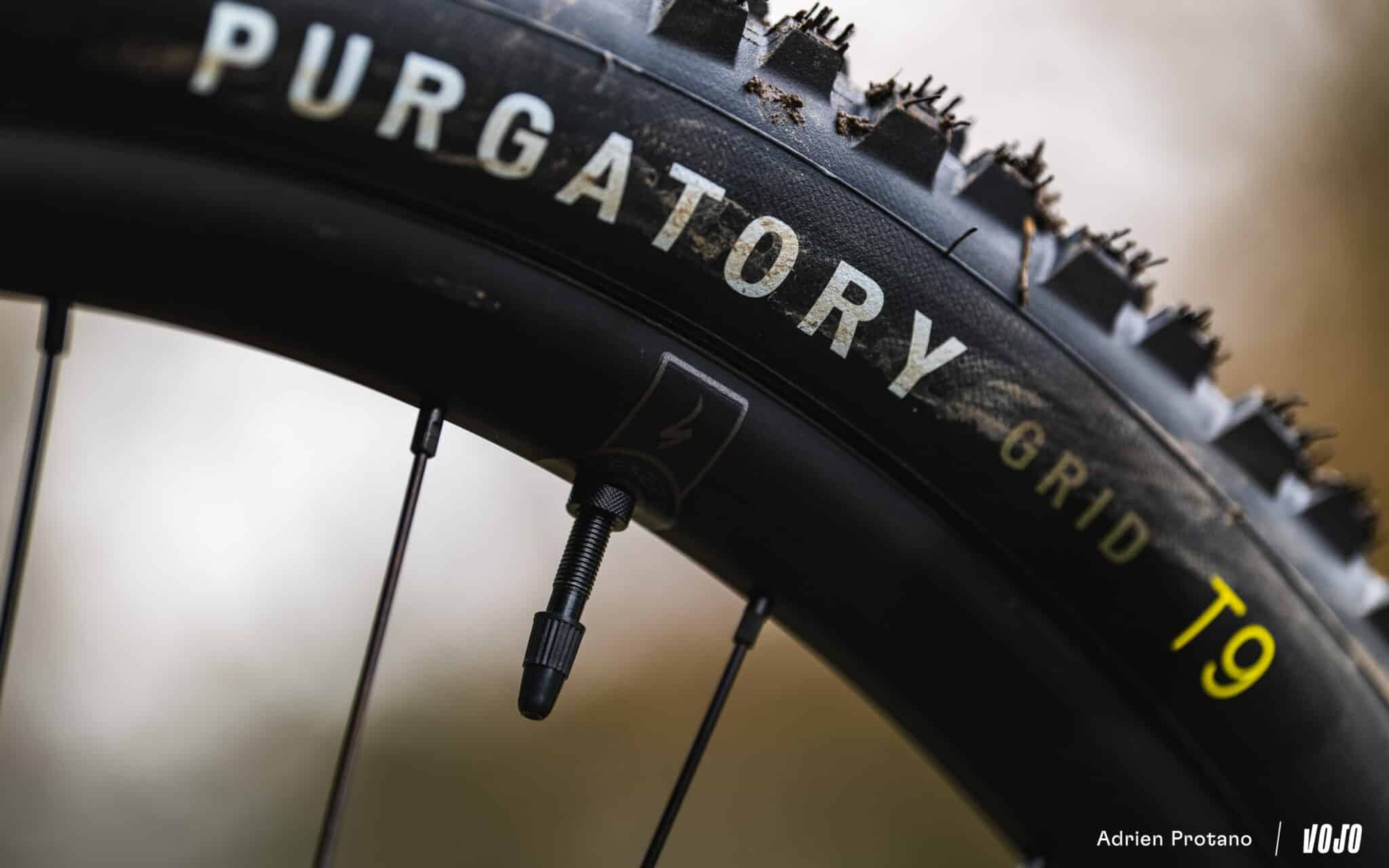 Les roues en aluminium sont maison (largeur interne de 30 mm) et chaussées de pneumatiques Specialized Purgatory (2.4, T9, Grid) à l’avant et Specialized Ground Control (2.35, T7, Grid) à l’arrière.