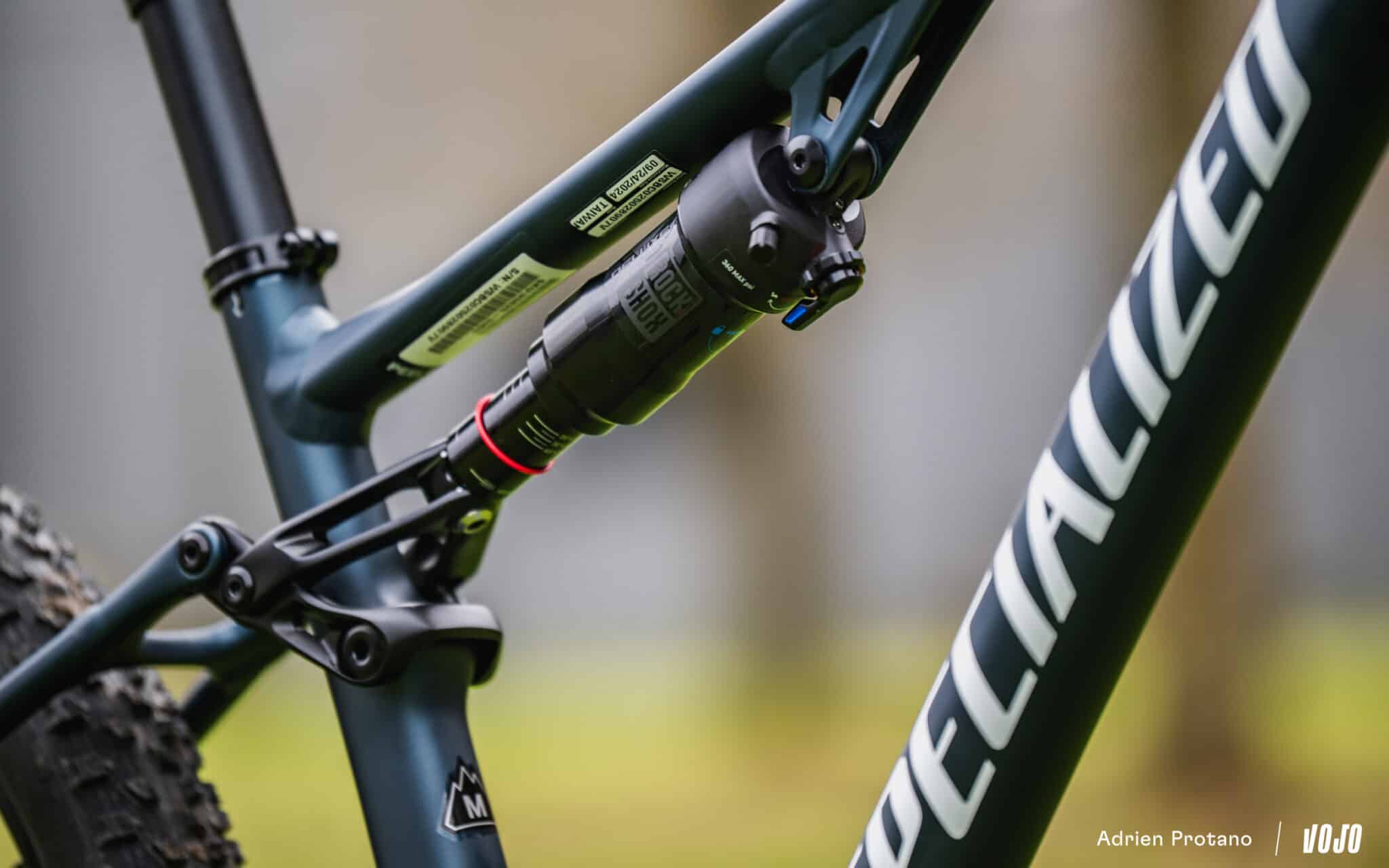 Du classique côté géométrie pour les aspirations sportives et XC de ces deux machines : 66,5° à l’angle de direction, 75,5° pour l’angle de tube de selle, des bases de 437 mm et un reach assez court de 445 mm en taille M. Comme sur l’Epic, on a également un petit flipchip à la fixation de l’amortisseur sur le yoke qui permet de descendre le boîtier de pédalier de 6 mm et de coucher les angles d’environ 0,5°.