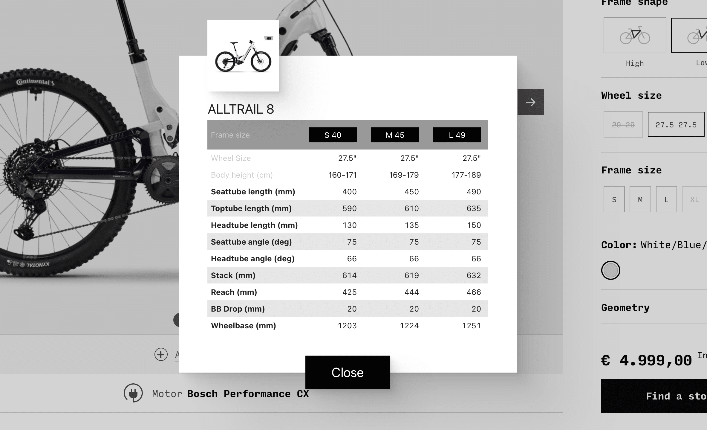 Trois tailles de cadre sont prévues par la marque, pour des pilotes allant de 160 cm jusqu’à 189 cm. La géométrie se caractérise par, en taille M, un reach de 444 mm, un angle de direction de 66° et un angle de tube de selle de 75°.