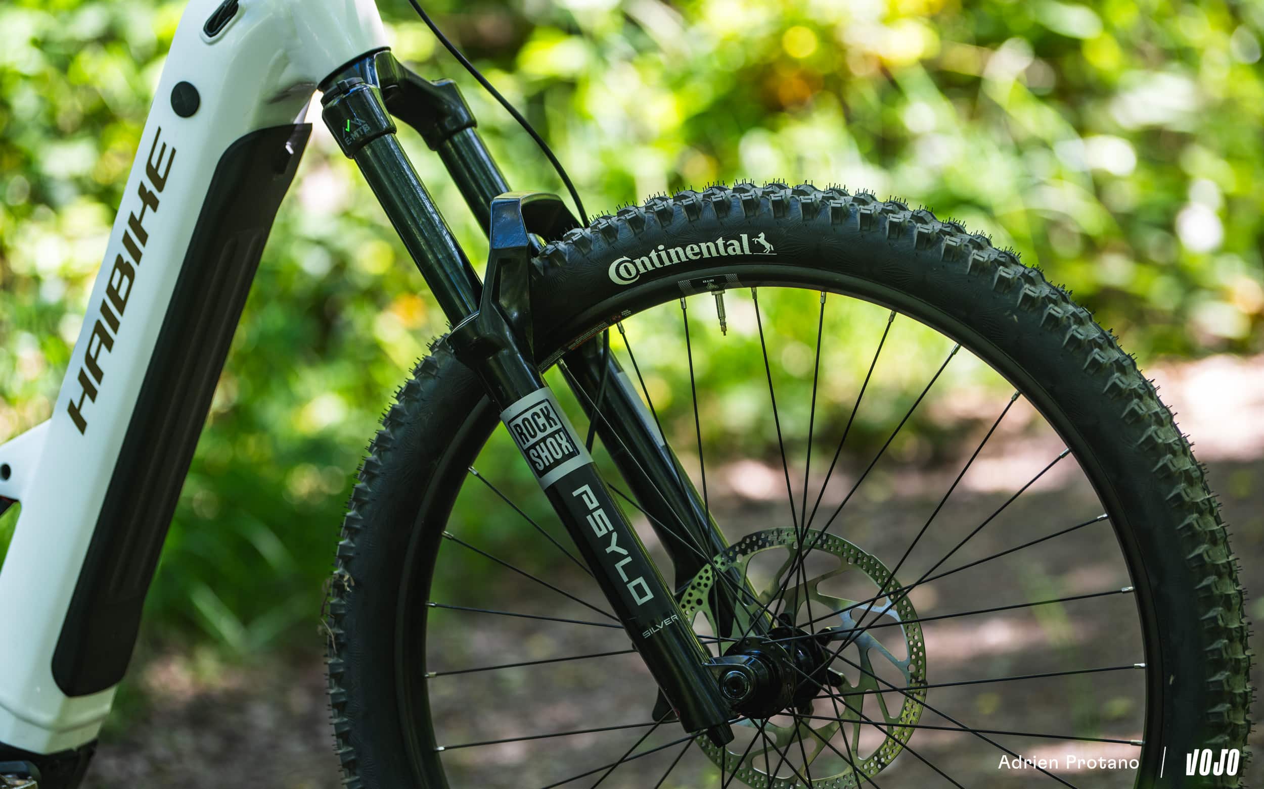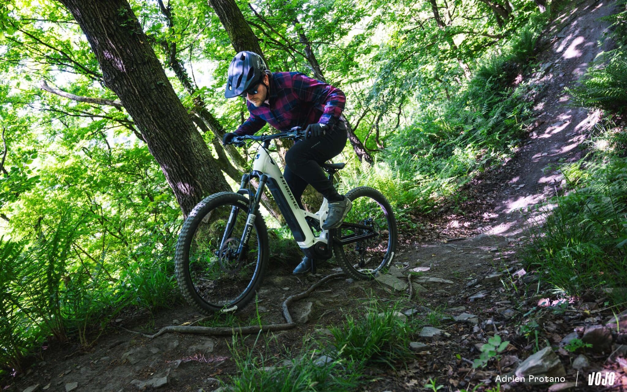 Côté assistance, en usage paisible, on reste en mode Eco ou Tour+, avec une assistance qui se montre douce et discrète tant au niveau de ses réactions qu’au niveau du bruit, tout en se ménageant une excellente autonomie (après 25 km et 400 m de d+ on a à peine usé une barre pour un pilote de 75 kg). On note aussi que les suspensions recueillent des éloges pour leur sensibilité sur les petites irrégularités du sol, et l’arrière a le bon goût d’être très peu sensible au pompage, ce qui permet de garder une bonne assiette et d’éviter les mouvements désagréables quand on pédale. Quant aux pneus Continental, leur grosse section et leurs crampons sont rassurants et procurent une très bonne accroche sans pour autant être trop gourmands en énergie ou occasionner des bruits de roulement trop importants sur sols durs et lisses.