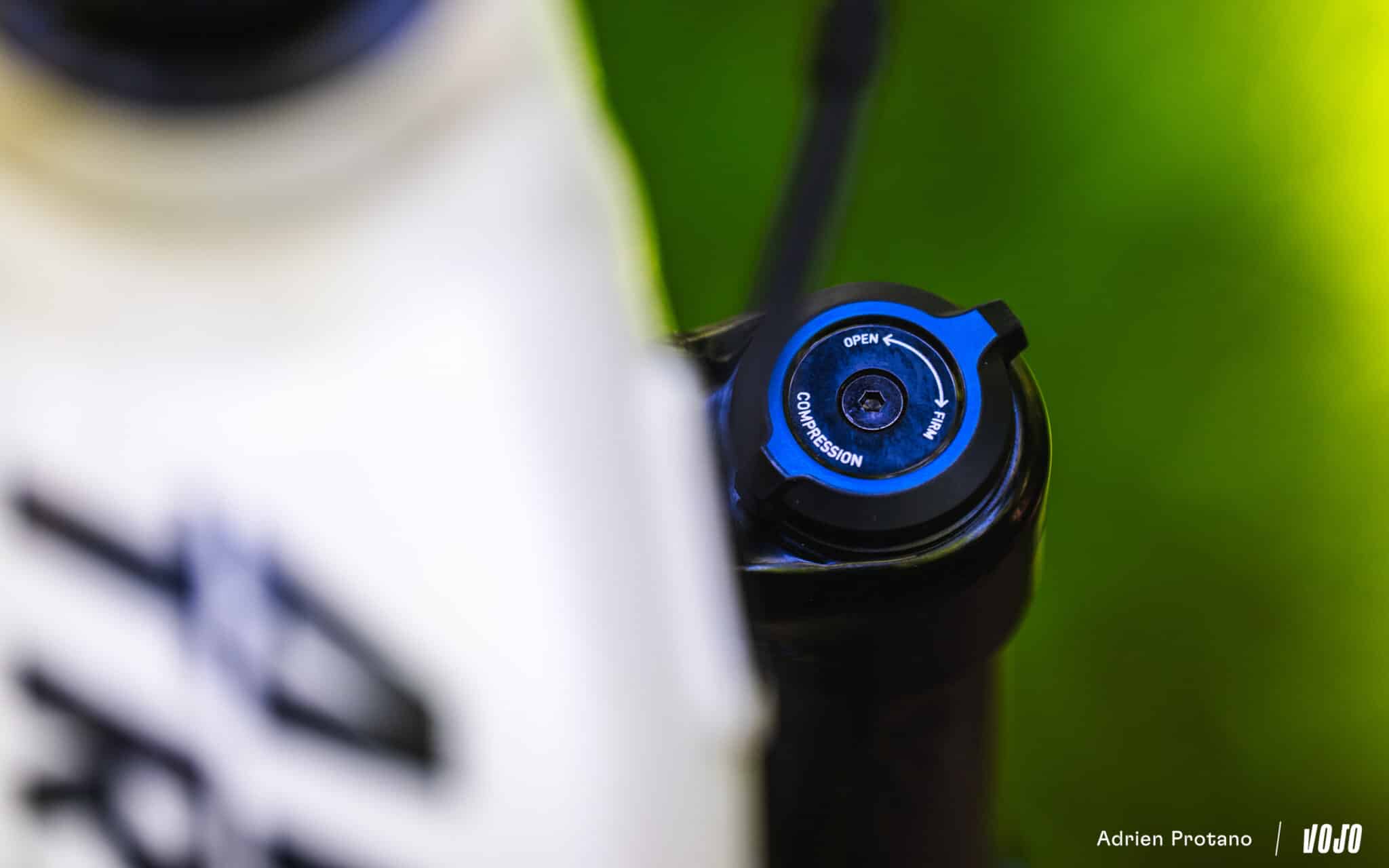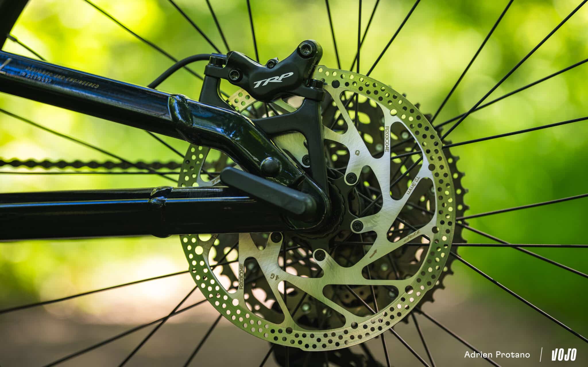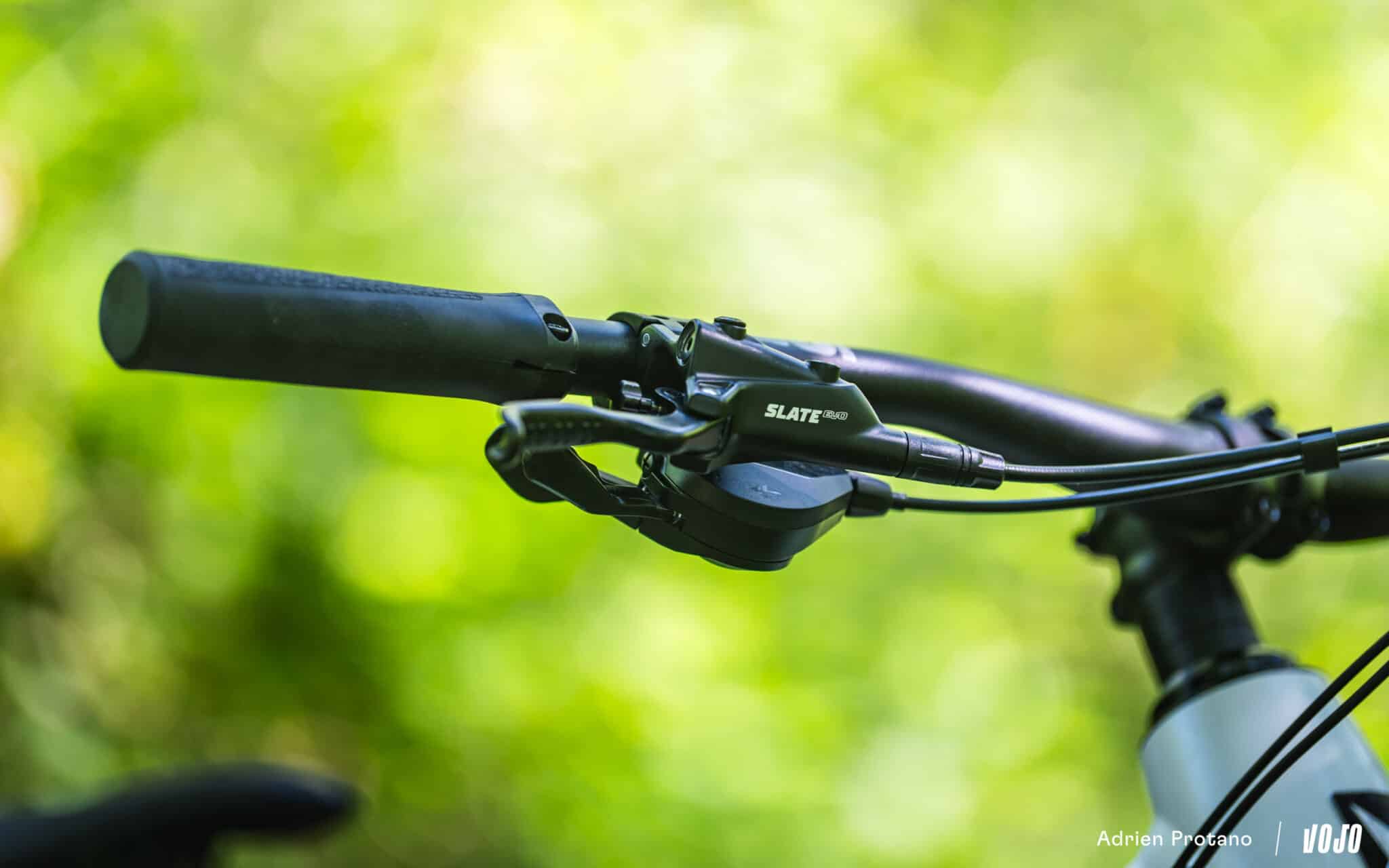Les freins sont des TRP EVO Slate à 4 pistons, associés à des disques de 203 mm. Sur le terrain, ils ont une puissance correcte, mais leur toucher est assez ferme une fois qu’on est au point de contact et ils ne sont pas les plus faciles à doser. Bref, ce n’est pas mauvais, mais pas exceptionnel et Shimano reste selon nous supérieur à ce niveau de gamme.