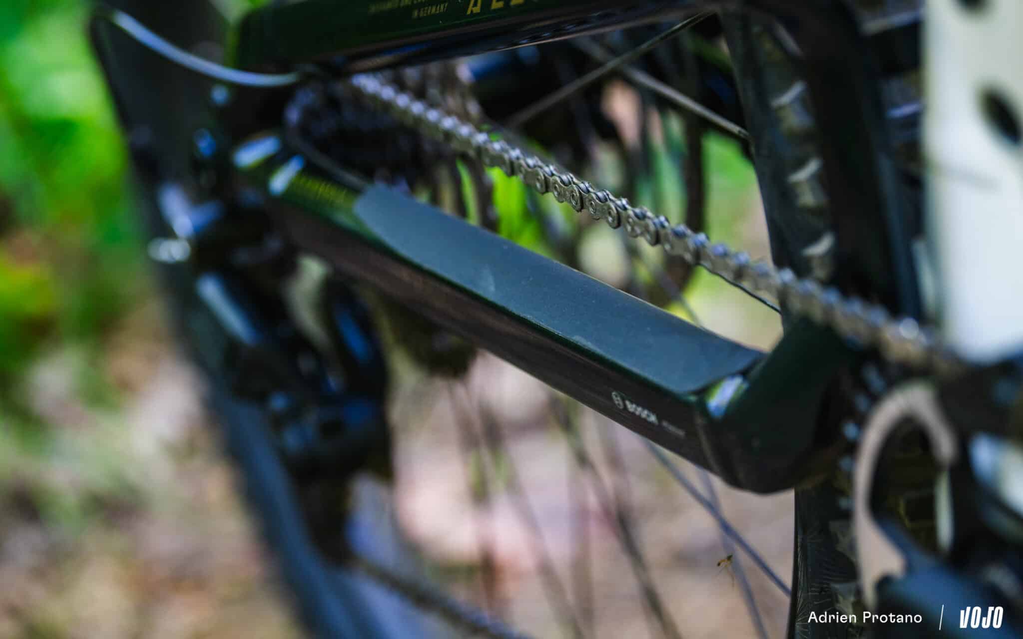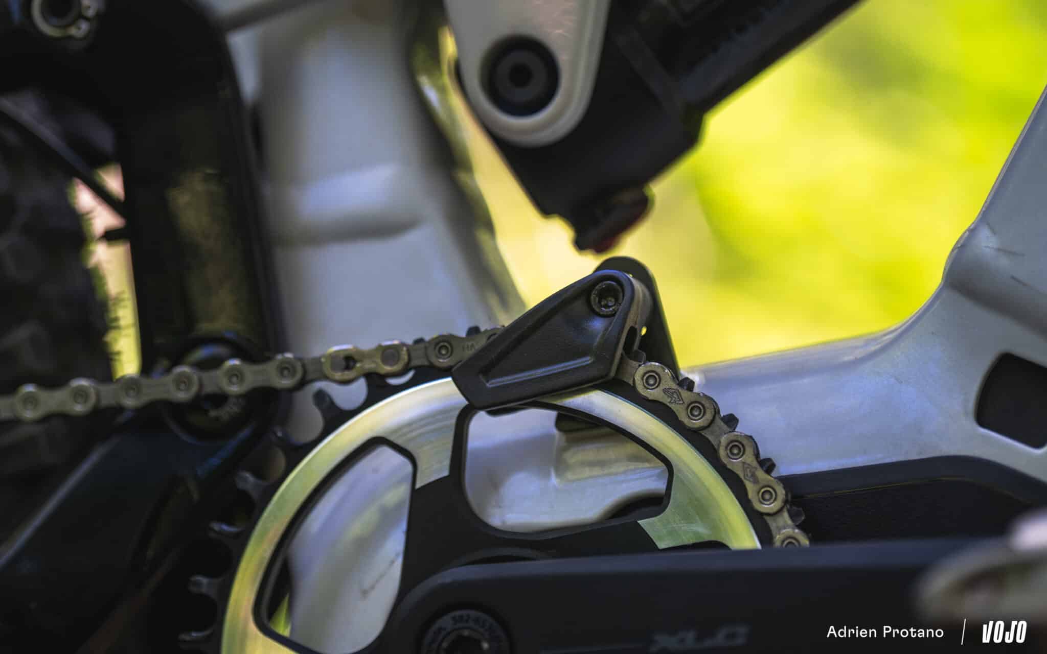 Le vélo est équipé de série d’un petit guide-chaîne ainsi qu’une protection de la base côté transmission.
