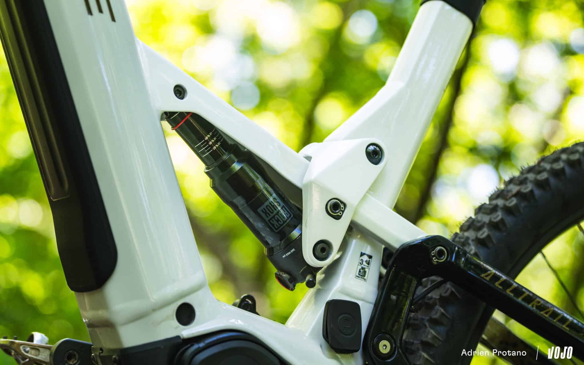 En l’ayant sous les yeux, le look reste atypique, mais l’ensemble est tout de même assez réussi, avec une mention spéciale pour la partie biellette/amortisseur, parfaitement intégrée dans le renfort entre les tubes diagonal et de selle. Par contre, le tube diagonal est très imposant, mais c’est difficile à éviter sur ce genre d’architecture de cadre. En se posant aux commandes, la position est (sans surprise) assez redressée, mais on retrouve des points d’appui similaires à ceux de beaucoup de VTT all-mountain classiques. Le reach est tout de même assez court et, même si la marque annonce 66° d’angle à la douille de direction, l’avant paraît assez fermé.