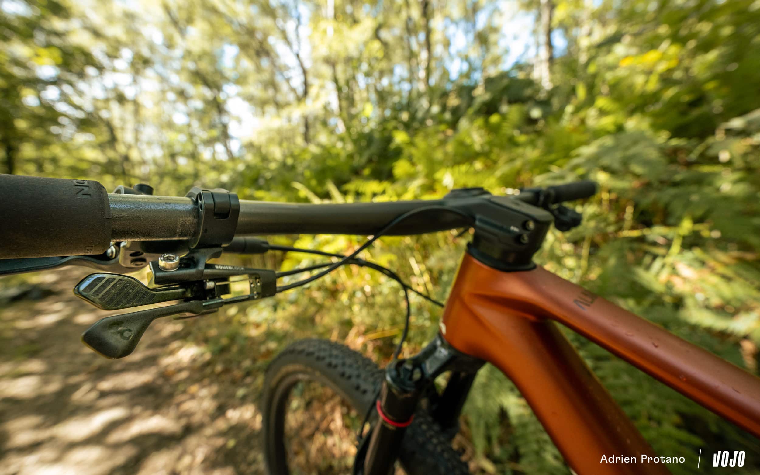 Côté transmission, le Sram GX AXS se montre irréprochable : précis, fluide, fiable, bref, un vrai allié pour rouler sereinement, même lorsqu’on change les rapports sous la contrainte. Les freins, en revanche, nous ont laissés plus mitigés. Ils ont le mordant suffisant, mais le toucher au levier manque un peu de raffinement et donne une impression de plastique brut.