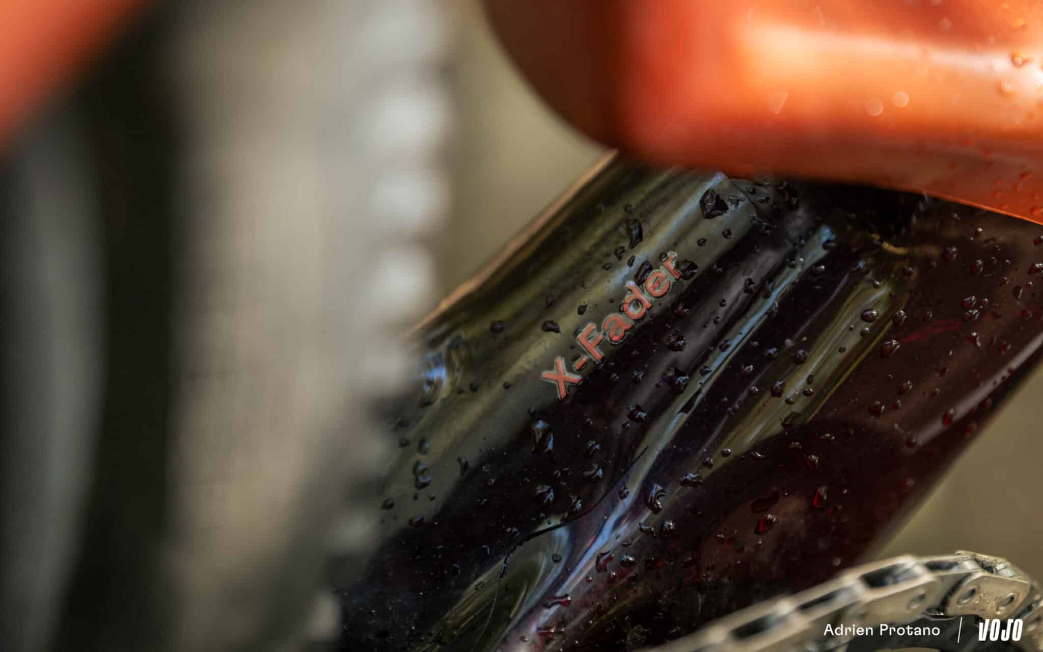 C’est ici aussi qu’intervient ce qu’Orbea appelle le X-Fader, à savoir ce tube de selle sous forme de virgule. Ce design donne une forme particulière au tube de selle dans sa partie basse pour venir se connecter non pas au boîtier de pédalier, mais au bas du tube diagonal.