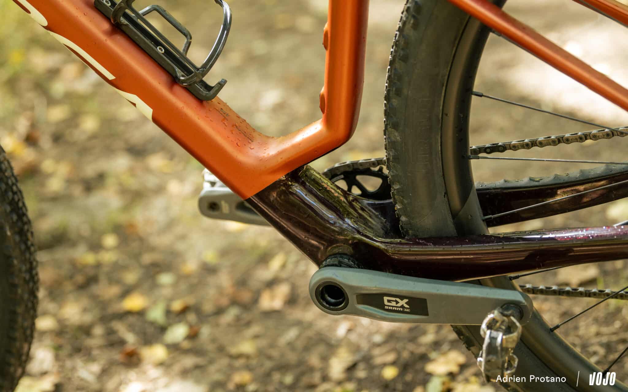 Côté transmission, le Sram GX AXS se montre irréprochable : précis, fluide, fiable, bref, un vrai allié pour rouler sereinement, même lorsqu’on change les rapports sous la contrainte. Les freins, en revanche, nous ont laissés plus mitigés. Ils ont le mordant suffisant, mais le toucher au levier manque un peu de raffinement et donne une impression de plastique brut.