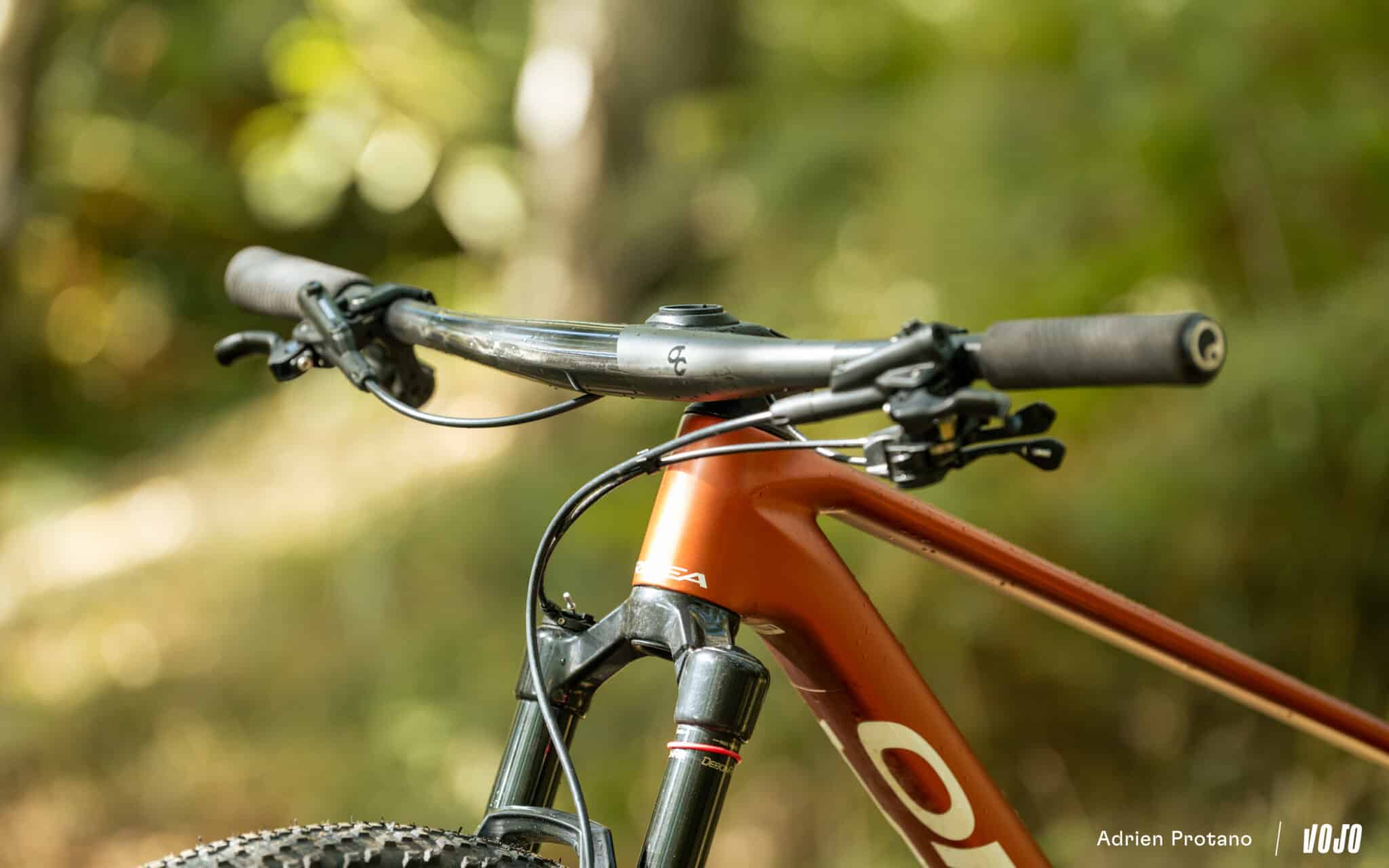 Toujours dans les composants OC, Orbea propose une commande sous le cintre dotée de deux leviers seulement. Elle permet d’actionner à la fois le blocage de la fourche, via un système « push-pull » simple et intuitif, et la tige de selle télescopique. Résultat : un poste de pilotage épuré et fonctionnel.
