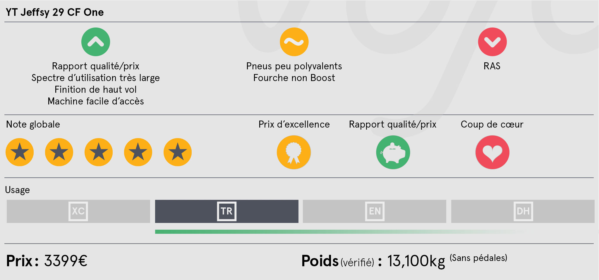 On pourrait apposer les stickers d’une grande marque sur ce Jeffsy et gonfler son tarif, on n’y verrait que du feu tant ce vélo est une réussite. Avec un rapport qualité/prix particulièrement intéressant et de nombreuses options de montage, ce YT Jeffsy est une superbe surprise sur les sentiers. Au-delà de la fiche technique, c’est au pédalage, pendant de longues sorties, sur des sauts et à fond dans les plus beau singles que l’on découvre le Jeffsy. Il est difficile de lui trouver un gros défaut, à part celui de nous donner envie de rouler toujours plus. Et au final, c’est un authentique coup de coeur pour ce qui est sans aucun doute un des meilleurs vélos que nous ayons essayés à ce jour !