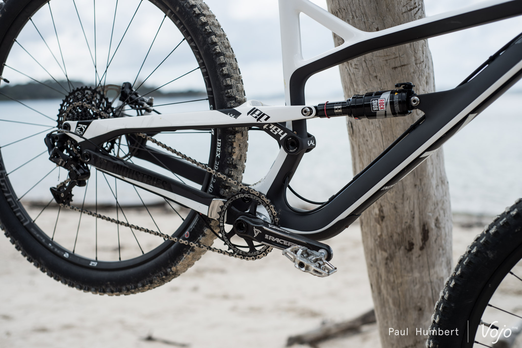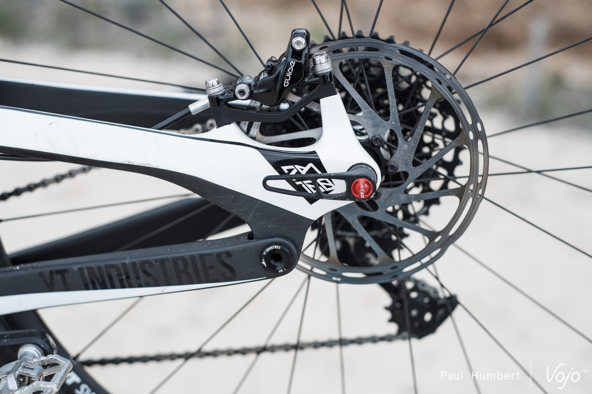 Avant de rentrer dans les détails de la bête, nous avons pris un instant pour demander son avis un pilote de la marque : Bryan Regnier. Le Français a le YT Jeffsy 29 et le Jeffsy 27,5 dans son garage aux côtés du Capra, tout comme la liberté d’utiliser l’un où l’autre : «Je viens de monter mon Jeffsy 29 avec une Fox 36 et un Fox Float X2, ça devient vraiment un vélo d’enduro. Chez moi, c’est très rocailleux et le 29 pouces aide pas mal. J’aime aussi ce type de pilotage. Le Jeffsy 27 est encore plus capable et j’ai tendance à le prendre quand je vais sur des sorties en montagne. Il y a plus débattement et je sais que certaines personnes ne veulent pas des roues de 29 pouces. J’ai fait tous mes tests avec le Capra que je connais par coeur alors c’est avec lui que je roule sur les courses engagées (comme en Tasmanie), mais il faudrait que je passe plus de temps sur le Jeffsy 27 qui est un peu plus léger et peut-être un peu plus joueur et facile dans les singles étriqués. Aujourd’hui, en course, mon choix va soit au Jeffsy 29, soit vers le Capra. Mais si je ne devais avoir qu’un vélo, peut-être que ça serait un Jeffsy 27. Pour les gens qui se posent la question, tout dépend du terrain ! »