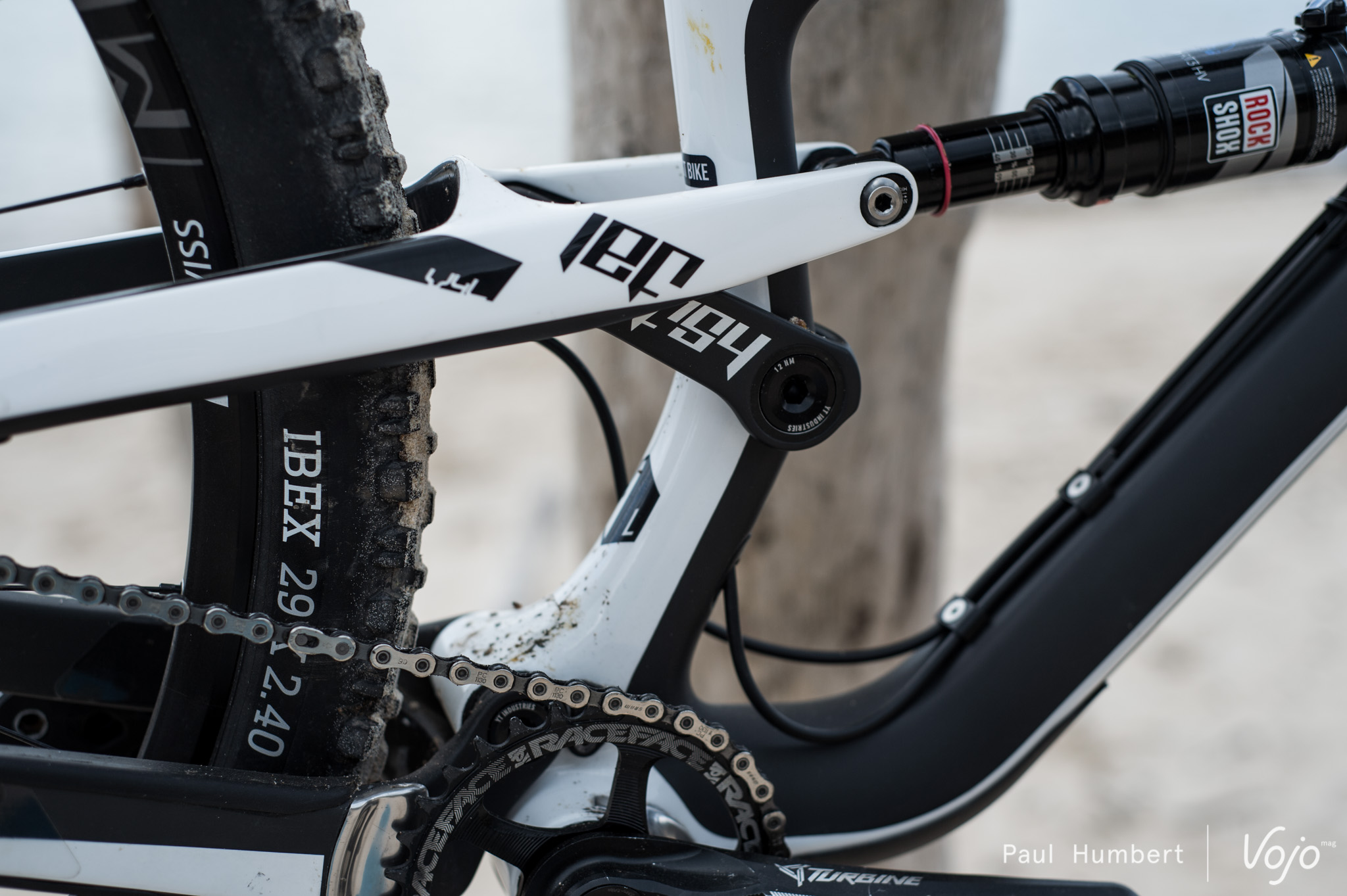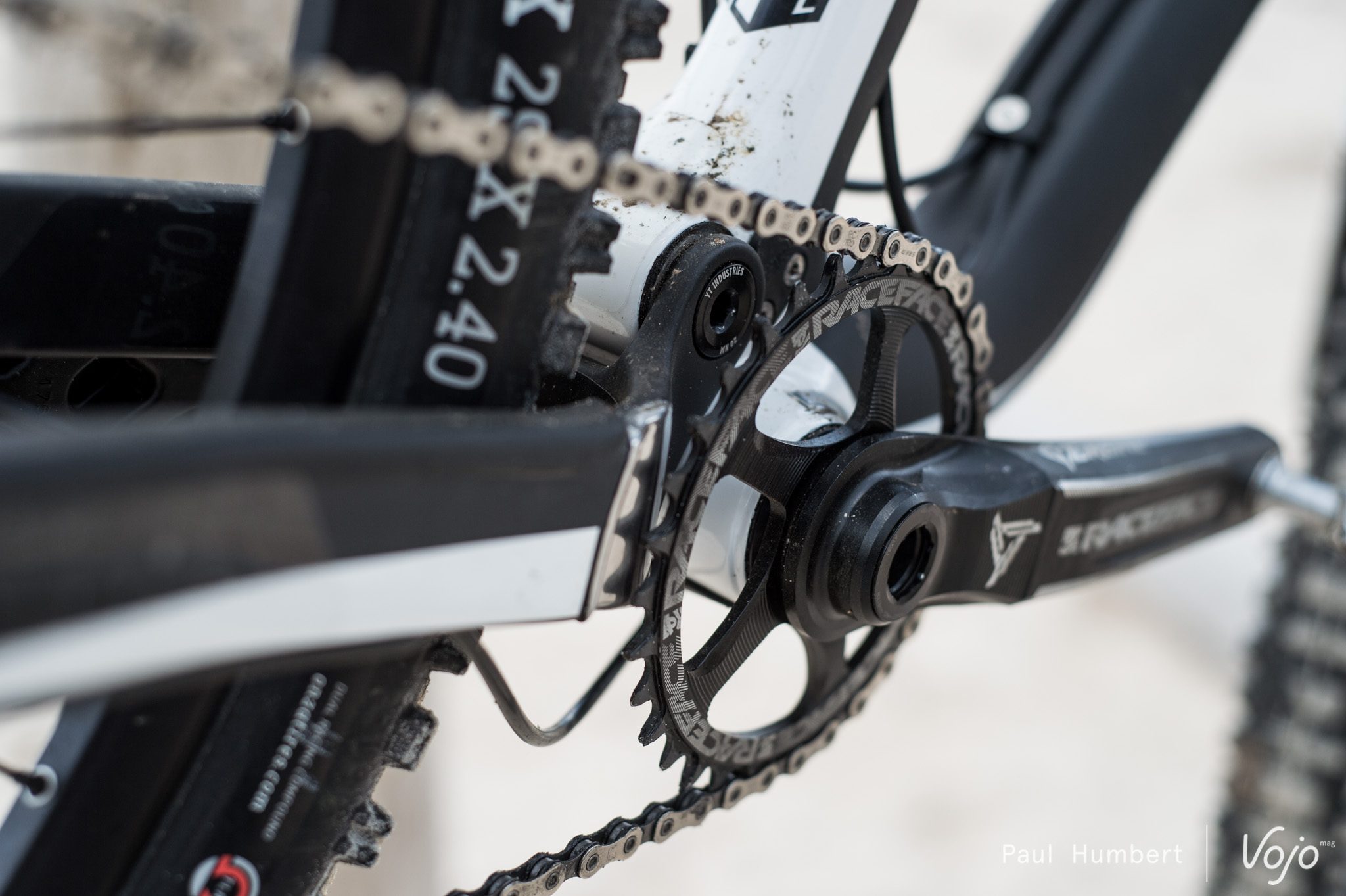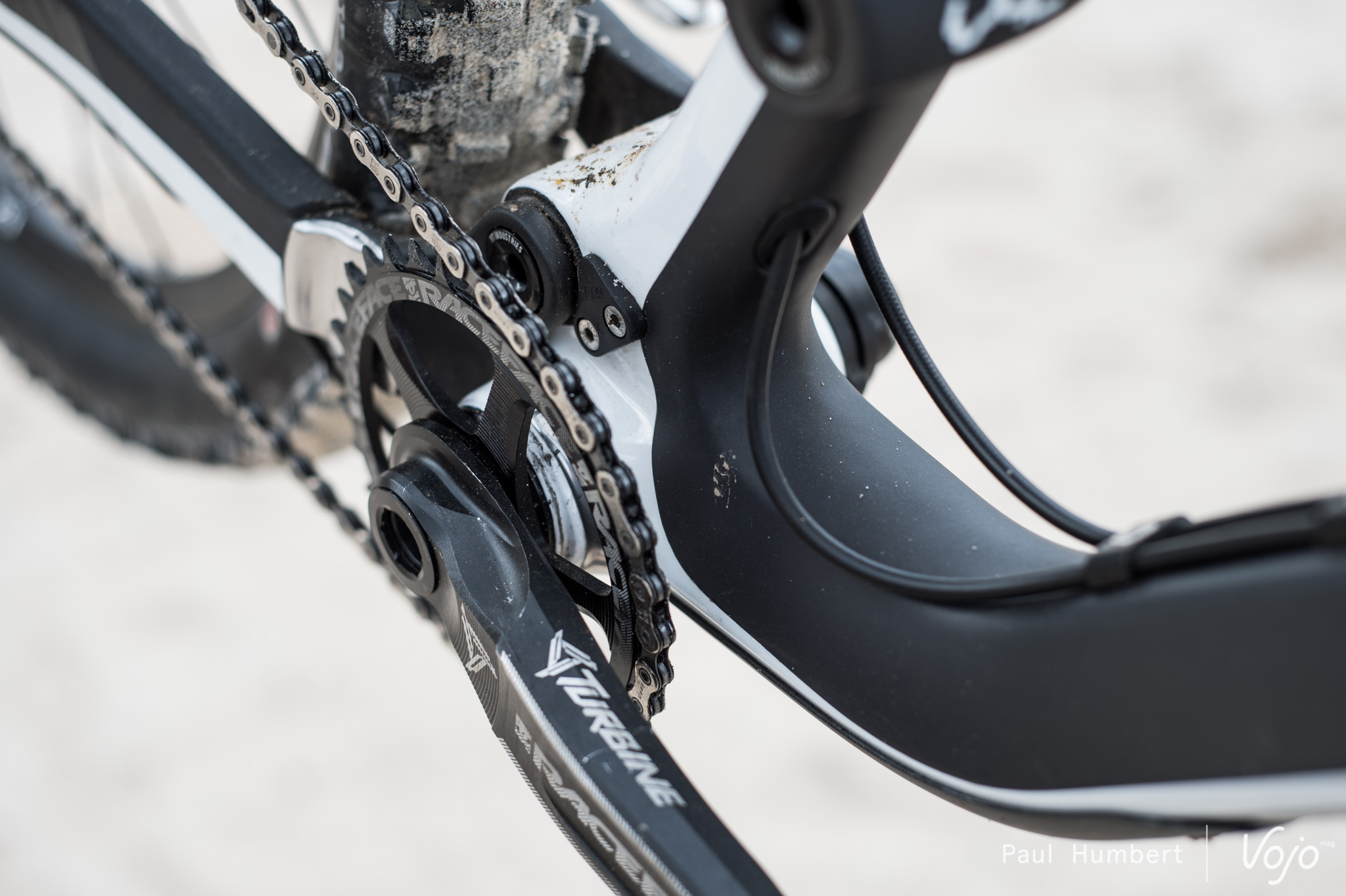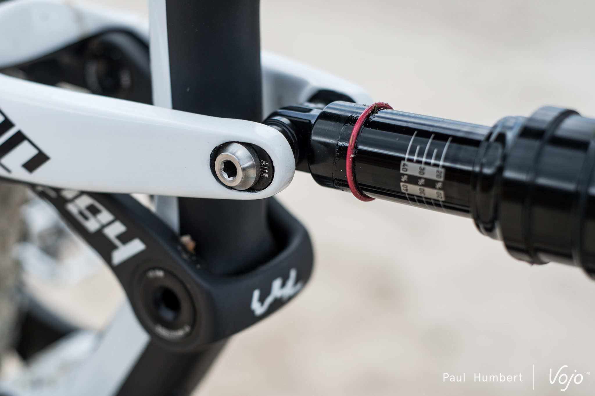 L’amortisseur trouve son point d’ancrage au milieu du tube inférieur et est comprimé par les haubans. Sa courbe de compression est dictée par un petit basculeur fixé sur le tube de selle. Le point de pivot principal est quant à lui placé pile au niveau du sommet du plateau (de 32 dents), une technique classique mais toujours efficace pour limiter le pompage.