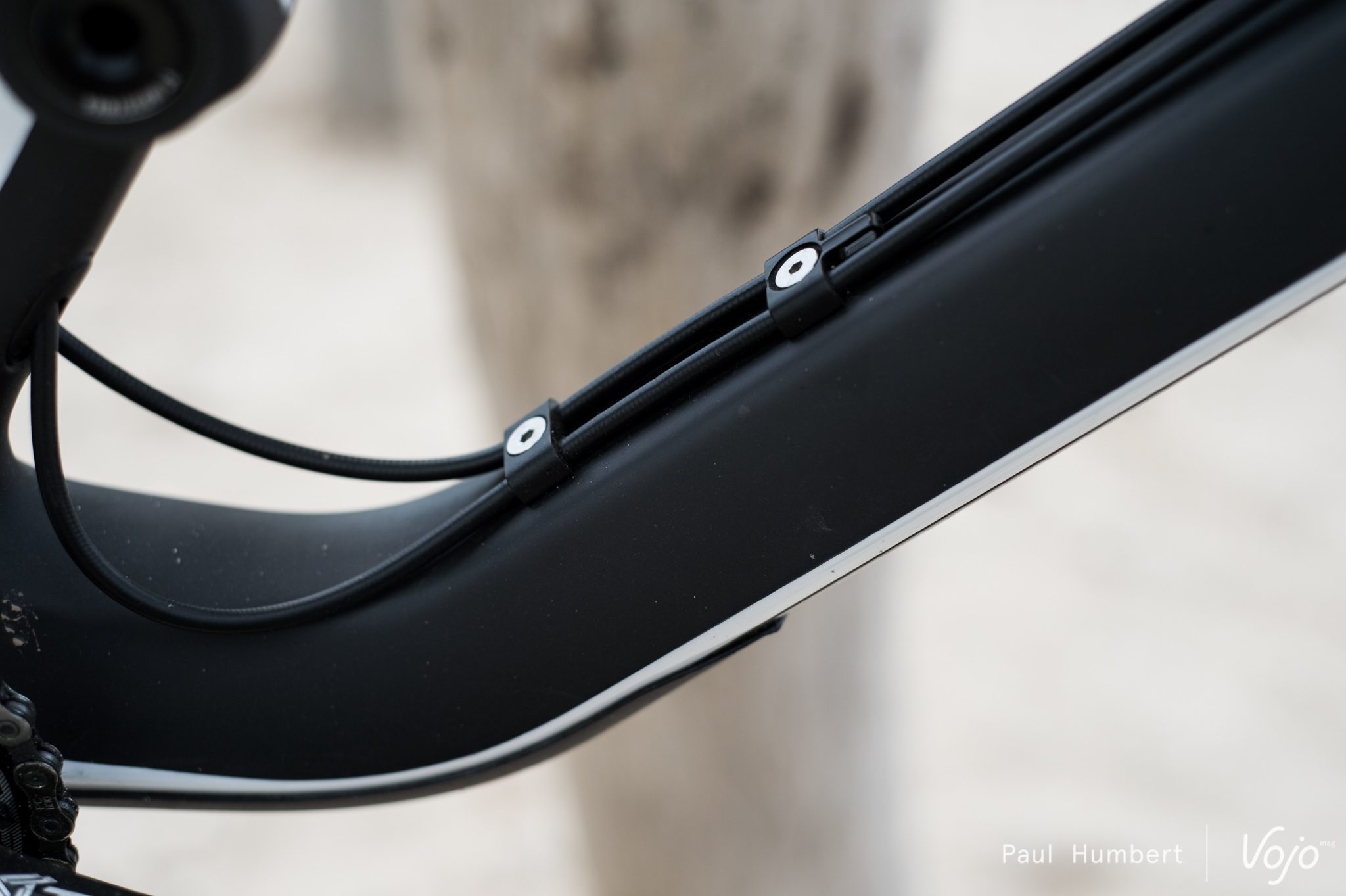 Pour ceux qui en douteraient, la vente à distance n’implique pas une qualité de finition moindre. Le vélo est protégé à toutes les zones sensibles soit par du caoutchouc, soit par des petites inserts en métal. Les gaines et câbles sont fixés de manière très propre avec des pièces vissées. Seul le câble de dérailleur traverse les bases et la durit de tige de la tige de selle télescopique passe par le tube de cette dernière. Les autres câbles sont accessibles en externe pour une maintenance plus facile (mais sans polluer l’avant du vélo). Un choix qui va à l’encontre de la tendance actuelle mais qui ne nous a pas posé le moindre problème, que du contraire. Par contre, on notera l’absence de plots ISCG pour anti-déraillement. Vu les capacités du vélo, cela peut s’avérer gênant. De la même manière, les plus gros bidons ne pourront pas être installés sur le vélo mais un petit porte-bidon et son contenant pourront se loger sous l’amortisseur.