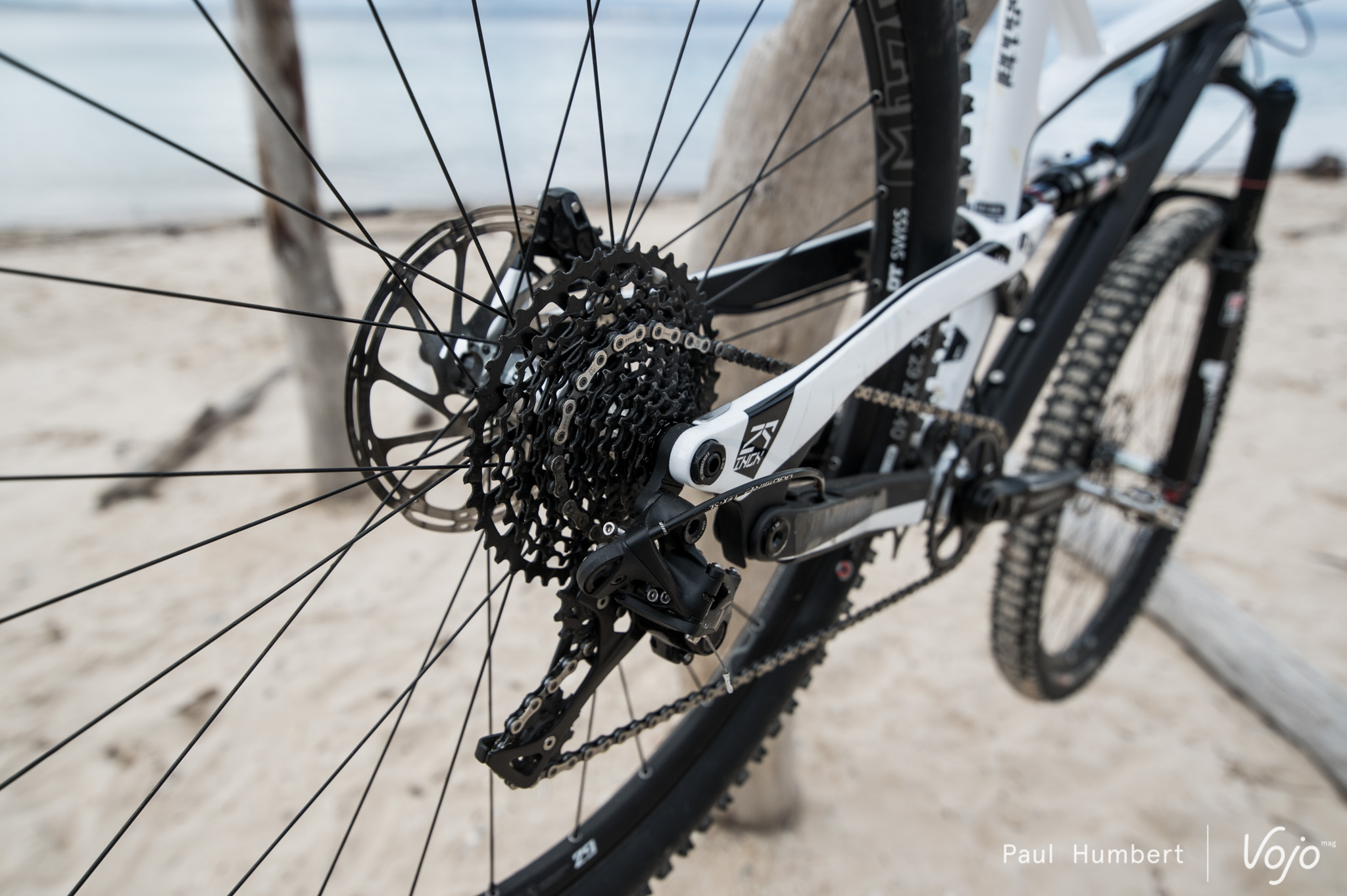 YT offre toujours la possibilité d’installer un dérailleur avant (on en retrouve sur les modèles d’entrée de gamme en aluminium) mais c’est assez logiquement que ce modèle ONE a été équipé d’une transmission 1X11 Sram X1. Là encore, une solution fiable et connue. C’est un pédalier RaceFace Turbine qui a été installé, avec un plateau de 32 dents. Sur ce 29 pouces, il pourra être remplacé par un modèle de 30 dents pour les pilotes moins à l’aise au pédalage dans les montées raides.