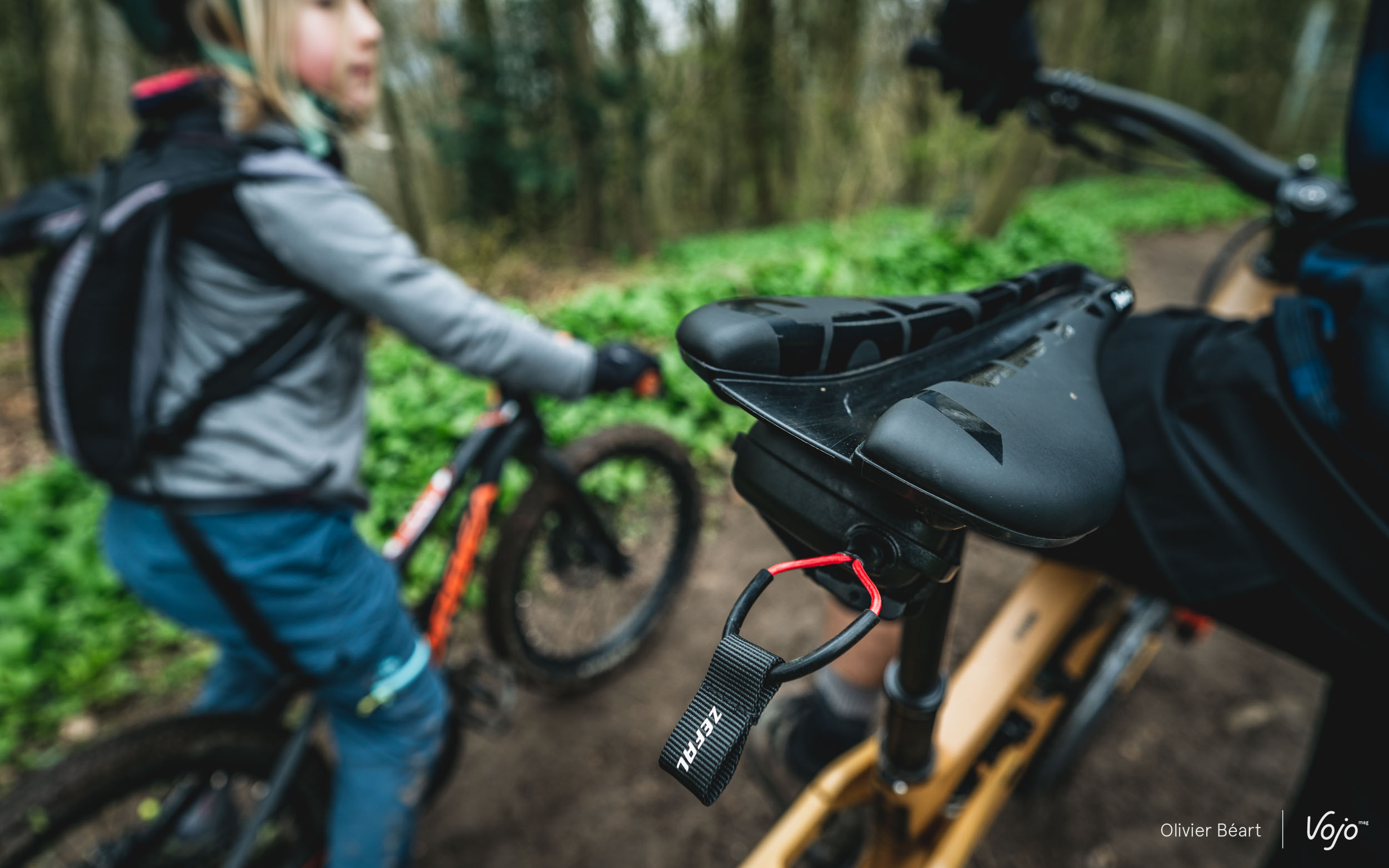 Vient alors le Bike Taxi de Zéfal. Tout d’abord, il s’accroche vraiment facilement sous la selle. Selon les modèles, il faut un peut faufiler les doigts entre les rails et la coque, mais nous l’avons chaque fois monté en moins de 5 minutes. Rails carbone, titane ou acier, peu importe, cela ne fait pas de différence ici. Vu son poids et sa discrétion, on peut le laisser en permanence sur son vélo, ce qui est aussi une bonne chose.