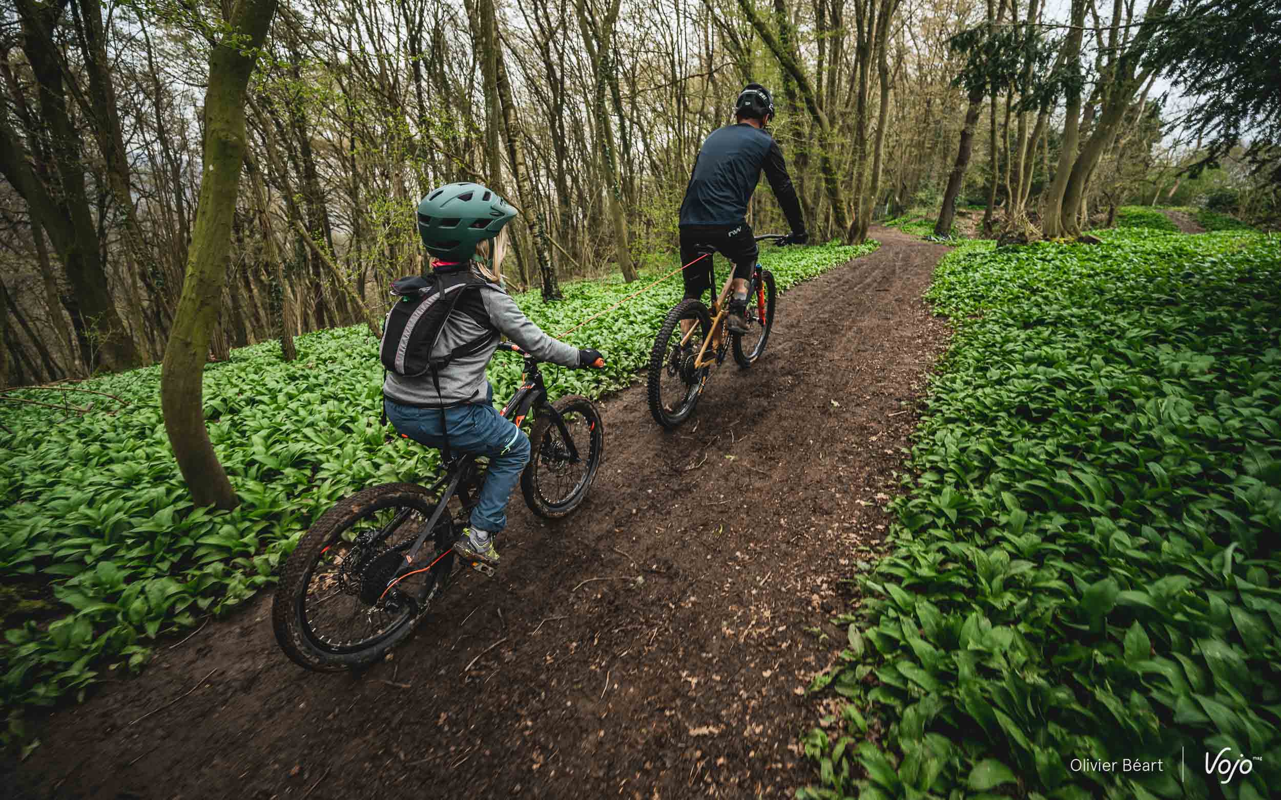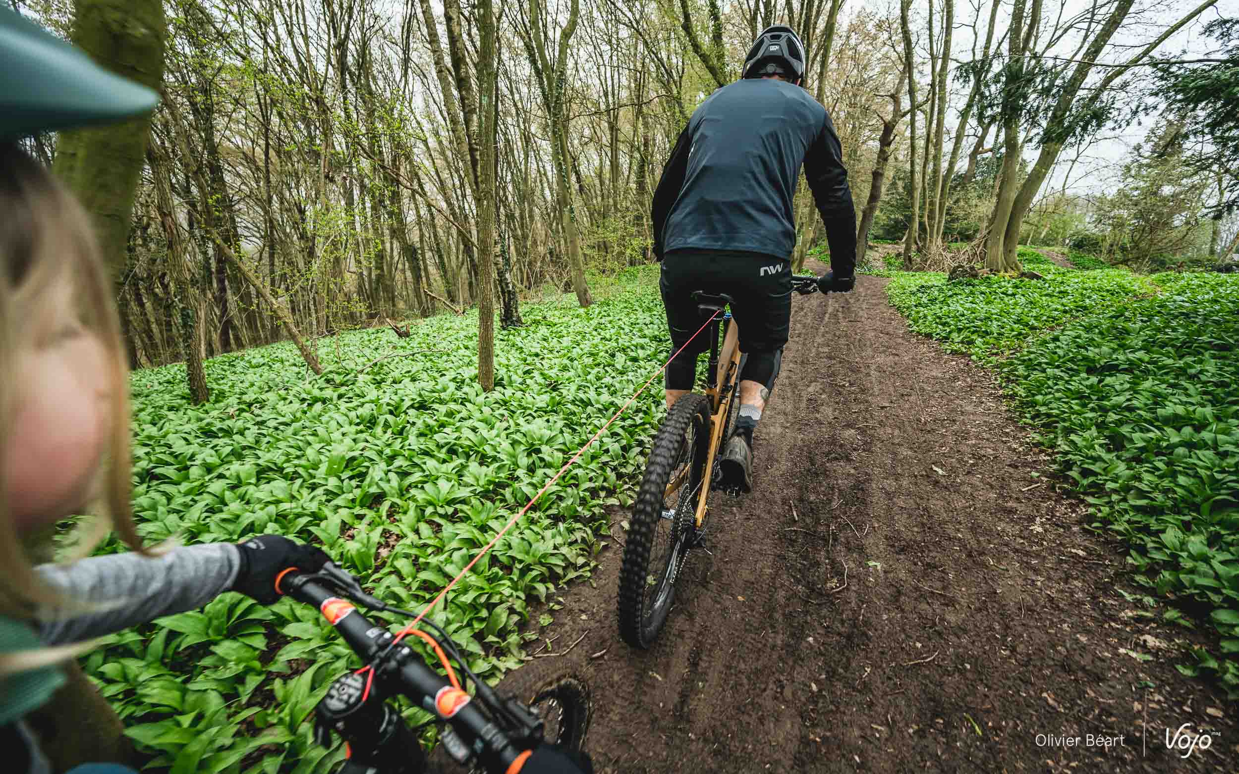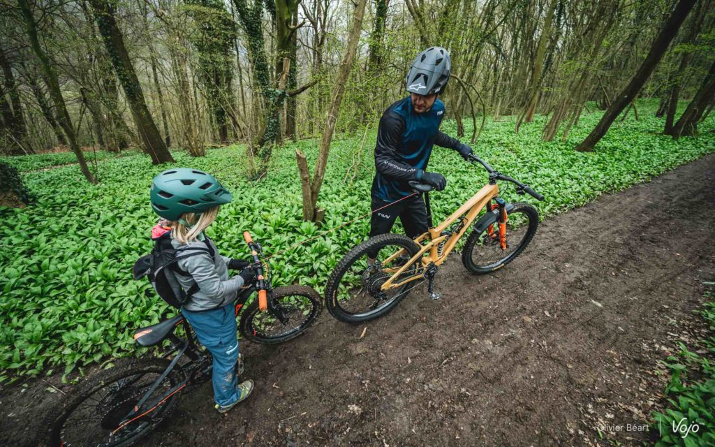 Ce test, je vais l’écrire à la première personne car j’ai testé le Bike Taxi essentiellement avec ma fille Mila, 7 ans et demi, qui pose ici sur les photos avec un ami qui s’est prêté au jeu le temps d’un shooting. Depuis un peu plus d’un an, elle va au cours de VTT à Chaudfontaine, près de Liège. Elle aime bien ça être dans la nature, rouler à vélo dans la boue et aussi être avec les copines qu’elle s’est faites à l’école VTT. Sans doute aussi qu’elle veut un peu faire comme papa, mais j’ai toujours fait attention à ne pas pousser mes enfants absolument vers le VTT. Et le Bike Taxi, me direz-vous ? Eh bien c’est vraiment quelque chose qui m’a tout de suite intéressé car si Mila aime bien le plat et les descentes, les montées ce n’est pas trop sa tasse de thé, même si elle est volontaire.