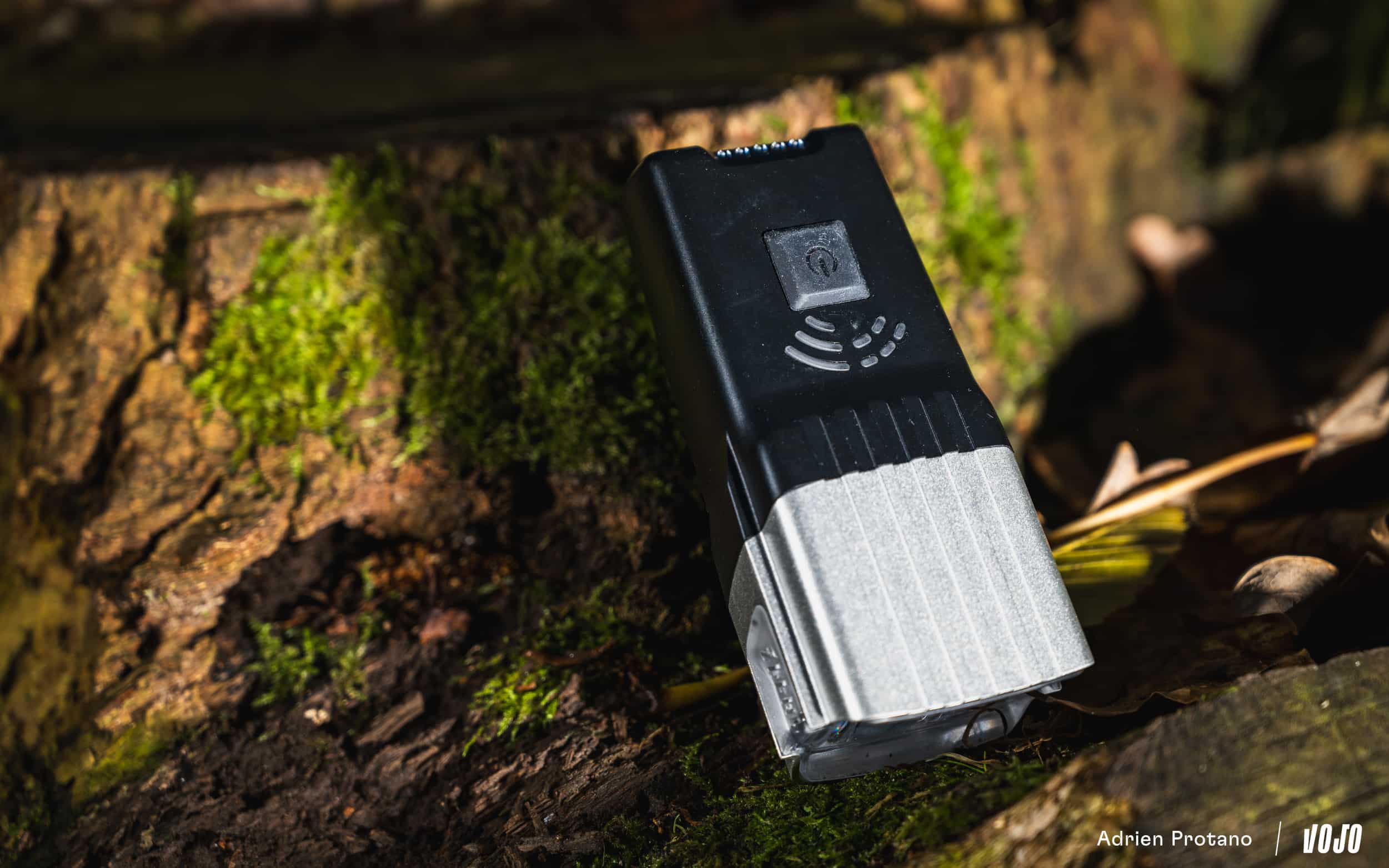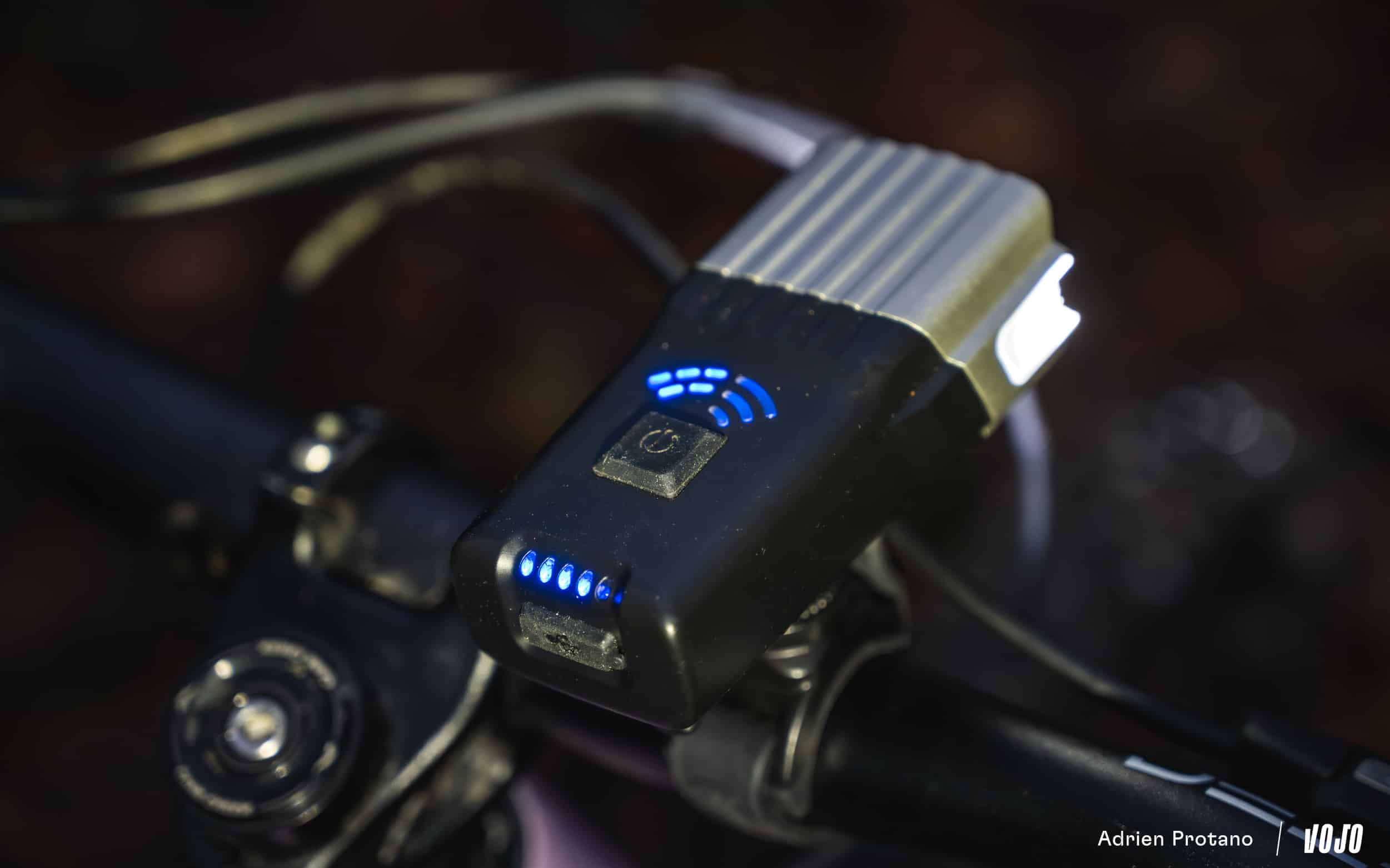 Un autre détail intéressant est cette commande déportée qui permet de fixer la lampe à l’endroit que l’on souhaite tout en conservant le contrôle au bout du doigt, et donc sans devoir lâcher une main du guidon. Un vrai plus en VTT lorsqu’on tente de maximiser l’autonomie de la lampe en basculant régulièrement entre les modes. La commande se connecte au moyen du port USB-C de la lampe, et se fixe sur le cintre grâce à un petit velcro intégré.