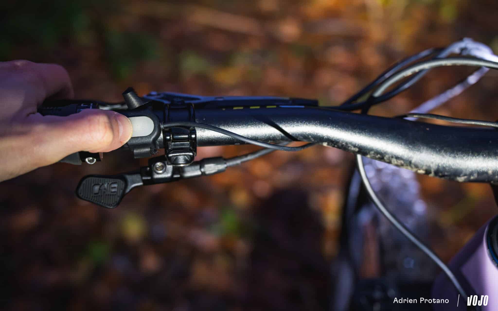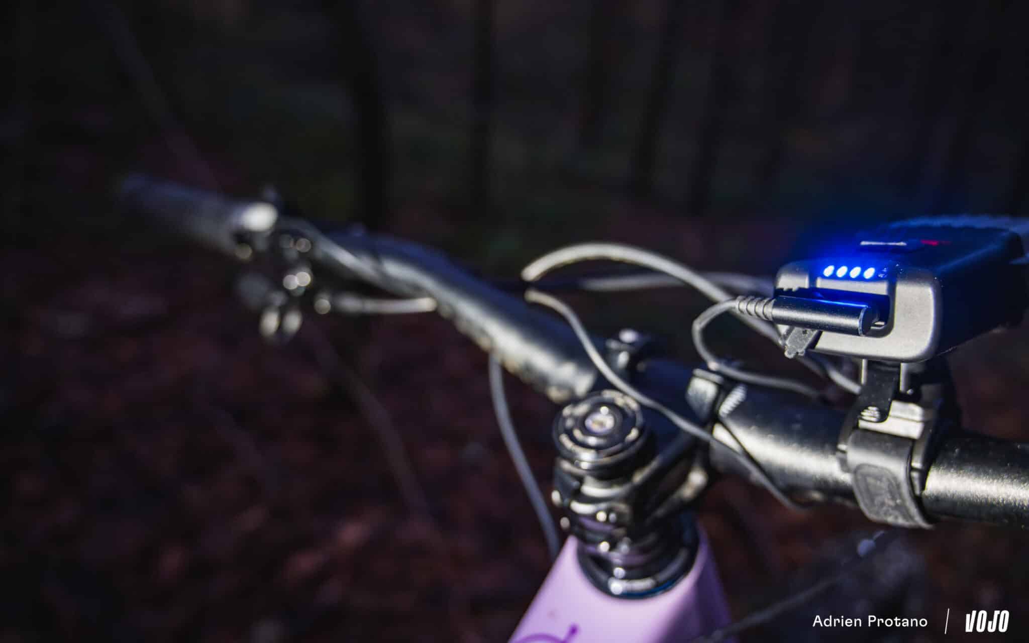 Un autre détail intéressant est cette commande déportée qui permet de fixer la lampe à l’endroit que l’on souhaite tout en conservant le contrôle au bout du doigt, et donc sans devoir lâcher une main du guidon. Un vrai plus en VTT lorsqu’on tente de maximiser l’autonomie de la lampe en basculant régulièrement entre les modes. La commande se connecte au moyen du port USB-C de la lampe, et se fixe sur le cintre grâce à un petit velcro intégré.