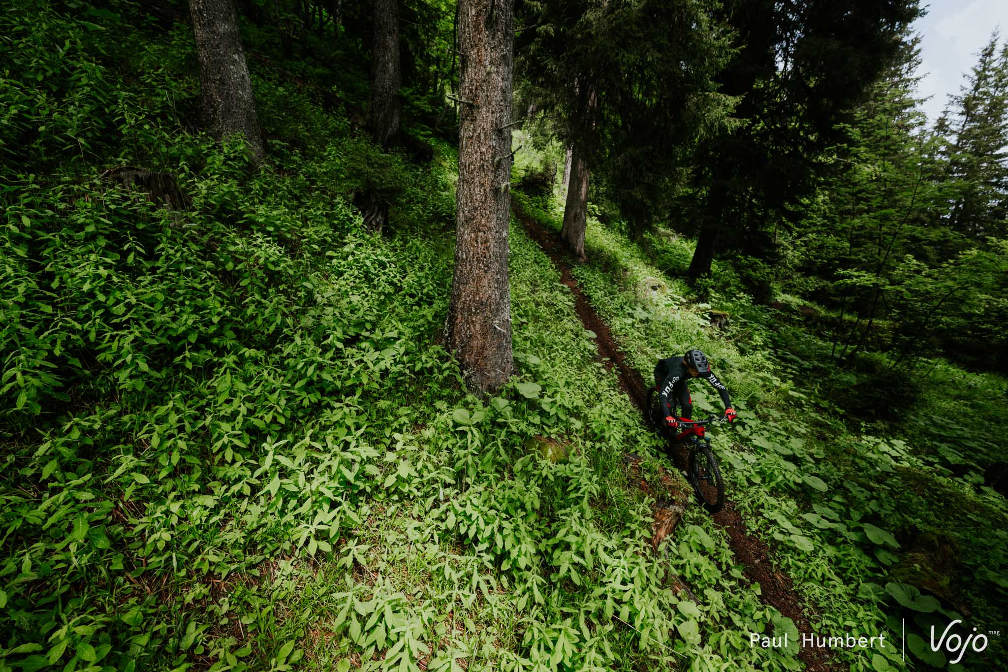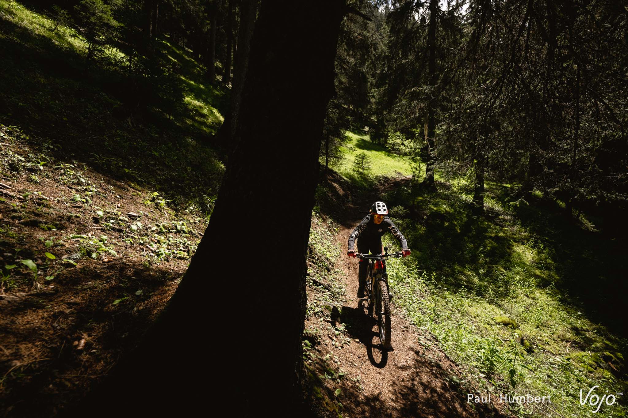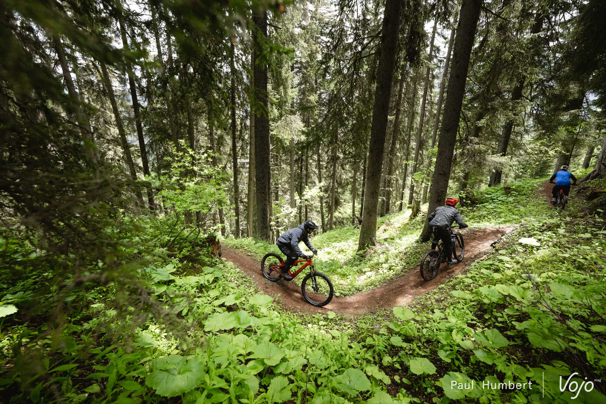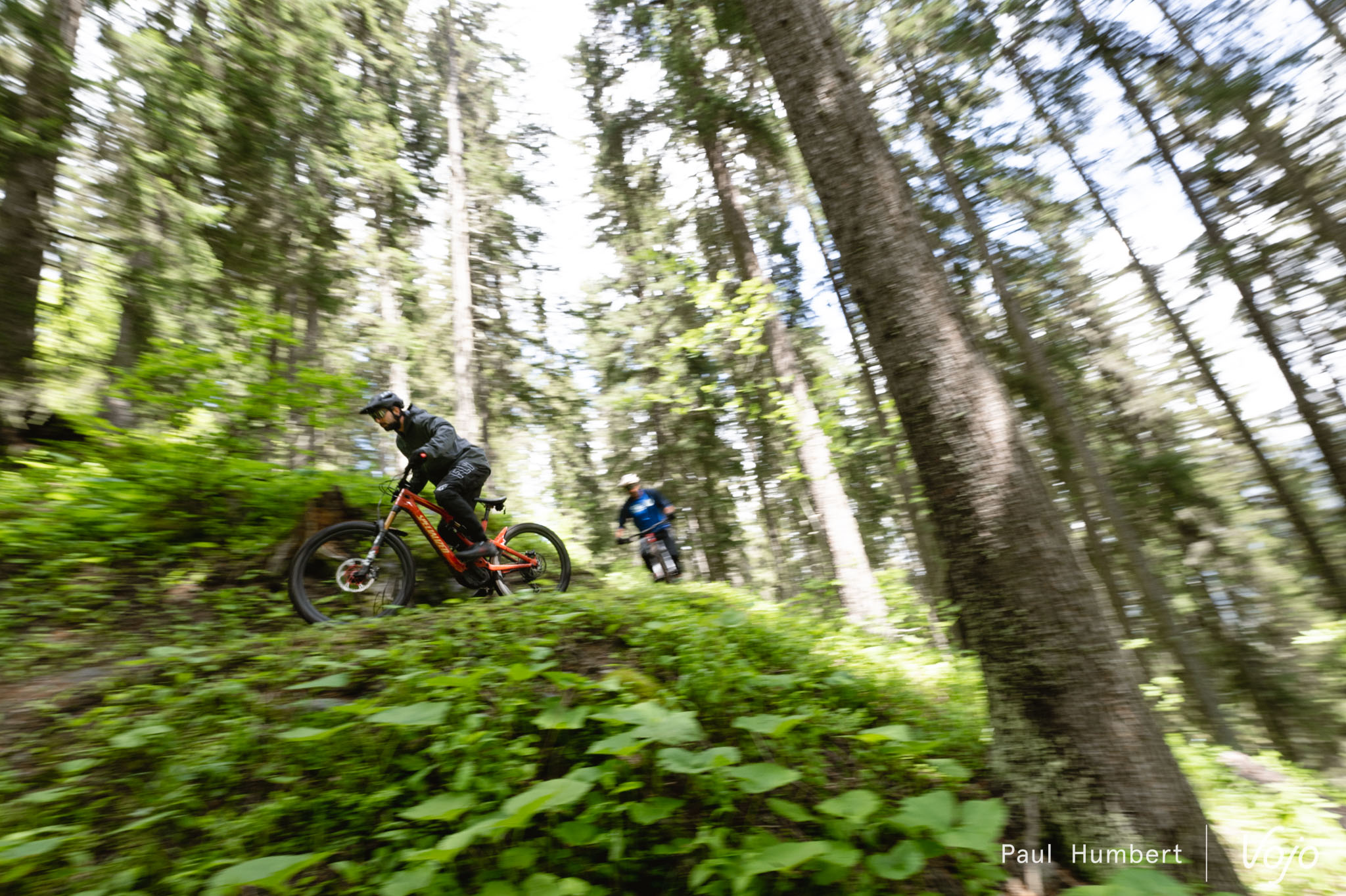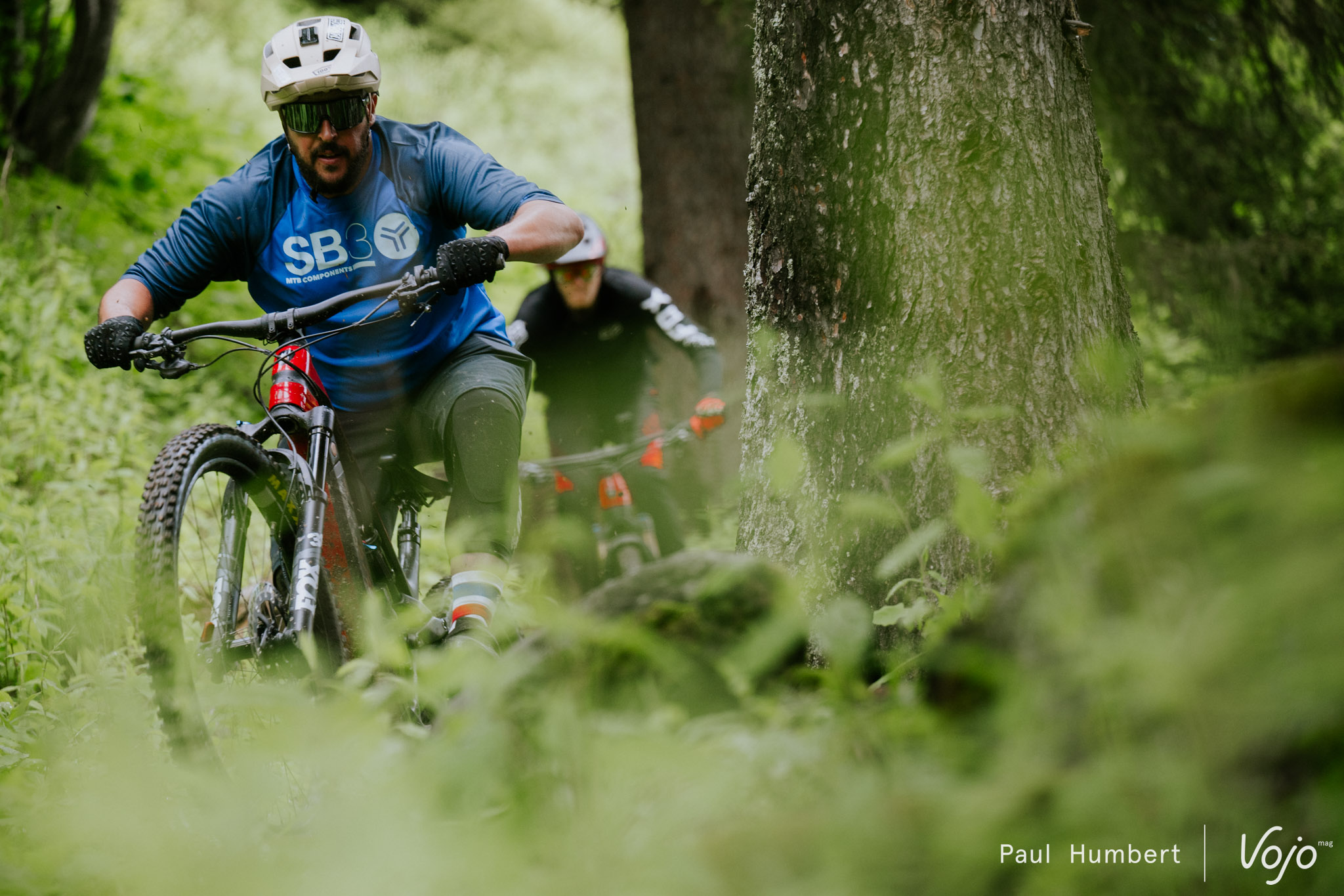 Ce spot justement, Courchevel, on l’a découvert le temps d’une petite journée de reconnaissance et de shooting. Au départ de l’endroit où les tentes des marques seront installées et à quelques centaines de mètres de l’hôtel qui accueillera toutes les équipes et les participants, on file entre des portions de pistes de bike park et des sentiers de montagne.