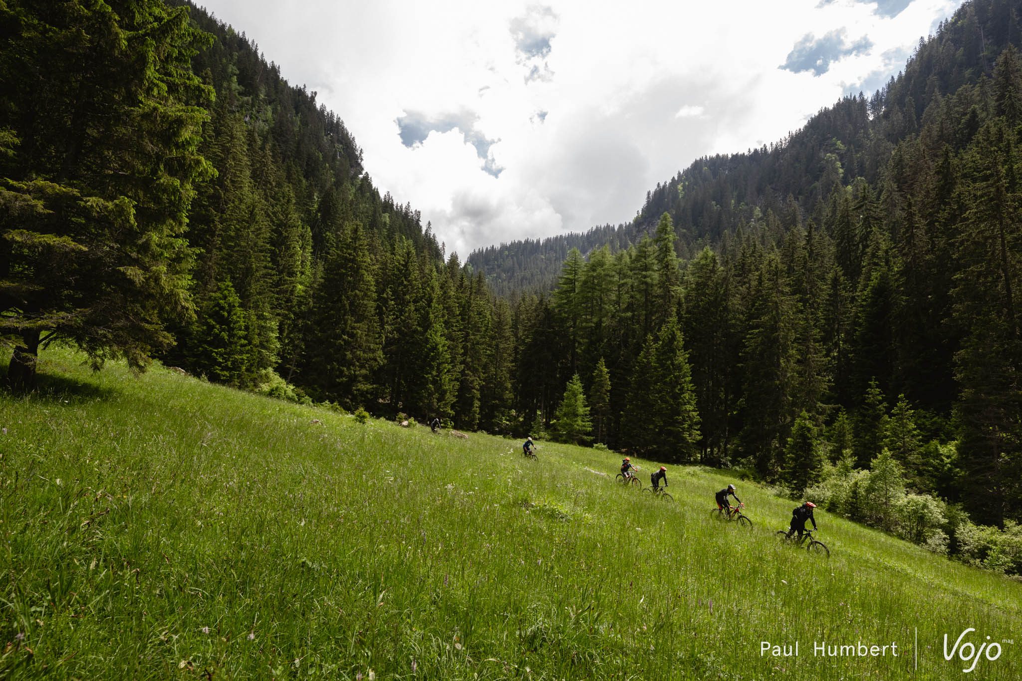 Ce spot justement, Courchevel, on l’a découvert le temps d’une petite journée de reconnaissance et de shooting. Au départ de l’endroit où les tentes des marques seront installées et à quelques centaines de mètres de l’hôtel qui accueillera toutes les équipes et les participants, on file entre des portions de pistes de bike park et des sentiers de montagne.