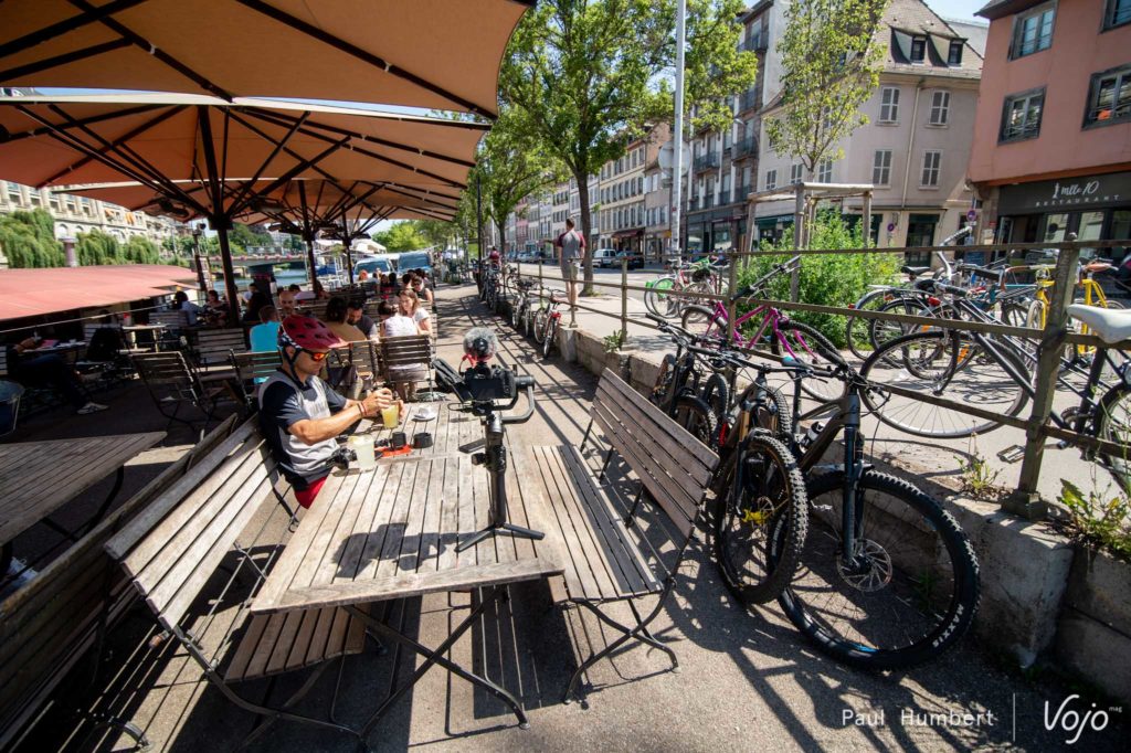 On s’arrête sur une des péniches caractéristiques du bord de l’Ill pour boire un coup, se rafraîchir et attendre notre train. Juste le temps de rater ce dernier et d’attendre le suivant. Qu’à cela ne tienne, on continue notre balade et on s’arrête facilement pour discuter, nos vélos aiguisant l’intérêt de certains passants. De retour dans la verrière de la gare, on embarque direction Barr. Point de départ vers les sentiers, on pédale facilement vers le Mont Sainte-Odile.