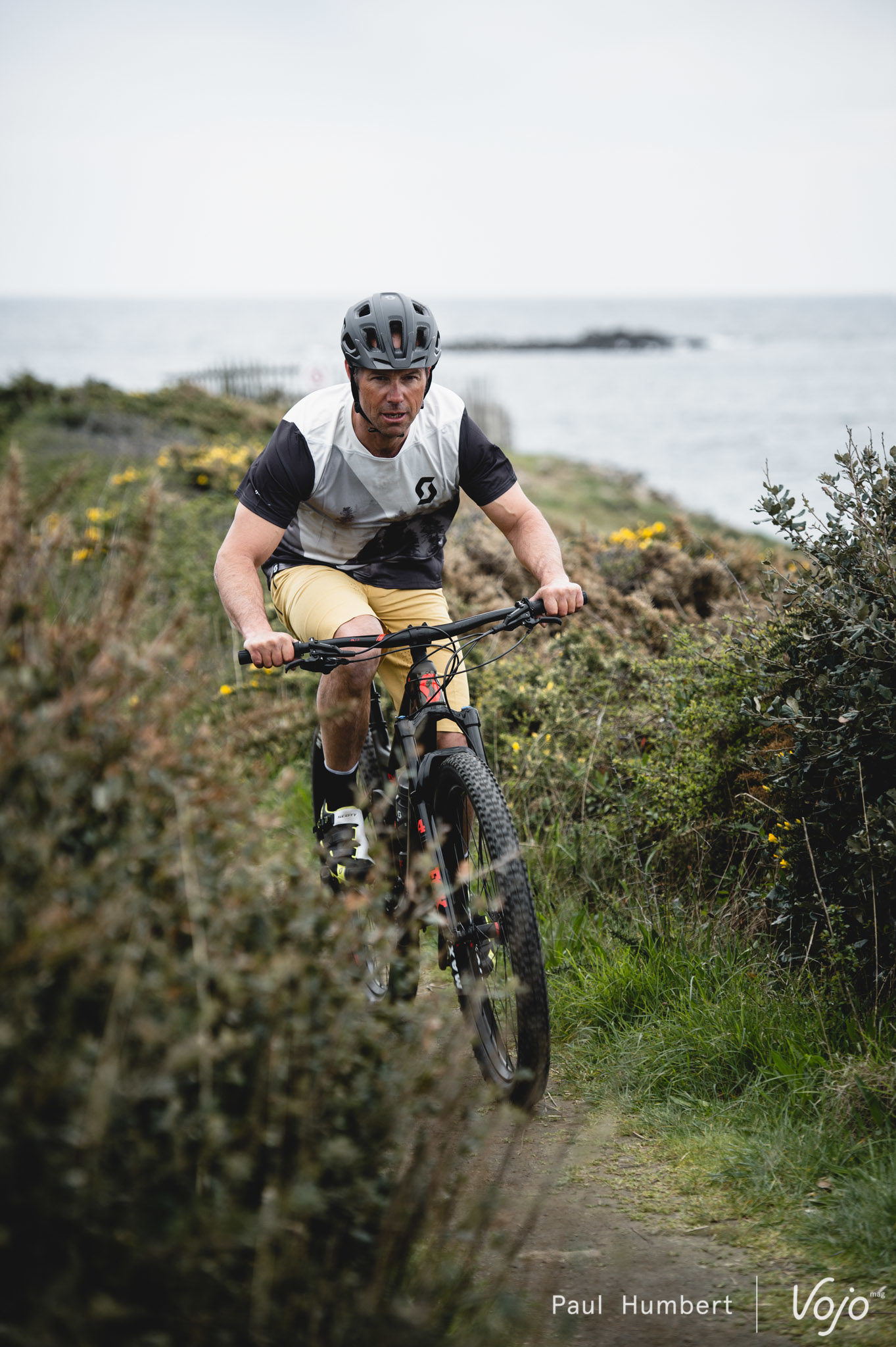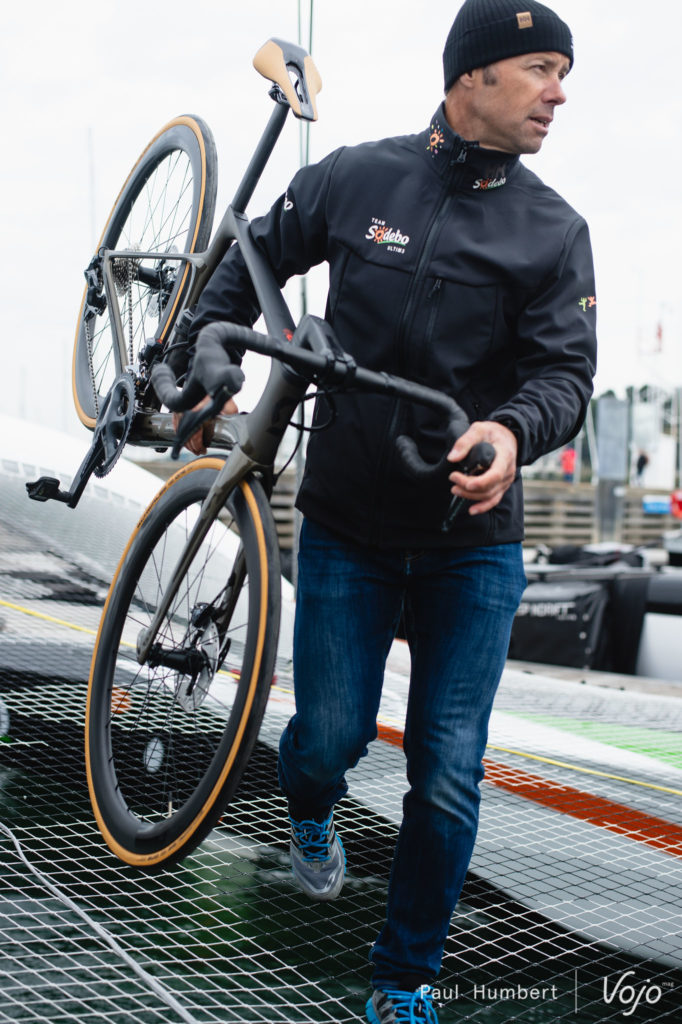 Traverser les océans le plus vite possible, voler sur l’eau et dompter un géant des mers, c’est ce qui anime Thomas Coville. Le skipper français, qui fait partie de la classe très fermée des « Ultimes », ces trimarans géants, est également un passionné de vélo. Il roule sur la route et en VTT autour de son port d’attache, La Trinité-sur-Mer, et partage certaines de ses sorties avec d’autres membres de son équipe. En constante évolution, il est équipé de 120 capteurs de contrôle en temps réel et il « vole » sur l’eau grâce à ses foils, ces ailerons incurvés qui permettent au bateau de déjauger. Pas de surprise quand Thomas nous raconte, en parlant du vélo, « être passionné par l’objet ». Les analogies avec le vélo sont nombreuses pour lui, et Thomas retrouve sur ces machines un rapport particulier au temps, à la douleur, et à l’adaptation même aux machines. À VTT, ce qu’il aime, c’est se mettre dans le rouge, ne pas poser pied à terre et apprécier les descentes ludiques. Il n’accepte pas ses limites et il le sait, et c’est d’ailleurs ce qui anime ses réflexions en pleine mer ou sur un vélo de route. Il se questionne, interroge ses émotions, sans parfois trouver de réponse : « Il y a des choses qu’on n’arrive pas à expliquer. La solitude, la lumière, le son d’une vague. Personne à terre ne peut le comprendre. » Il aime toutefois s’entourer de personnes qui l’inspirent, des passionnés, et il se nourrit de discussions avec le comédien Jacques Gamblin, qui met en scène certaines de leurs réflexions, ou avec le regretté philosophe Michel Serre.
