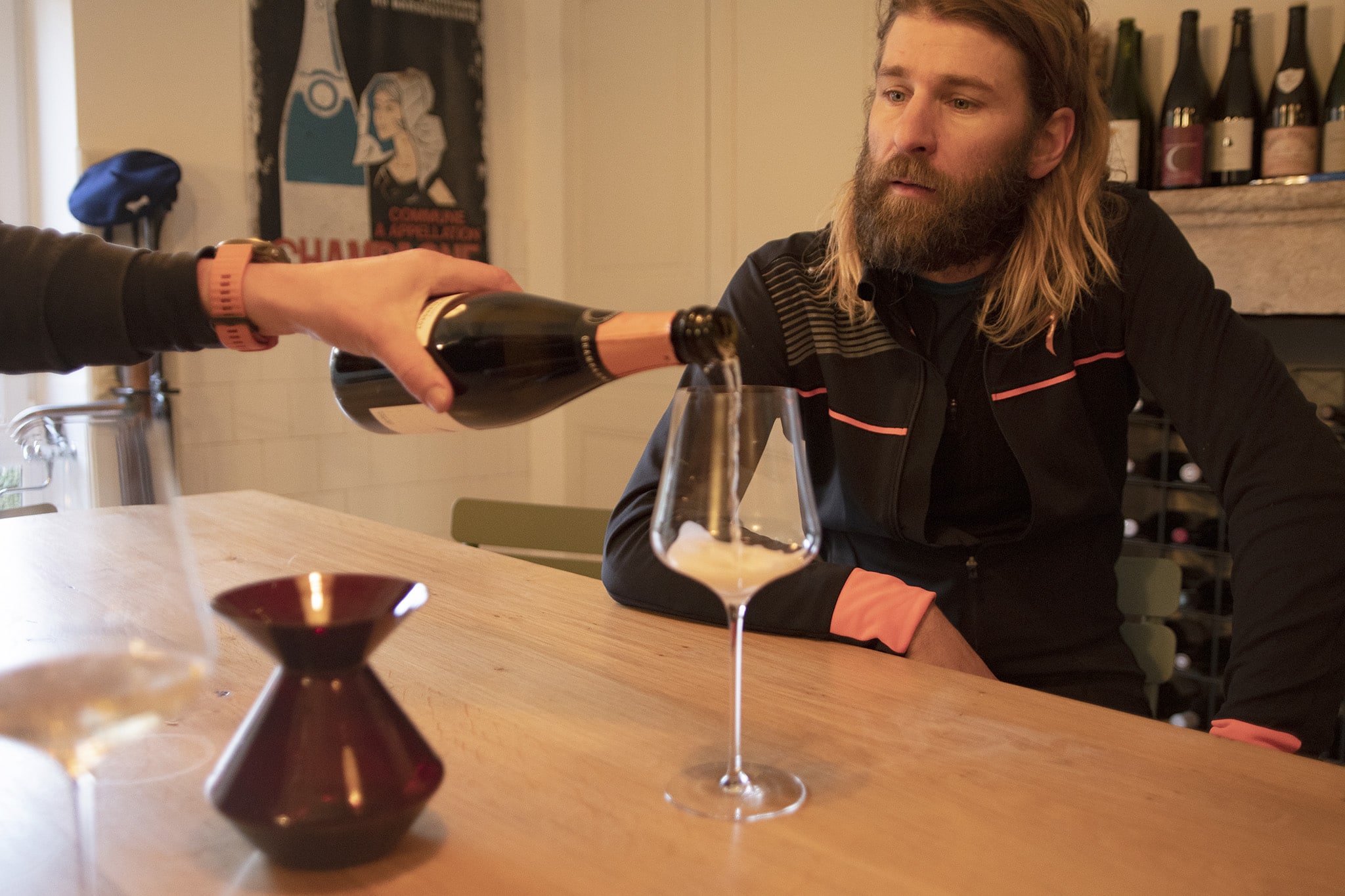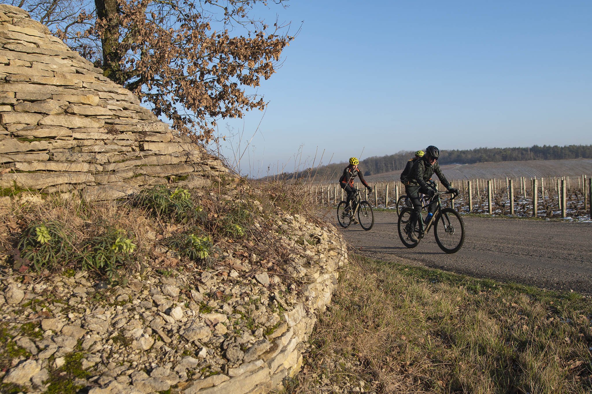 Par chance, nous aurons comme guide Raphaël Piconnet et Paul Clergeot, passionnés de gravel et viticulteurs de surcroit ! Ils nous emportent pour un voyage dans leur côte des Bar, là où passeront les coureurs du Tour de France. Les chemins de ces côteaux nous sont apparus plus tortueux et techniques, comparés à ceux de l’Eroica, suite à notre petite expérience de participant. Dans les descentes étroites, il faut filer vite et bien droit : les gars des Classiques vont sans doute se disputer la victoire. Des grands panoramas sont au bout du sommet, d’une côte où trône parfois une cadole. Faite de pierres sèches, il s’agit d’un abri pour protéger les vignerons de la chaleur ou des intempéries.