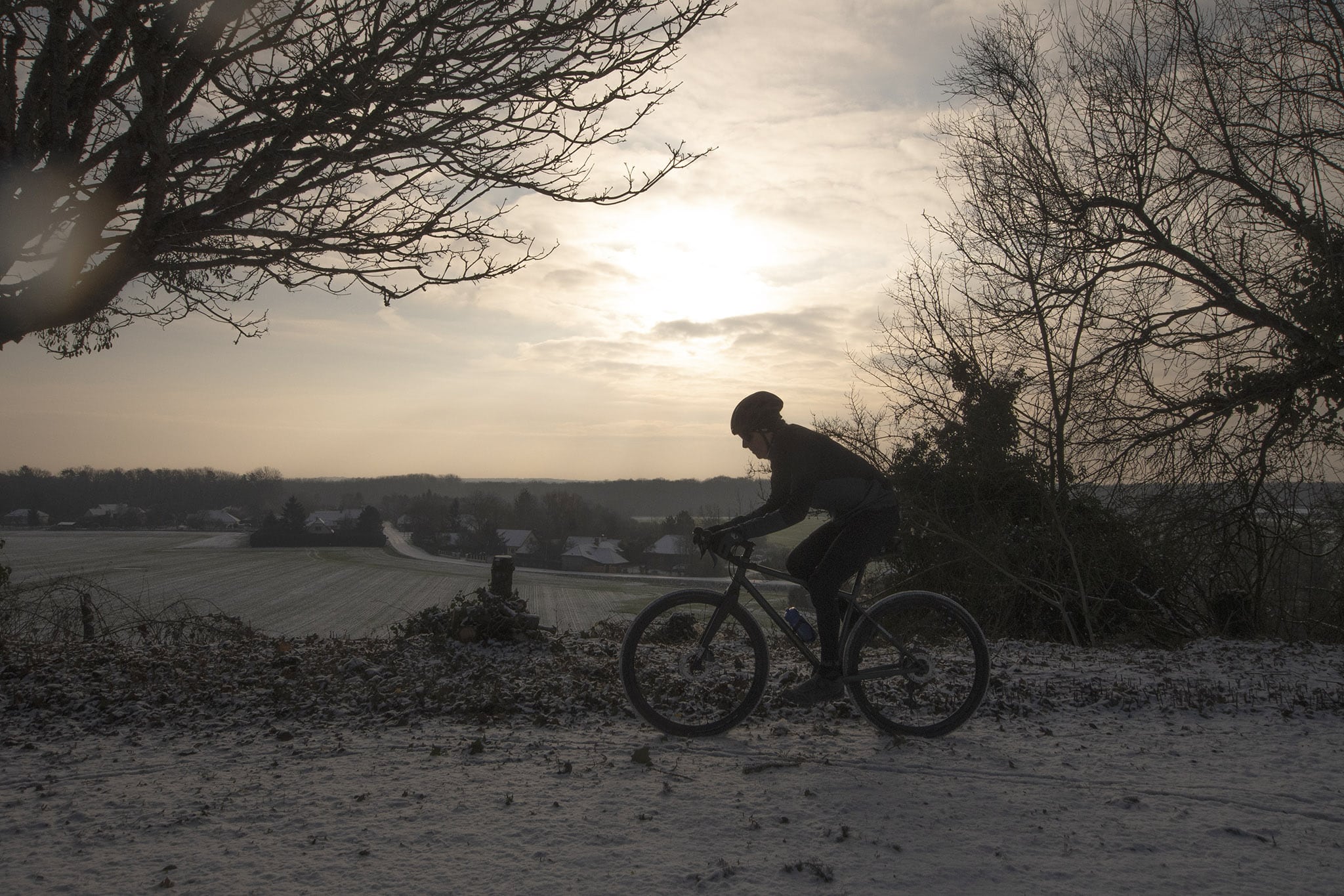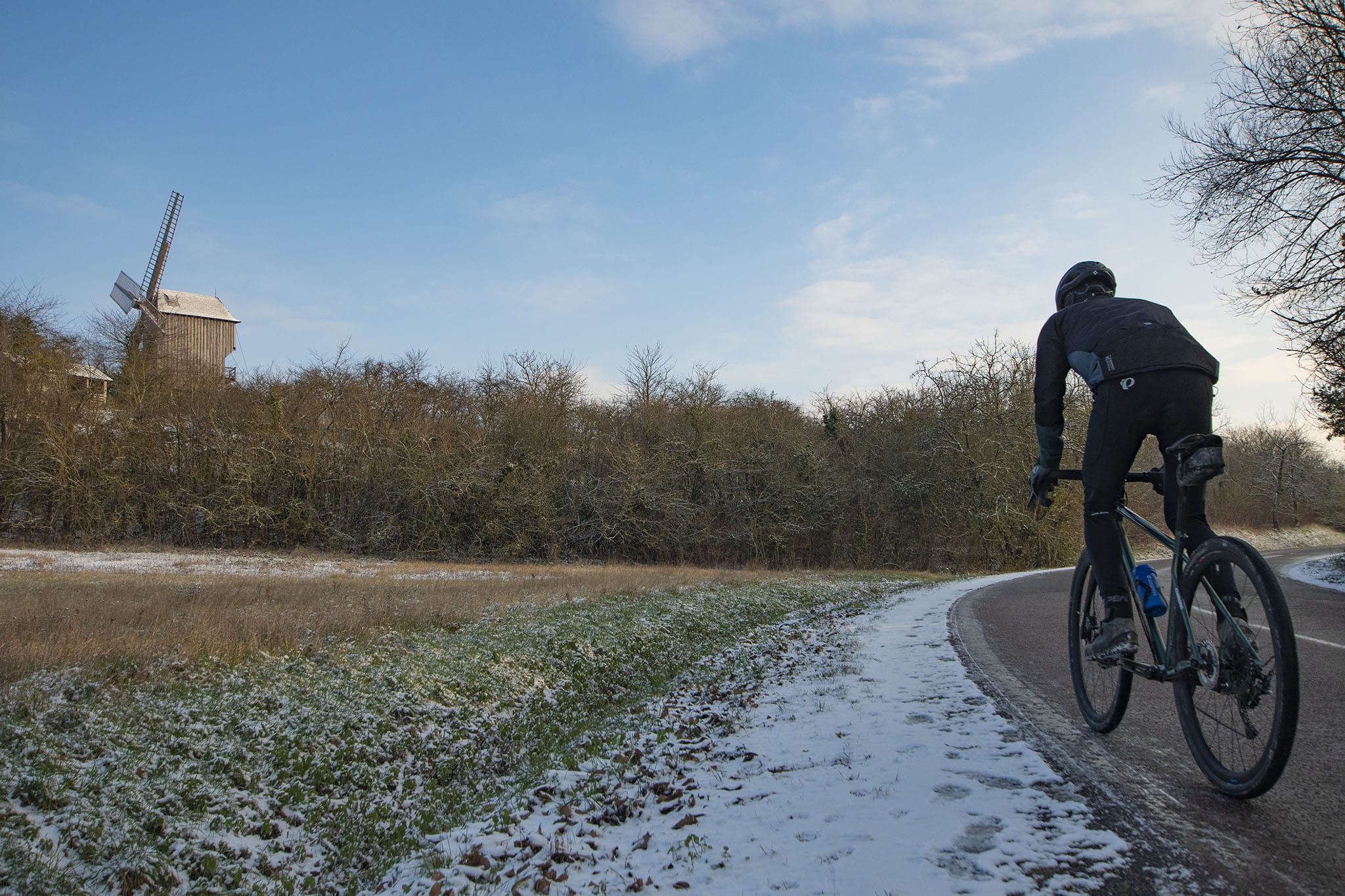 A Loches-sur-Ource, le sol gelé est devenu un bloc brut : aucun gravier ne glisse, les pneus mordent parfaitement le sol gelé. En juillet, la poussière va sans nul doute s’élever comme un nuage et se coller à la sueur. Les routiers d’aujourd’hui vont ressembler aux pionnier du Tour de France, hirsutes et sales comme des charbonniers. La lutte sera impitoyable, les corps en souffrance ploieront sous les coups de pédales pour gravir au plus vite ces petites côtes redoutables.