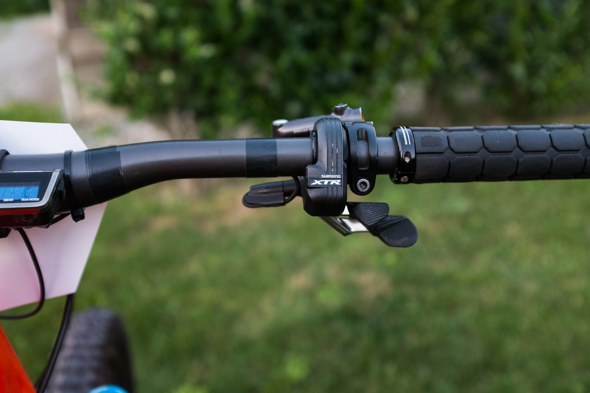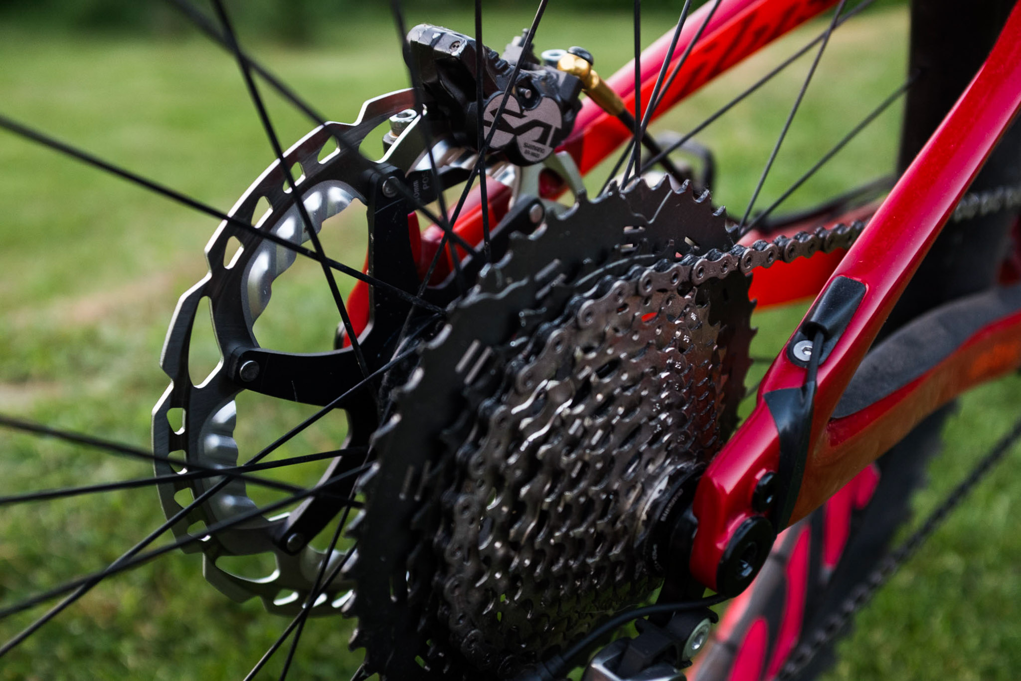 Plateau de 36 dents à l’avant pour emmener du braquet dans les longues lignes droites en spéciales, cassette XT 11-46 pour pouvoir monter les cols alpins. Et gros disque pour un freinage efficace !