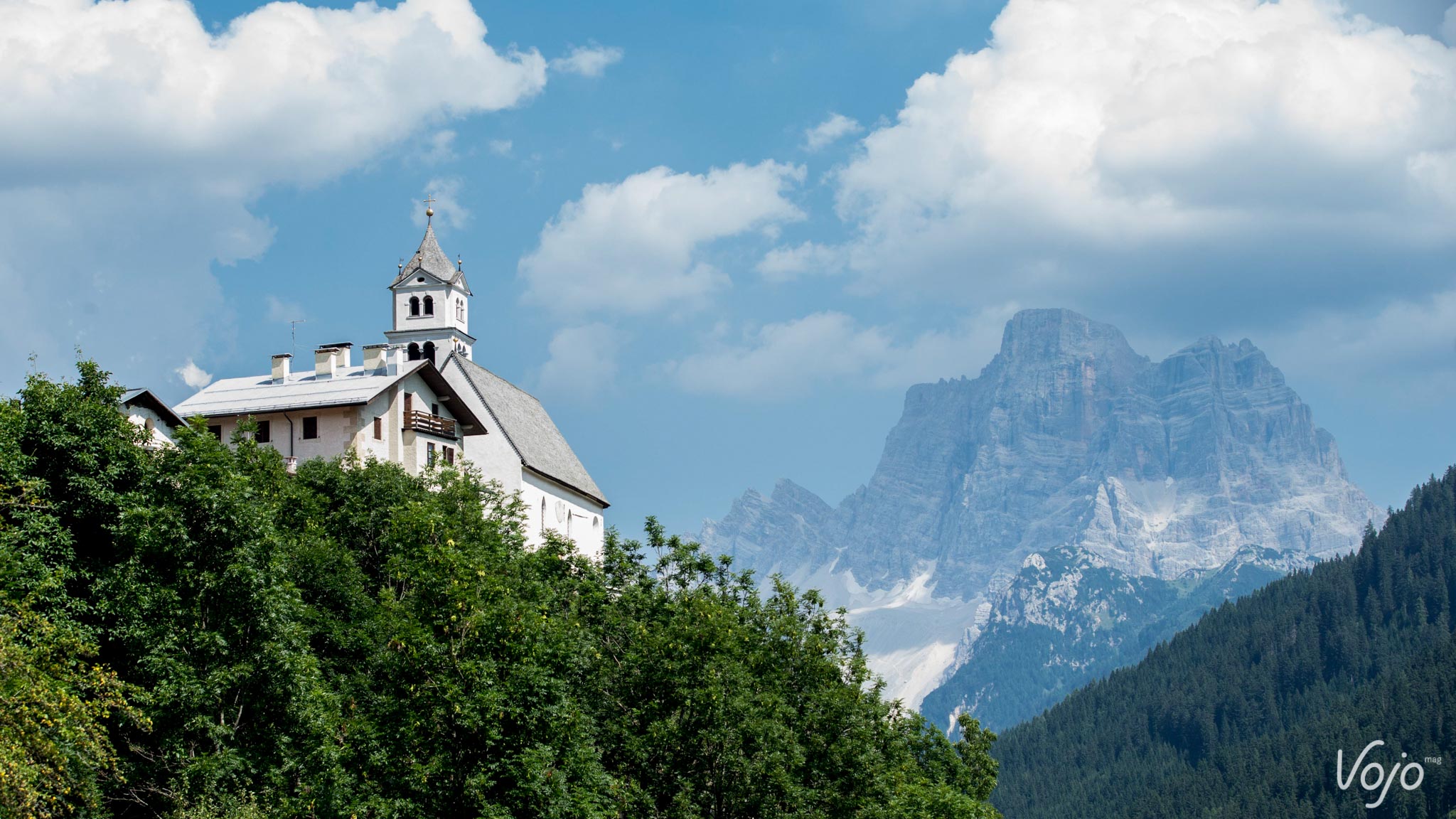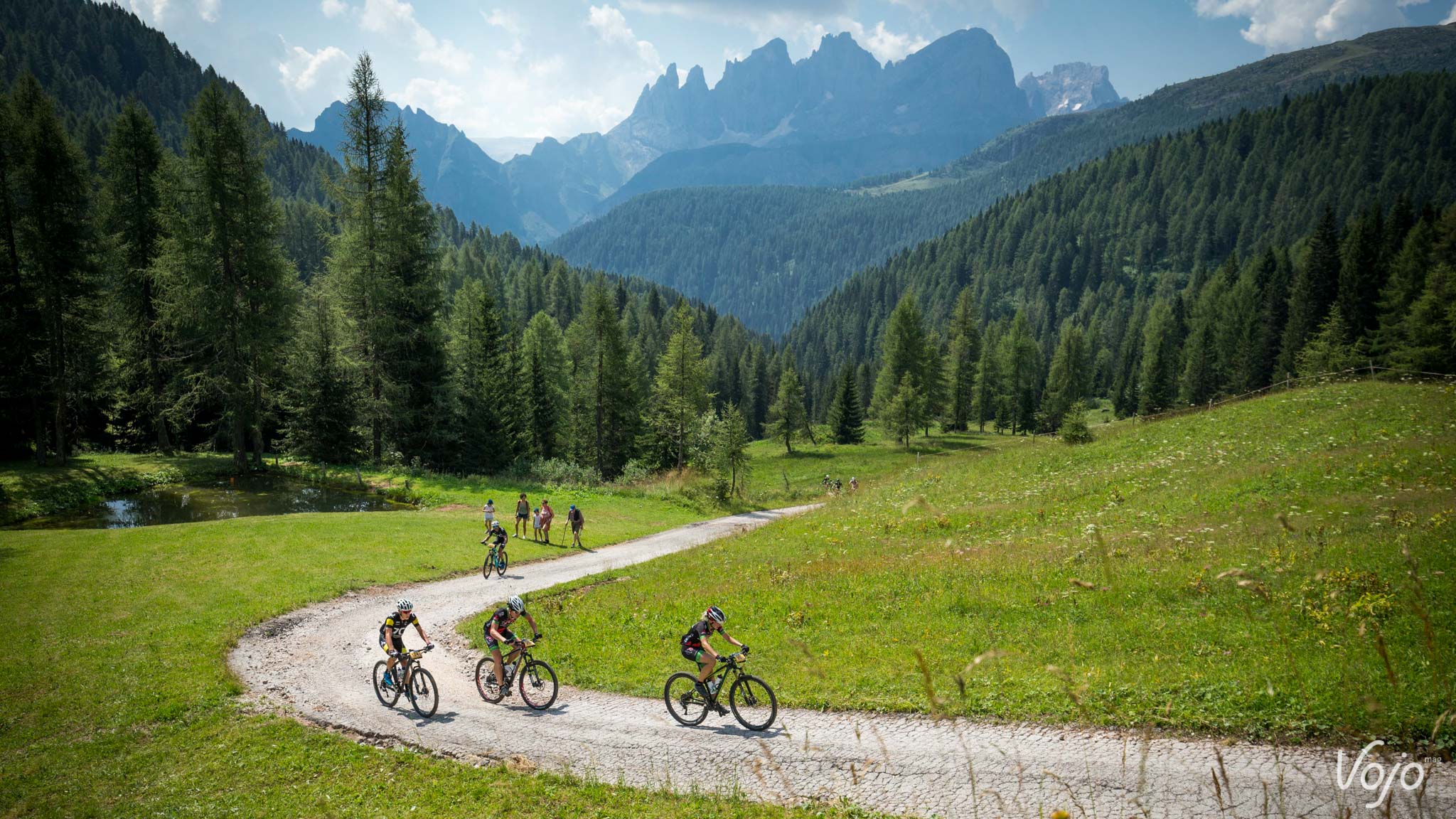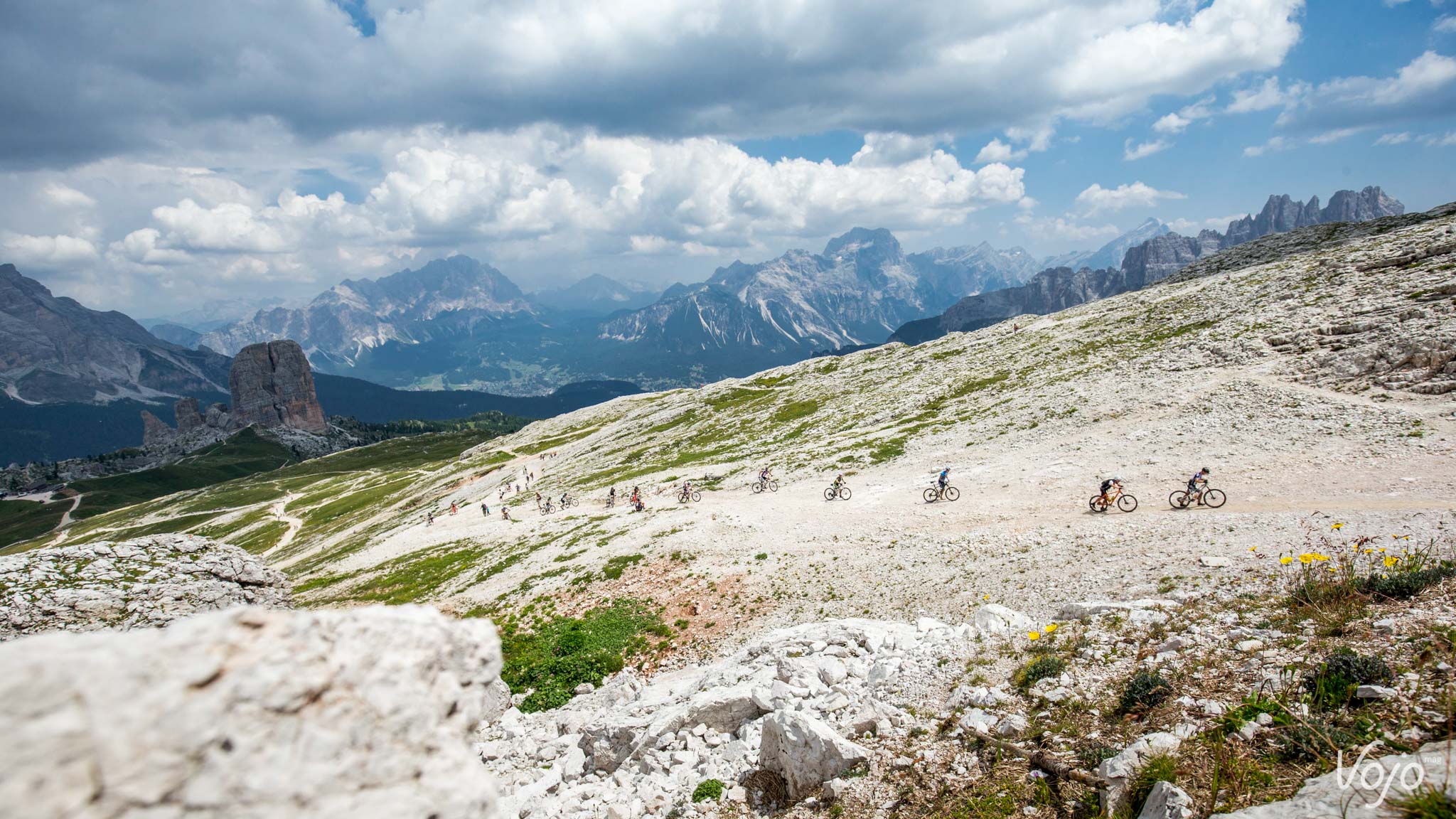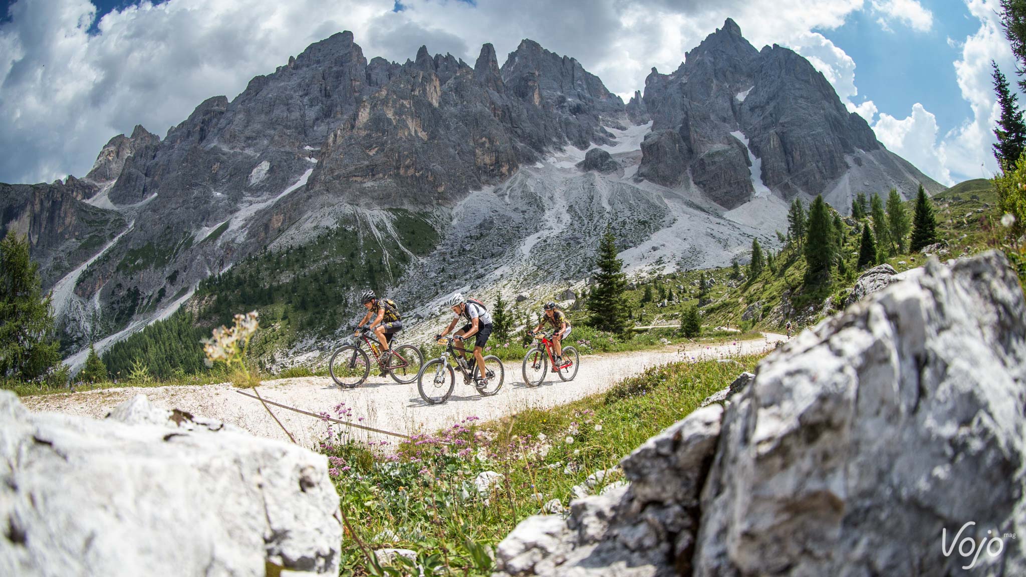 Le départ est à nouveau donné sous un ciel bleu azur. On constate toujours autant de nervosité au sein du peloton dans les 5 premiers kilomètres. Après les deux premières bosses, nous effectuons une brève boucle autour de la petite station d’Innichen avant d’entamer une très longue section en faux plat montant vers le Passo Cimabanche puis vers Cortina d’Ampezzo. Des petits groupes se forment et ça roule très très fort. Cette portion d’environ 30 kilomètres nous semble sans intérêt, surtout lorsqu’on voit de chaque côté du chemin de magnifiques massifs qui sont régulièrement empruntés par des épreuves VTT de renom, tels que le Dolomiti Superbike. Fort heureusement nous avons de quoi nous régaler avec les magnifiques paysages qui s’offrent à nous.