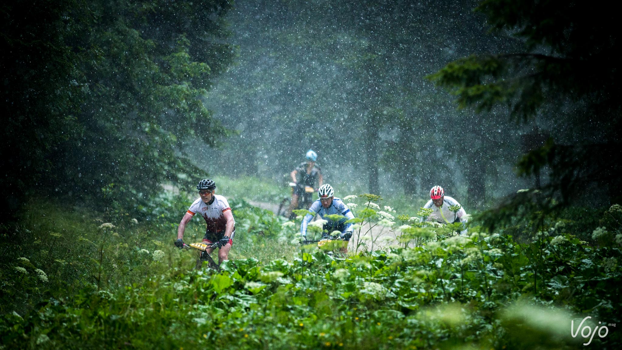 Dans les derniers kilomètres de cette ascension, la pente s’intensifie pour laisser place à une longue descente rendue glissante par une fine pluie. Nous attaquons la section chrono «enduro challenge» sur un singletrack ressemblant de très près à un lit de rivière asséché. La ligne d’arrivée est en vue! Heureusement pour nous car quelques minutes après notre arrivée éclate un très violent orage.