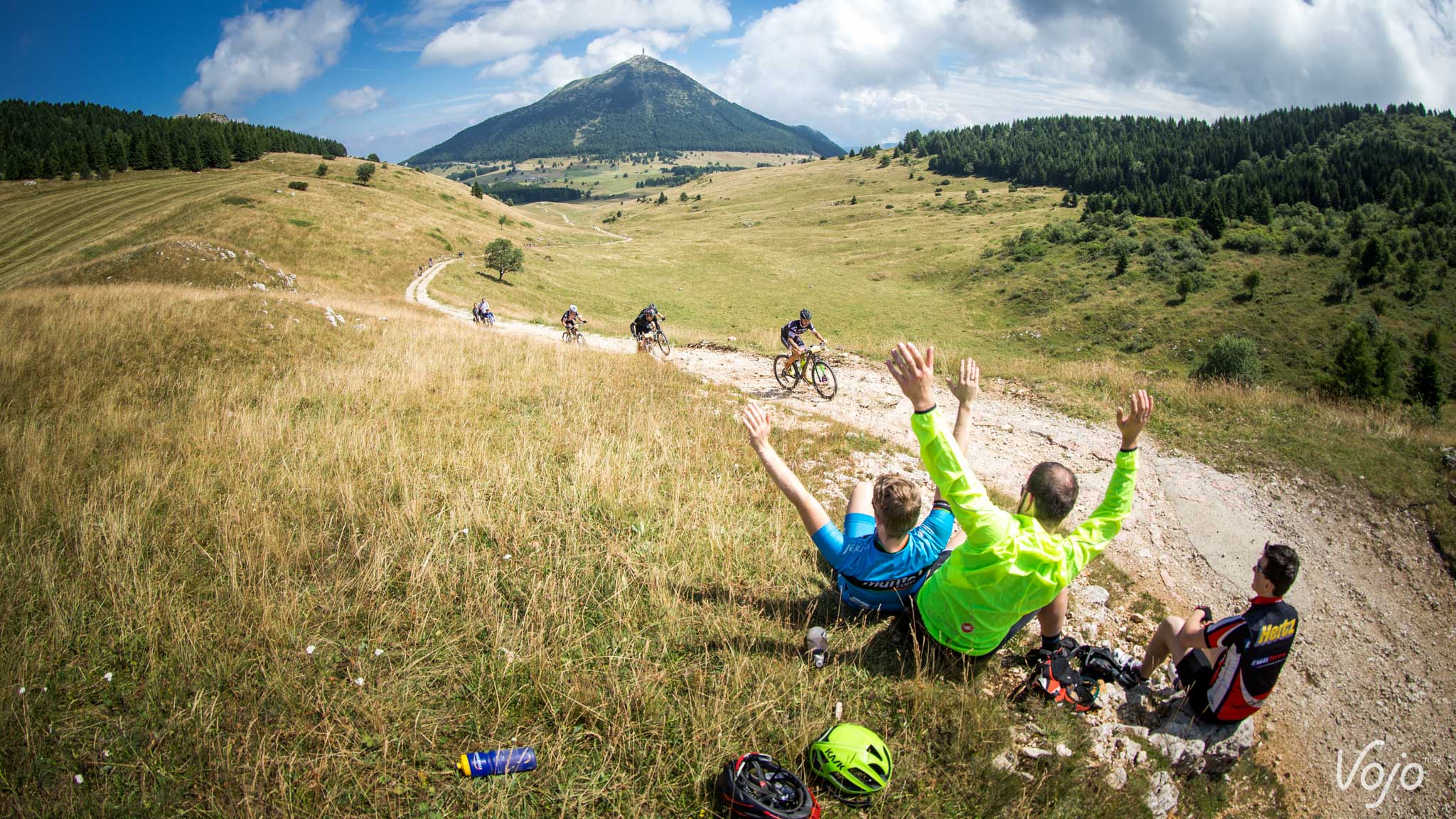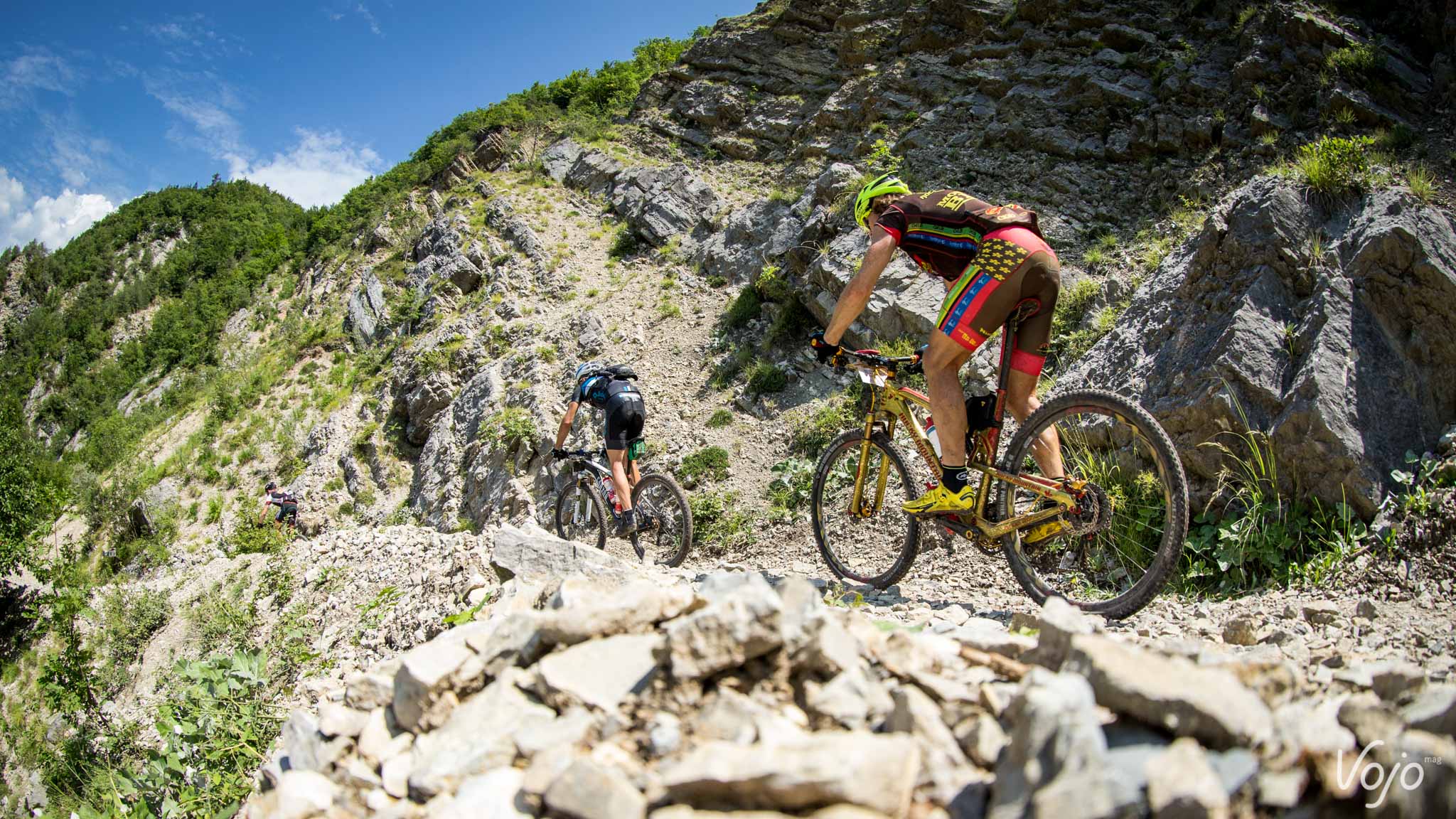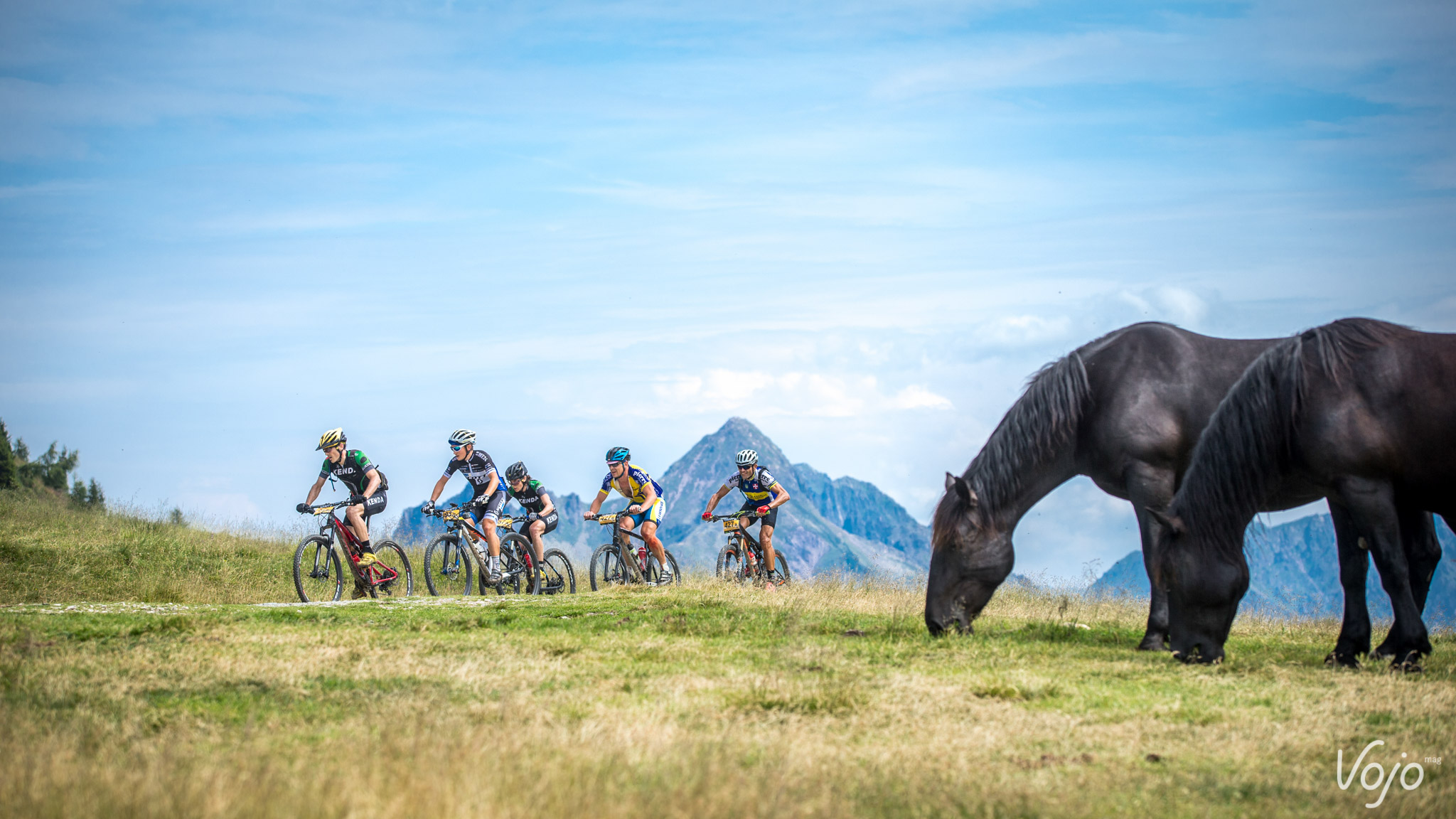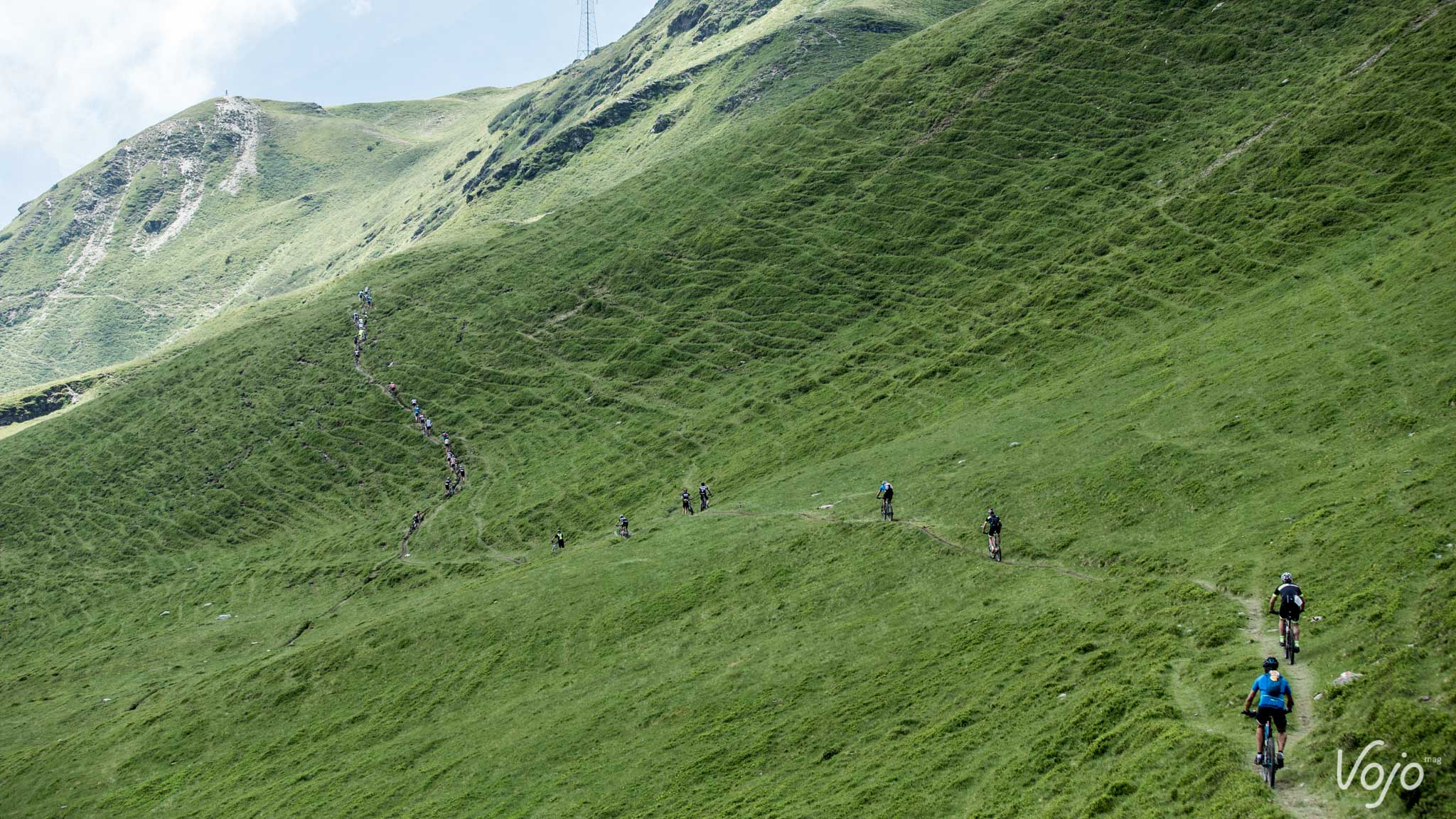 Sur cette photo, n’y a-t-il pas quelque chose qui vous interpèle? Ce maillot blanc à pois rouges peut-être?! Sur chaque étape, l’organisation récompense le «meilleur grimpeur» via le challenge «Vertikal Ride», une montée chronométrée au pourcentage parfois vertigineux. L’organisation récompense également les meilleurs descendeurs avec «l’enduro challenge». Tout comme pour le «Vertikal Ride», il y en a pour tous les goûts, de la piste roulante très rapide au single-track technique et très pentu!