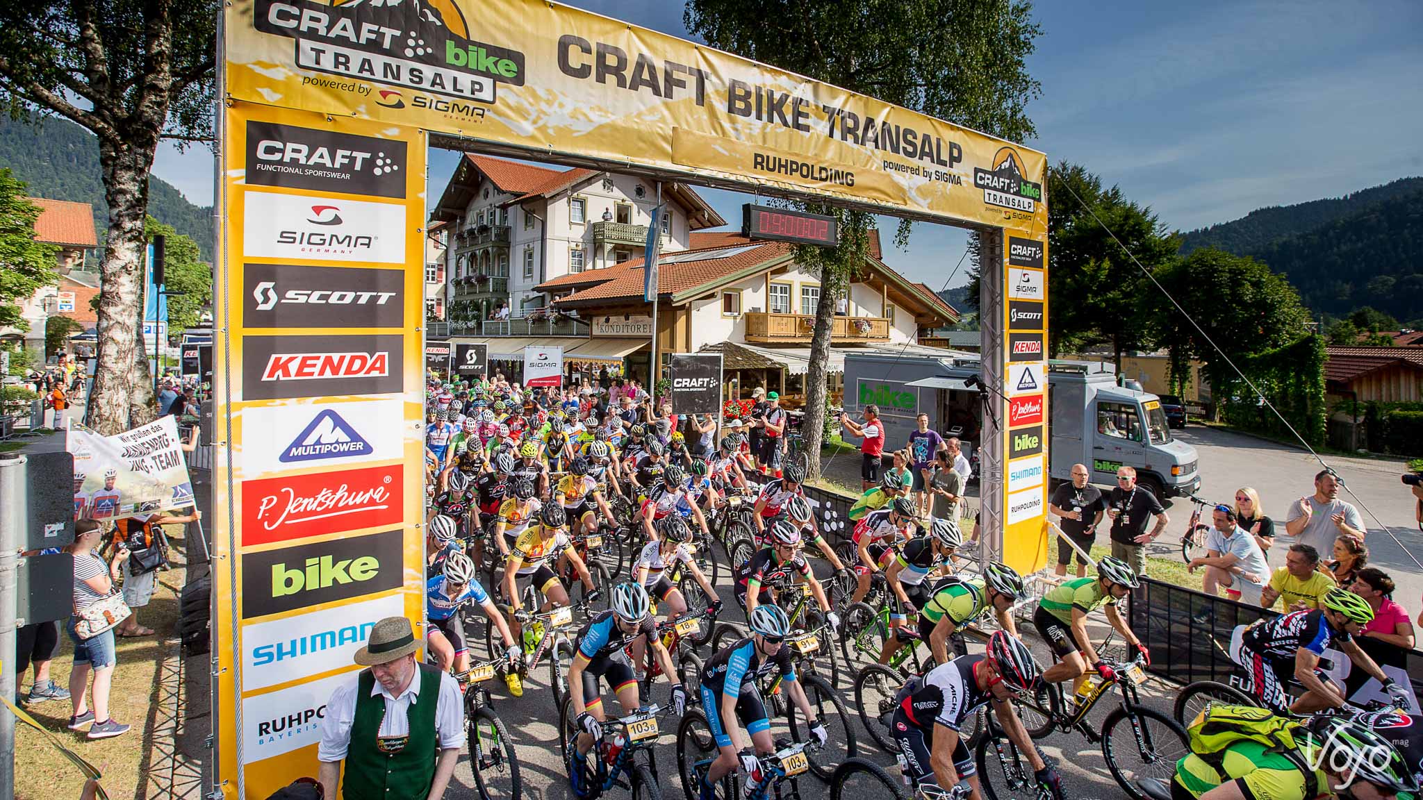 Pour cette 18ème édition, c’est la petite ville de Ruhpolding qui a été désignée pour accueillir le grand départ de ce Transalp 2015. Cette station bavaroise est avant tout mondialement connue pour y accueillir chaque hiver une manche de coupe du monde de biathlon. Notre duo s’était donné rendez-vous à la veille du grand départ. Nous ne perdons pas de temps et allons récupérer nos accréditations ainsi que nos sacs remplis de petits cadeaux et d’informations en tout genre. Parmi celles-ci, un road-book très bien conçu, nous indiquant le déroulement de chacune des 7 étapes.