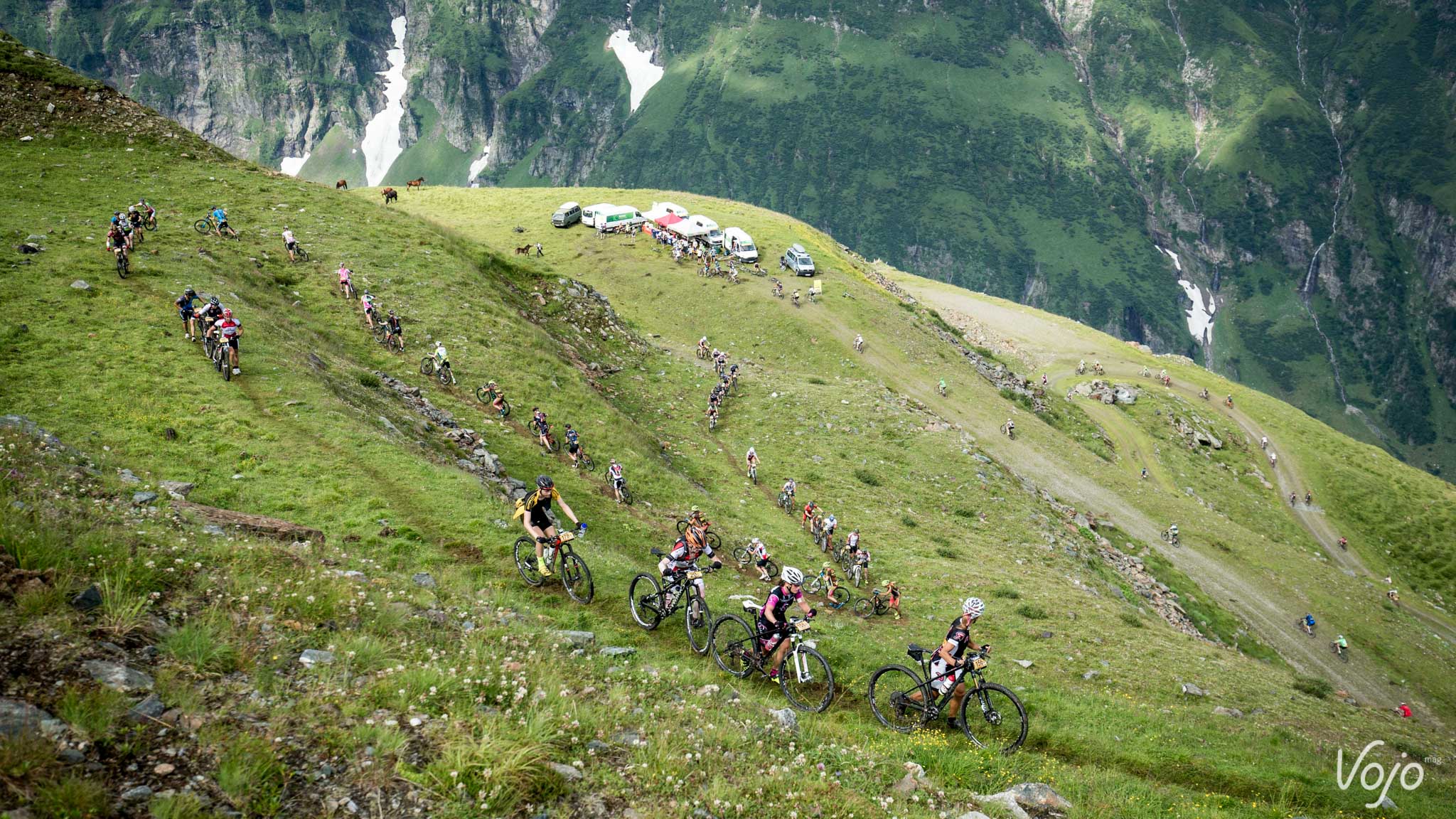 D’entrée nous attaquons l’ascension du Tauernkreuz. Après 18 kilomètres de montée roulante, la route et les pistes cèdent place à un sentier de haute montagne très escarpé qui, par moment, nous oblige à pousser nos vélos. Nous bénéficions d’une vue vertigineuse sur un cirque montagneux. Dans la dernière section, la trace se transforme en petit mur d’escalade et il n’est pas toujours évident de grimper avec nos chaussure aux semelles hyper rigides. Nous apprendrons le soir même que les équipages pro jouant le top 5 ont pu échanger leurs chaussures pour des chaussures de randonnée facilitant la marche ! Après un bref passage dans une névé, nous arrivons enfin au sommet, il nous aura fallu pas moins de 2h30 pour parcourir les 25 premiers kilomètres. C’est maintenant une longue descente vers la vallée qui s’offre à nous.