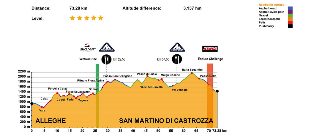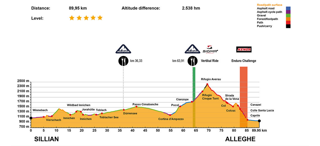 L’étape du jour nous propose un tracé de 90 km et de 2500 m de dénivelé positif. Nous commencerons par deux bosses avant de descendre vers la ville de Cortina d’Ampezzo. Nous enchainerons ensuite avec la grosse difficulté du jour : le Rifugio Averau! Il faudra le mériter…