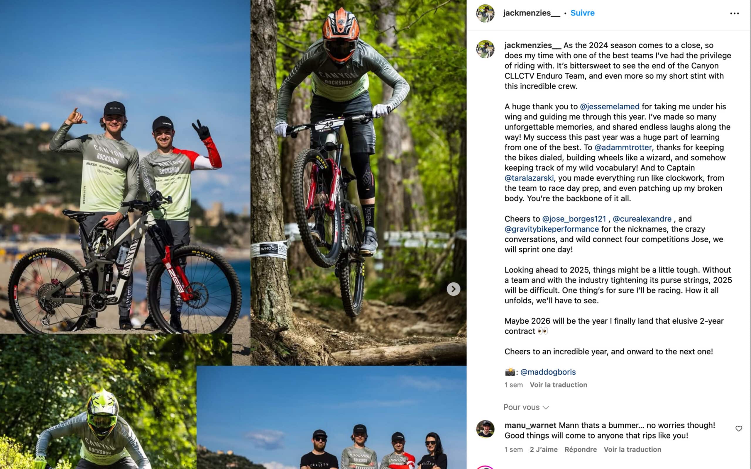 Si Canyon n’a pas encore communiqué officiellement sur l’avenir de son équipe Enduro (Canyon CLLCTV Enduro), c’est par le biais du pilote Jack Menzies que l’on comprend que la structure ne rempile pas pour la saison 2025. Il semblerait que la marque allemande rassemble ses efforts en limitant les effectifs afin d’être présente sur la scène Gravity la saison prochaine. Son coéquipier Jesse Melamed n’a pas encore dévoilé ses plans pour la saison prochaine, lui qui avait terminé sa saison sur une blessure lors de la manche de coupe du monde de descente de Mont-Sainte-Anne.