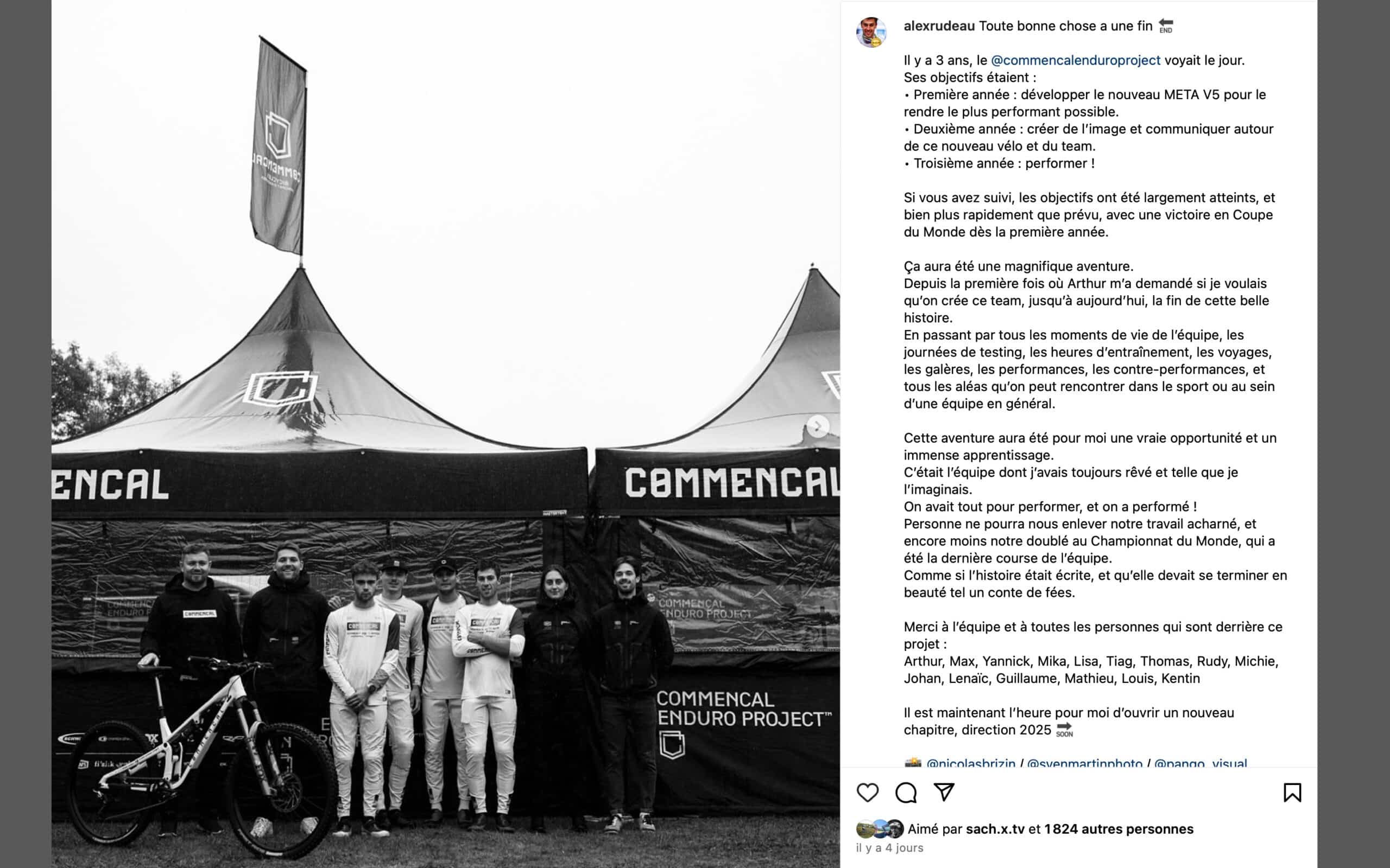 Finir sur un doublé lors des premiers championnats du monde de la discipline (cf.Championnats du monde Enduro 2024 : la France, maître du monde), un joli clap de fin pour le Commencal Enduro Project qui a annoncé la fin de son aventure pour 2025. Où va-t-on retrouver Alex Rudeau, Guillaume Larbeyou, Louis Jeandel et Mathieu Ruffray la saison prochaine ?