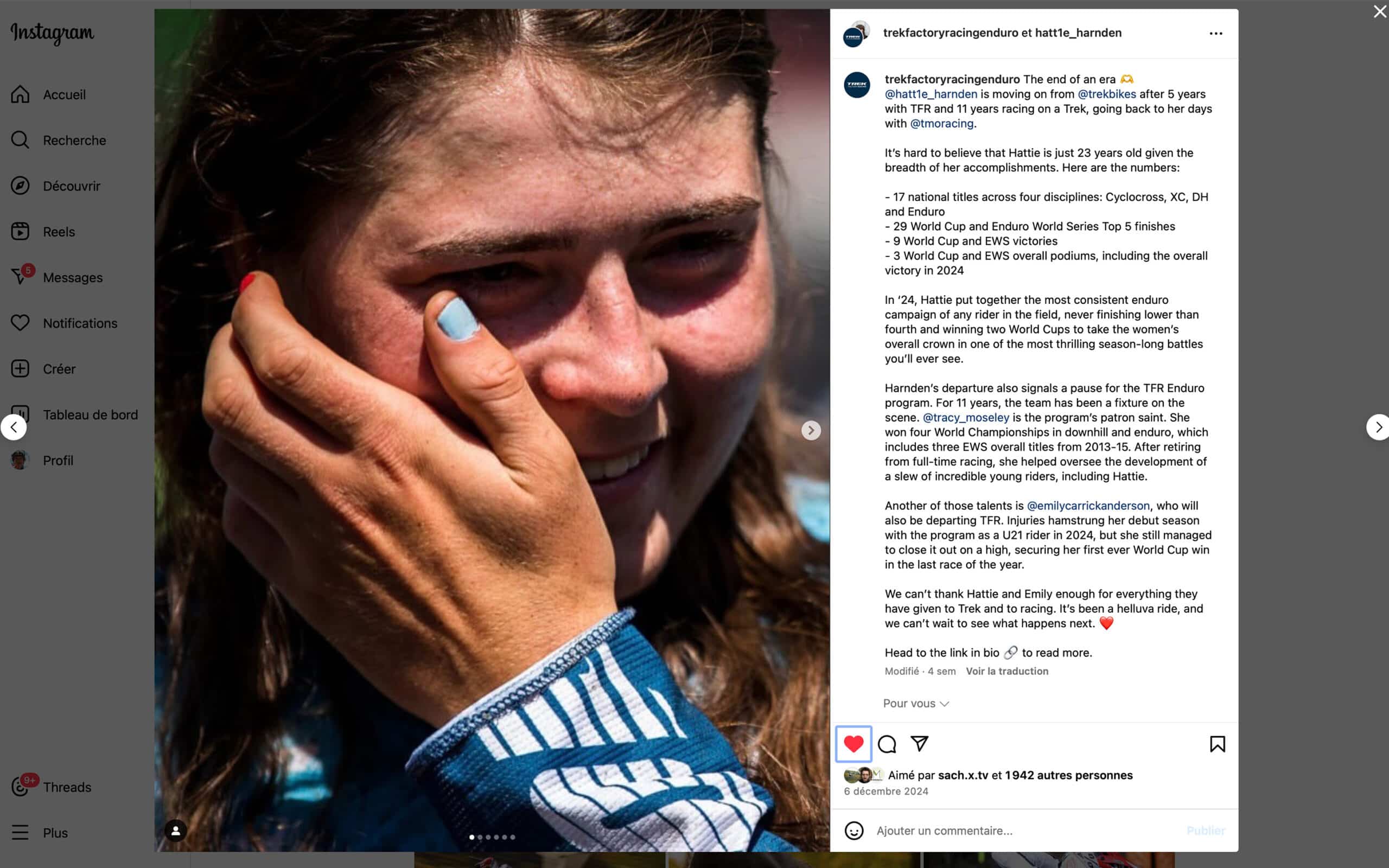 Après 11 années à s’aligner sur les compétitions au guidon d’un Trek (dont 5 années avec le Trek Factory Racing), Harriet Harnden changera de couleurs pour 2025 suite à l’arrêt de la structure. « Le départ de Harriet Harnden marque également une pause dans le programme Enduro de Trek Factory Racing », ajoute en effet la marque dans son post sur les réseaux sociaux. Voilà qui a pour conséquence de forcer Emily Carrick-Anderson à trouver de nouvelles couleurs également pour la saison prochaine.