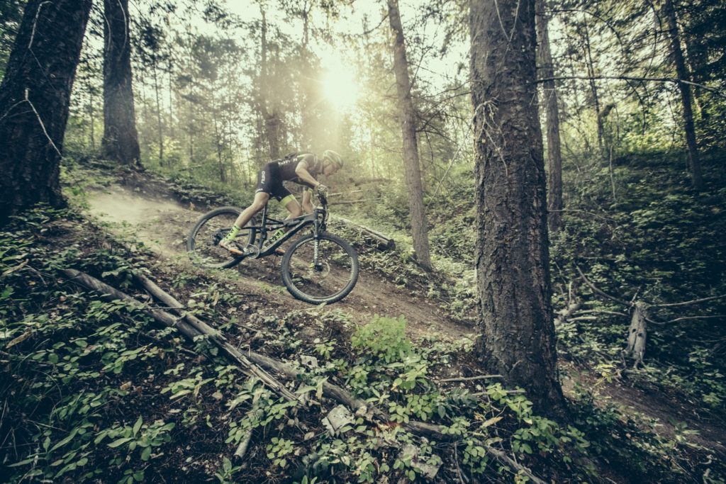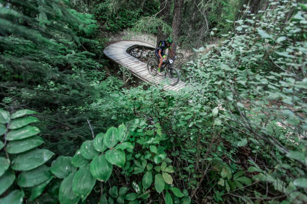 Début des festivités rime également avec début de la « Timed Descend ». Nous reprenons les pistes existantes du bikepark, et ça ne traine pas du tout. Tout s’enchaine dans un gros rythme et cela en devient très physique avec nos « petits vélos ». 1000m et 20 minutes plus bas, nous allons chercher une petite boucle sur le secteur Moonrakers, un passage remarquable par le Canyon Creek, et retour vers la station de Kicking Horse via un monotrace plus régulier, nous permettant de rallier l’arrivée sans encombre.